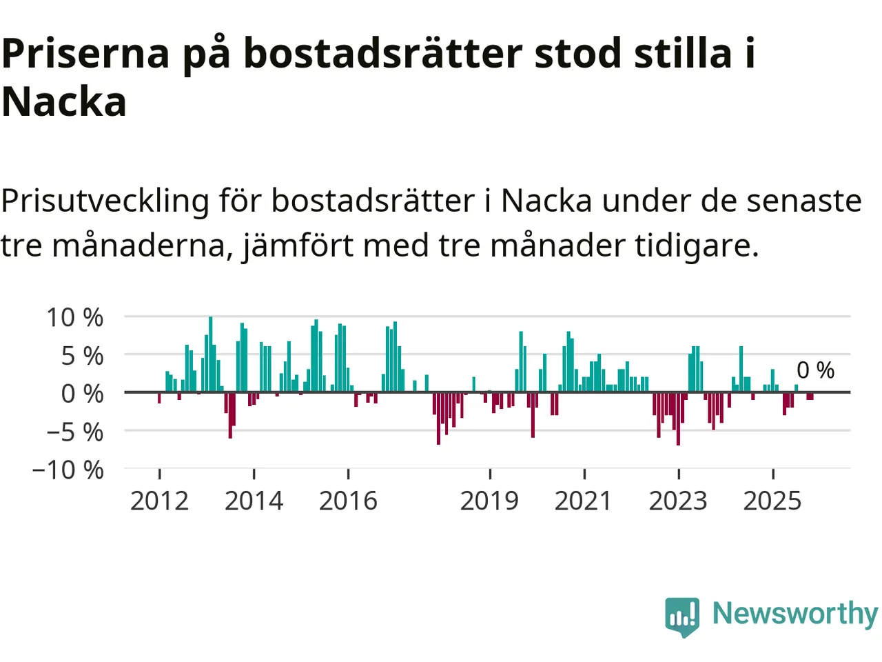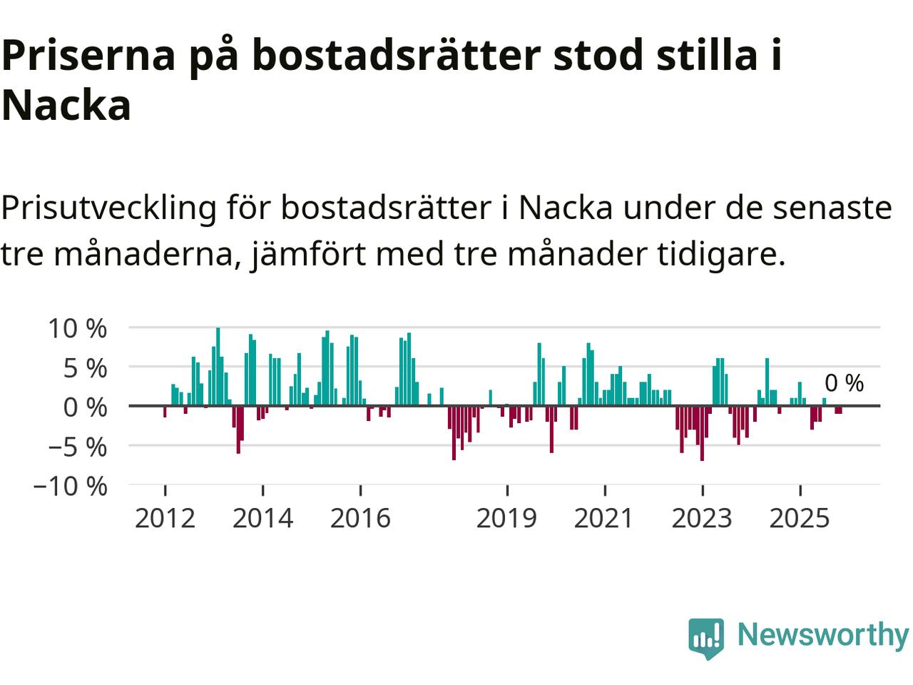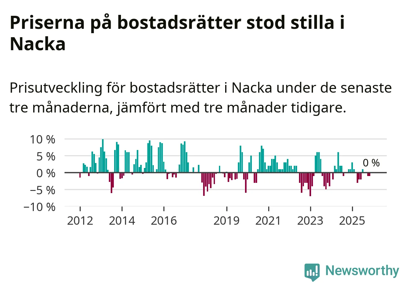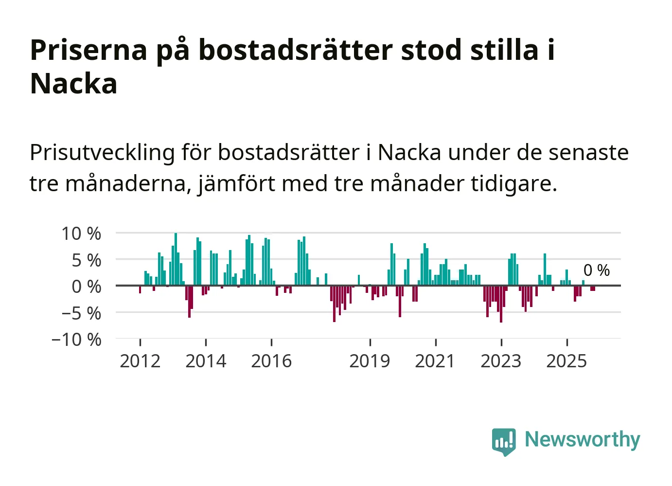 Priserna på bostadsrätter står i stort sett stilla i Nacka kommun. Medelpriset på de på försäljningarna under de senaste tre månaderna låg på samma nivå som för tre månader sedan.