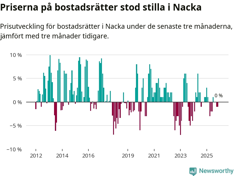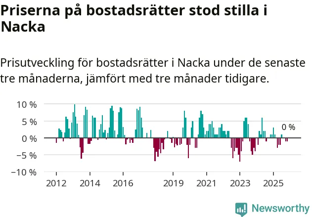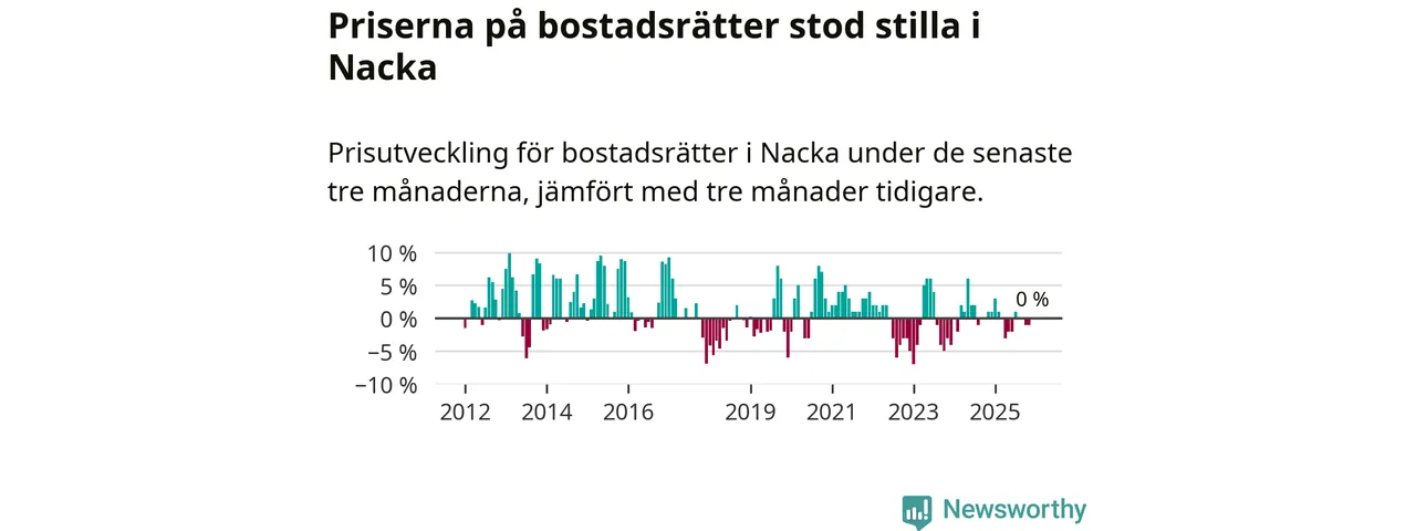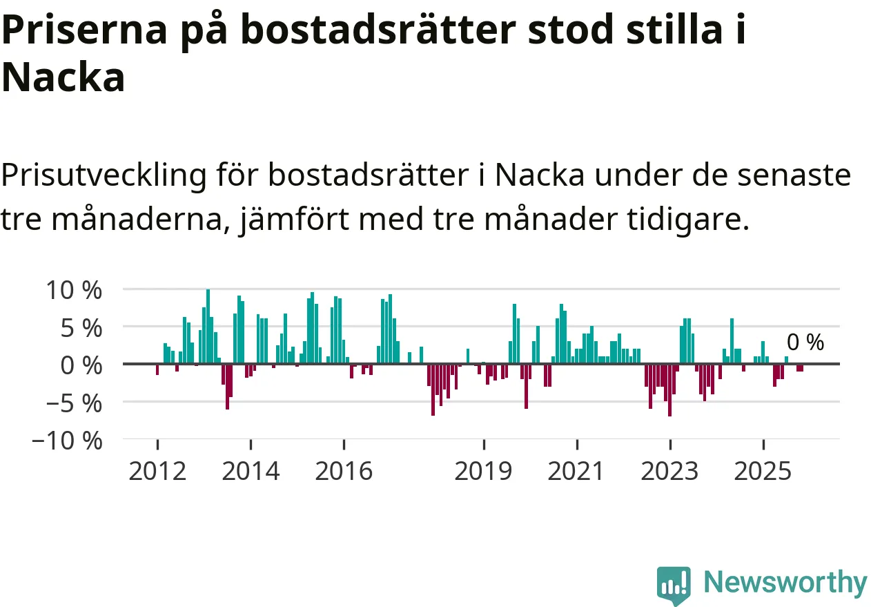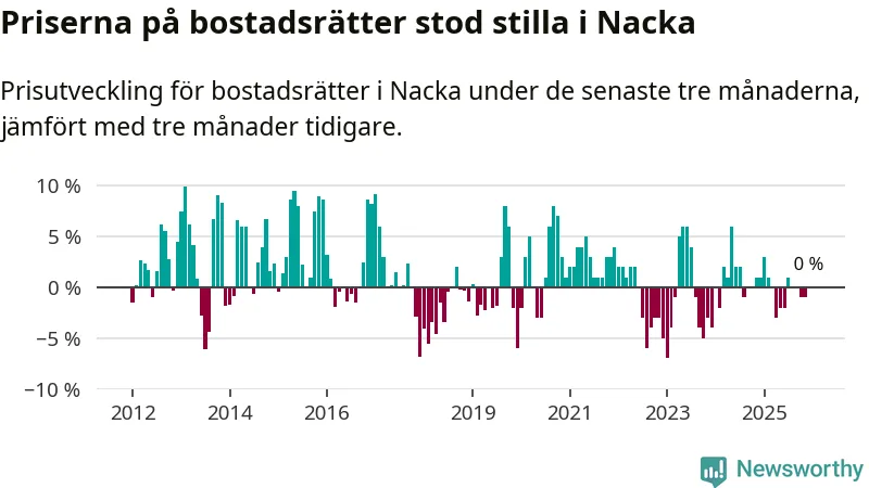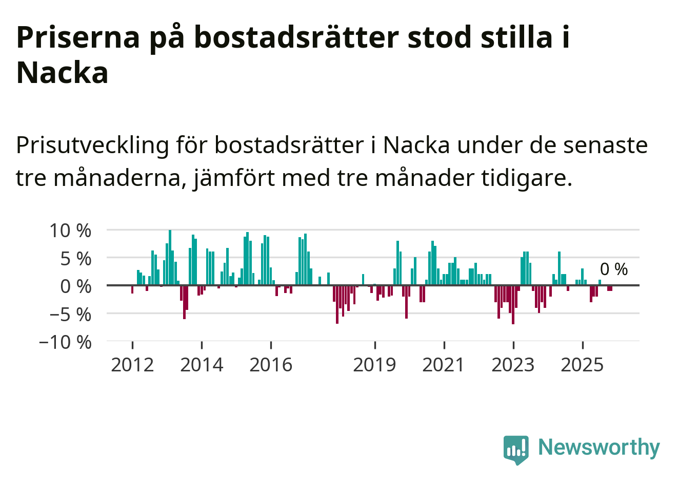 Priserna på bostadsrätter står i stort sett stilla i Nacka kommun. Medelpriset på de på försäljningarna under de senaste tre månaderna låg på samma nivå som för tre månader sedan.