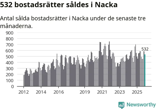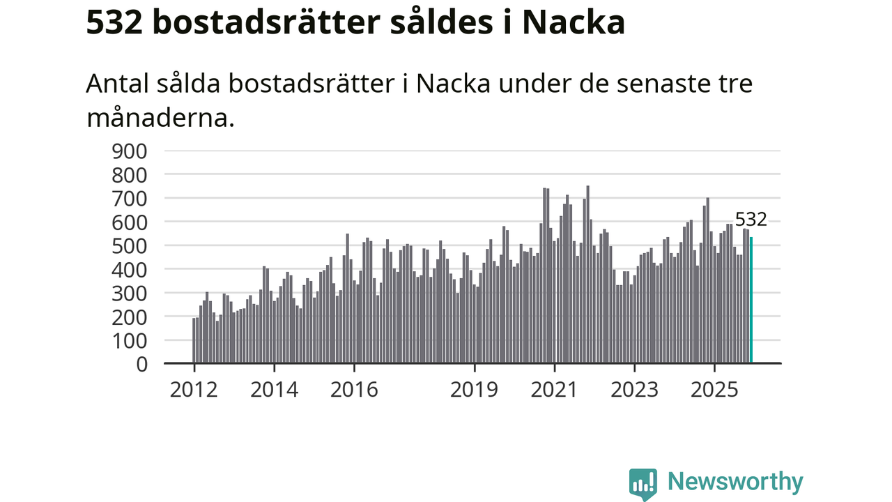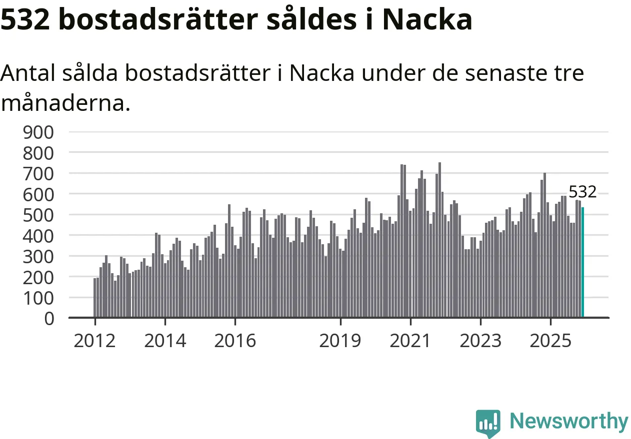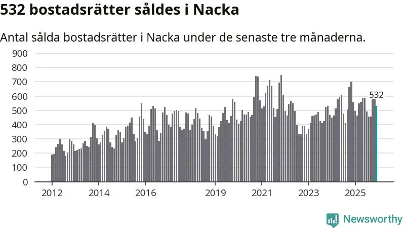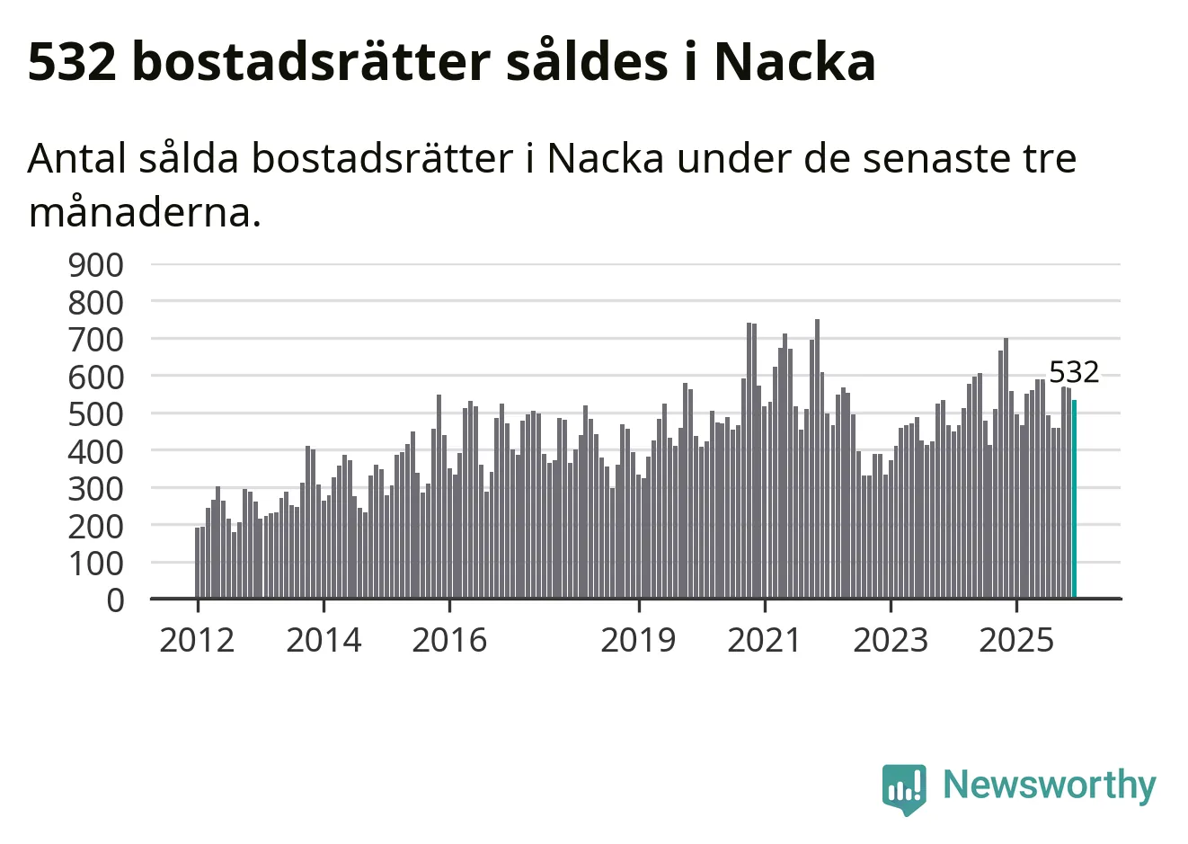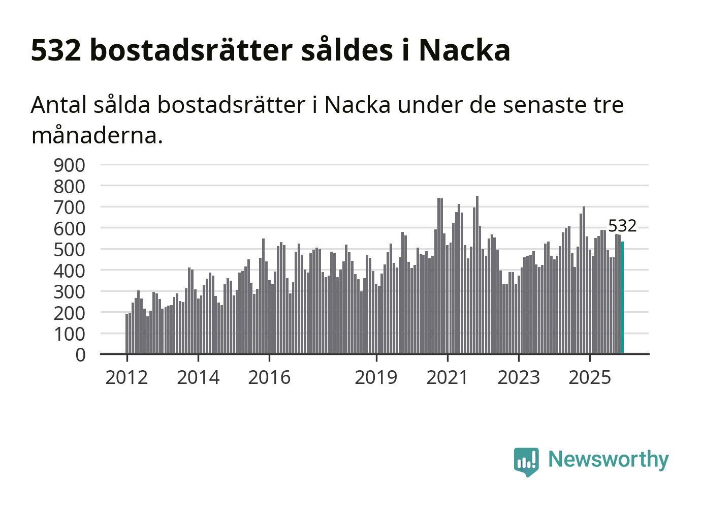 Sammanlagt såldes 532 bostadsrätter i Nacka kommun mellan oktober och december till ett genomsnittligt pris på 4,2 miljoner kronor. I fjol gjordes 557 affärer vid den här tiden på året.