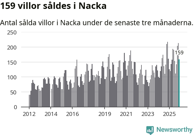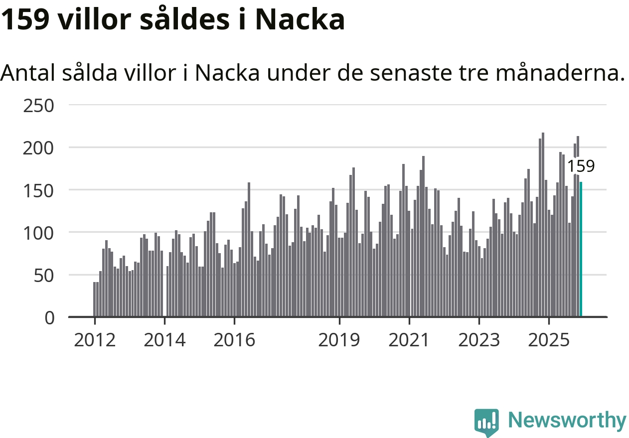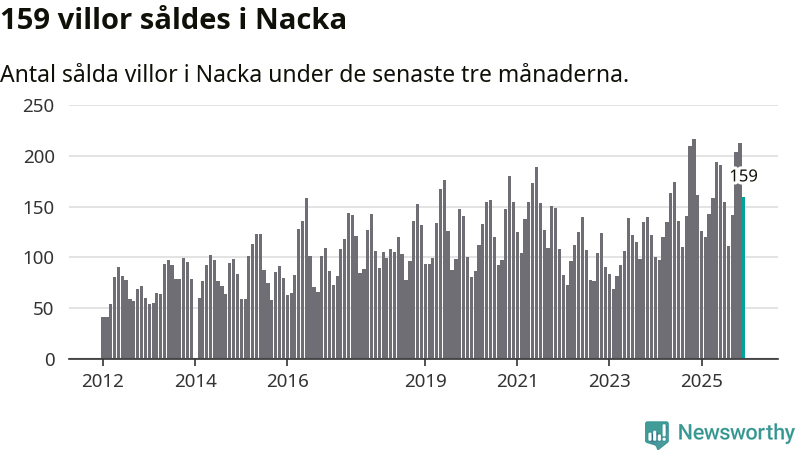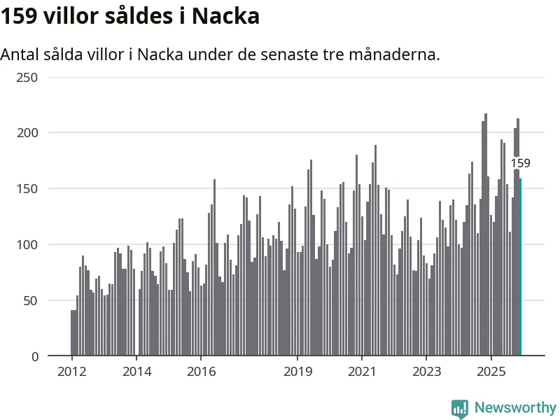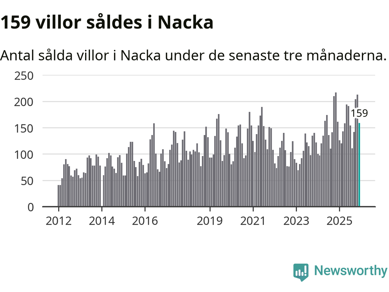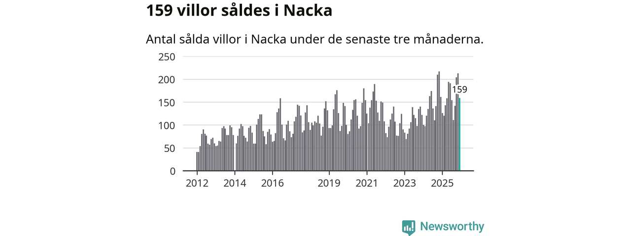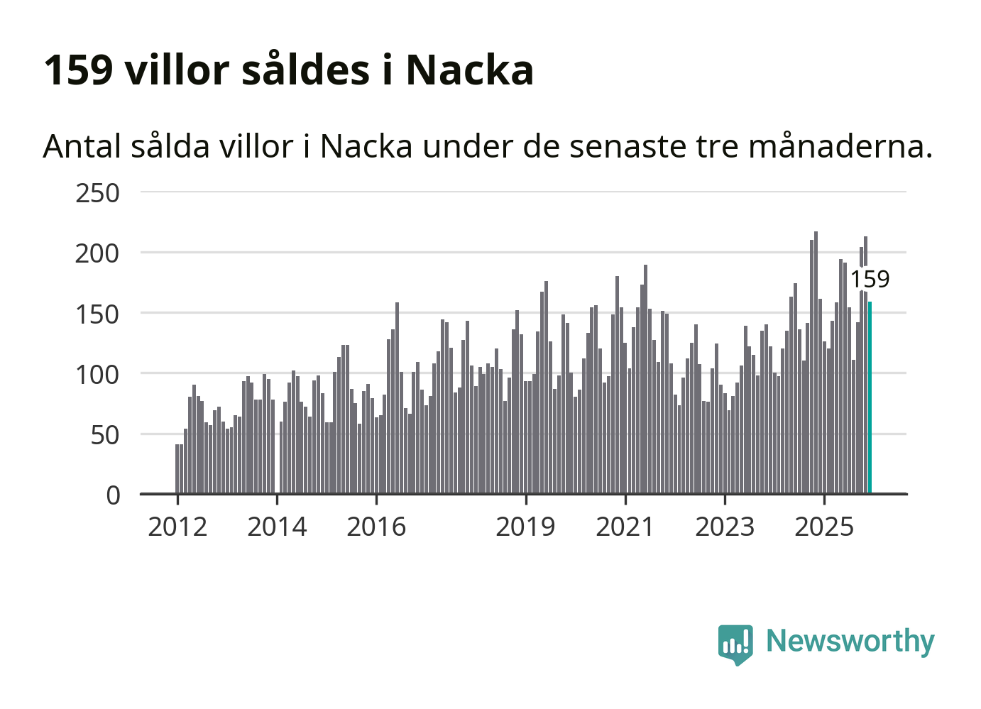 Sammanlagt såldes 159 villor i Nacka kommun mellan oktober och december till ett genomsnittligt pris på 10,6 miljoner kronor. I fjol gjordes 161 affärer vid den här tiden på året.