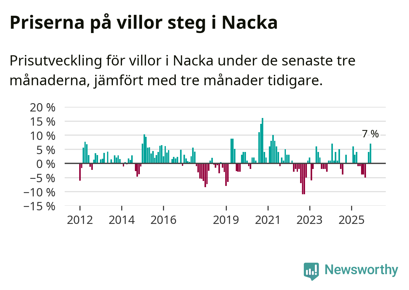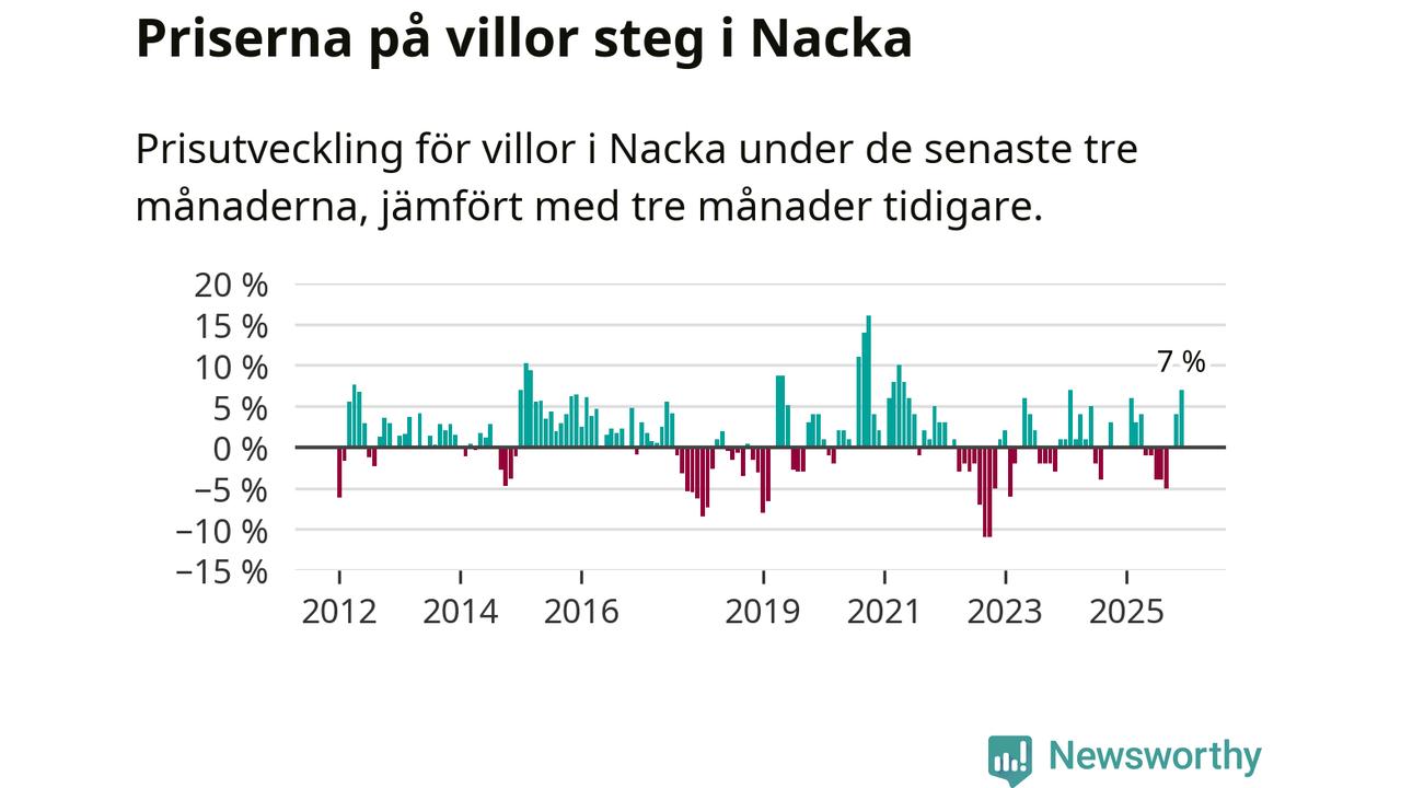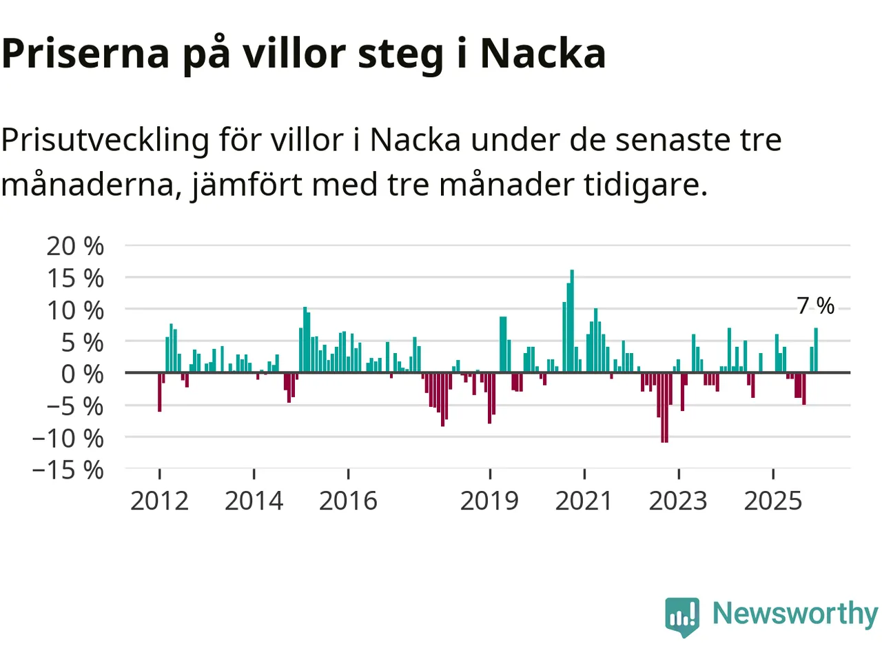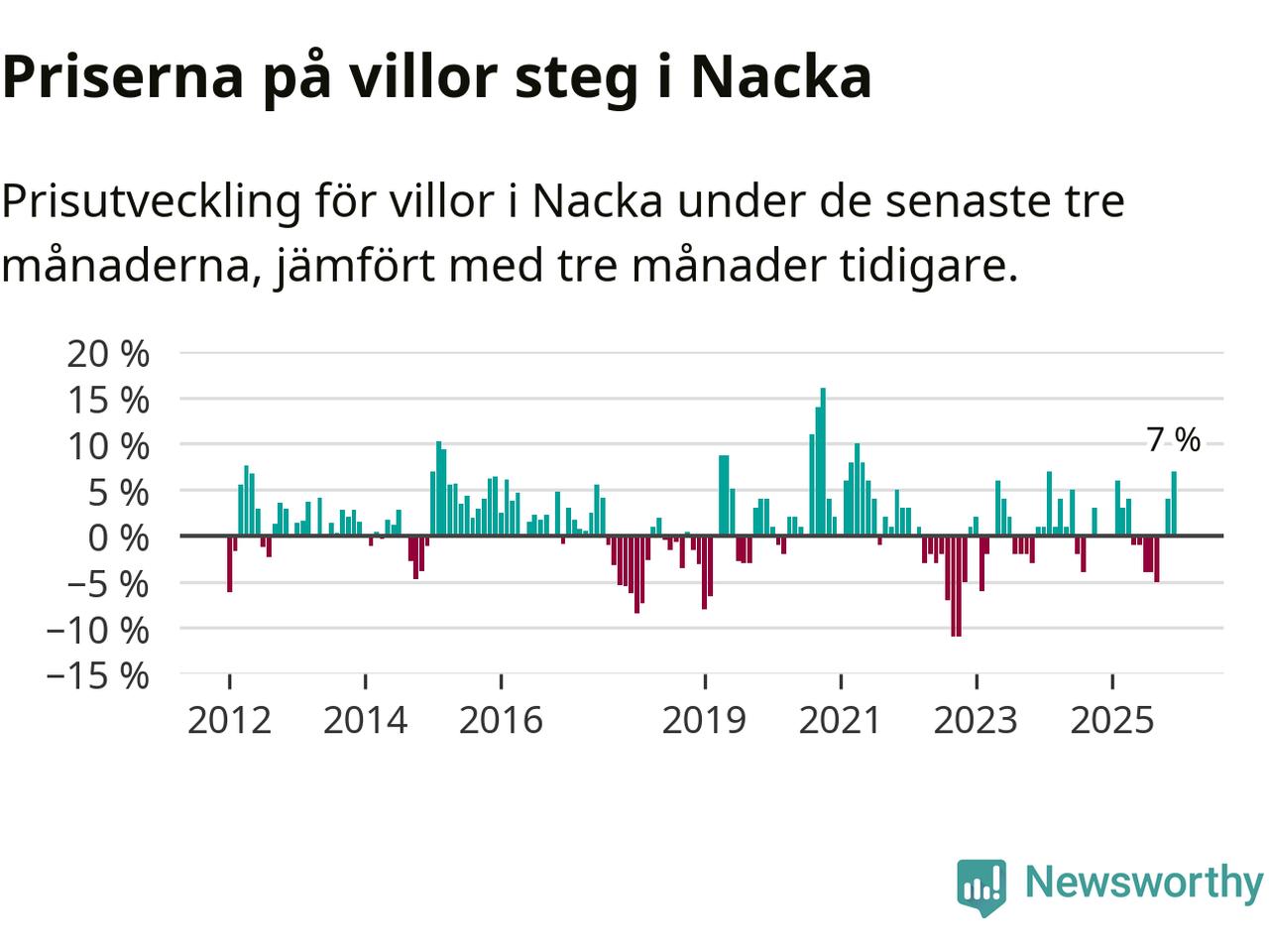 Villapriserna steg mellan oktober och december med 7 procent i Nacka kommun. Det är en betydande uppgång jämfört med det gångna året då priserna i snitt ökat med 1 procent.