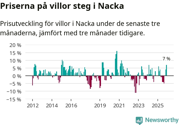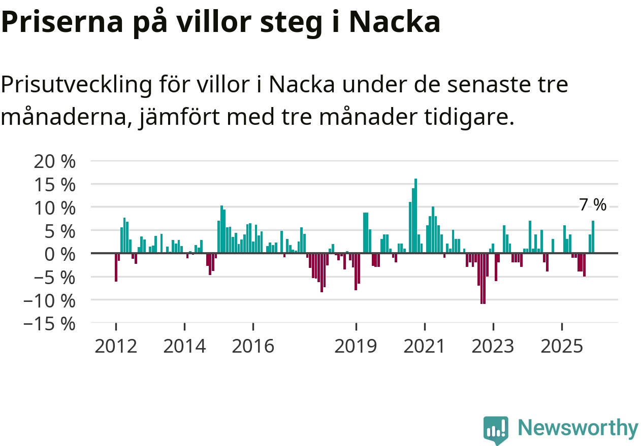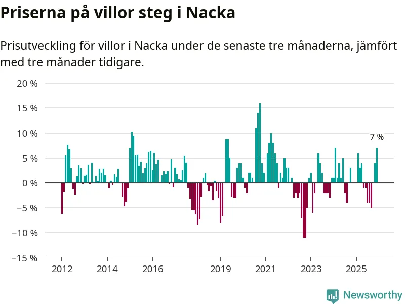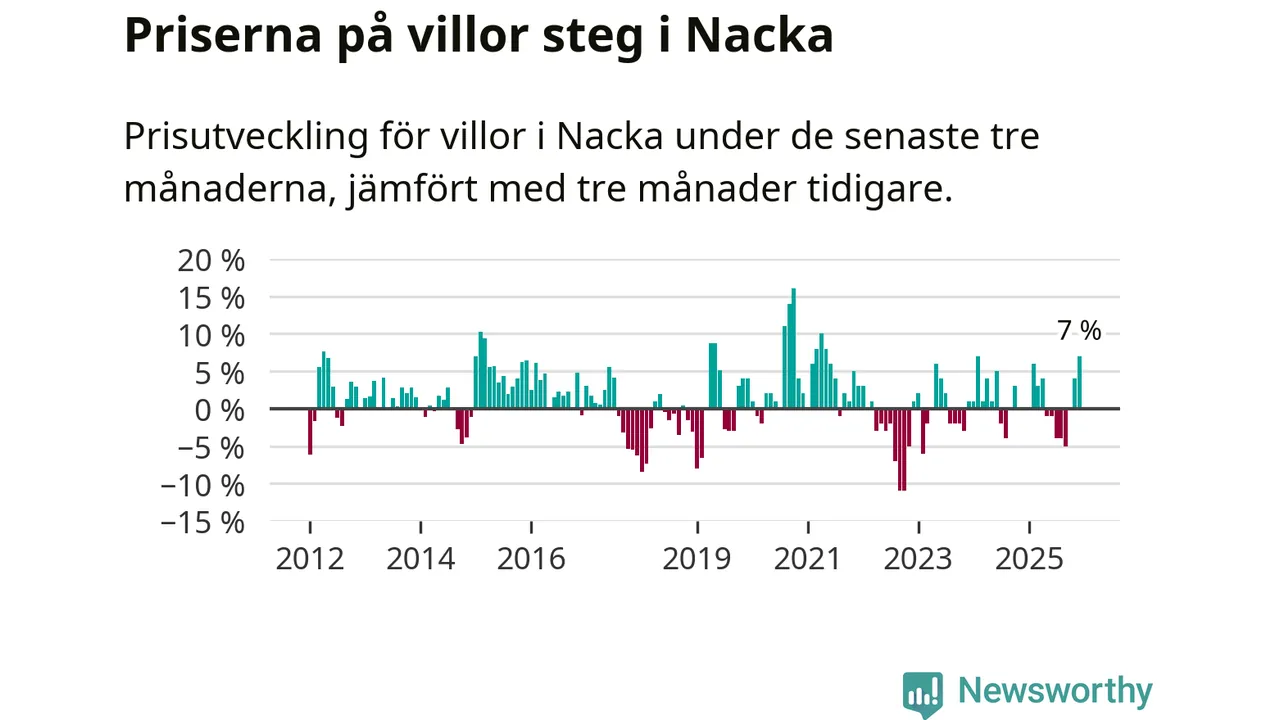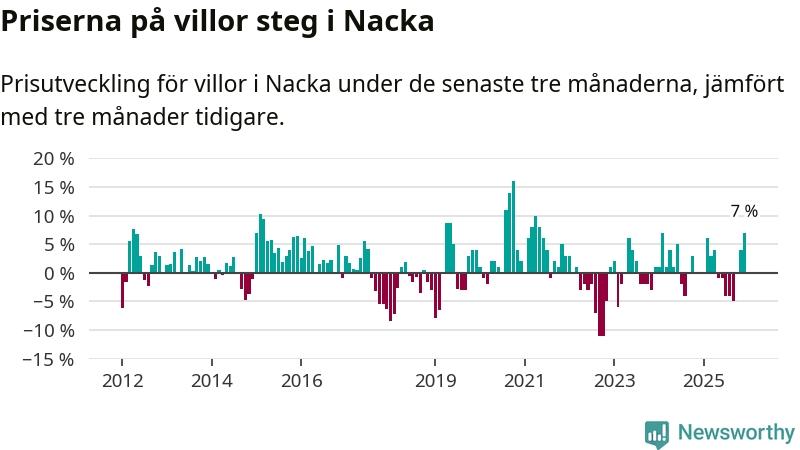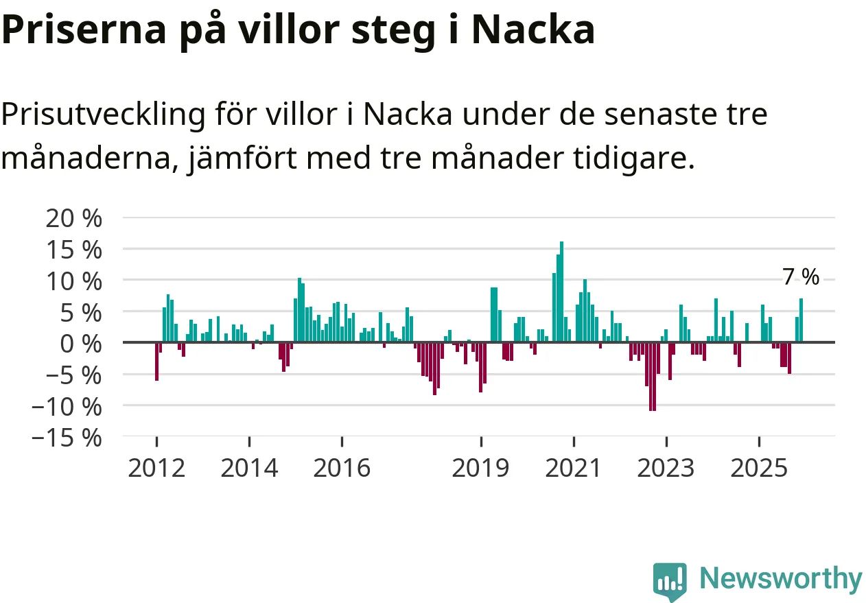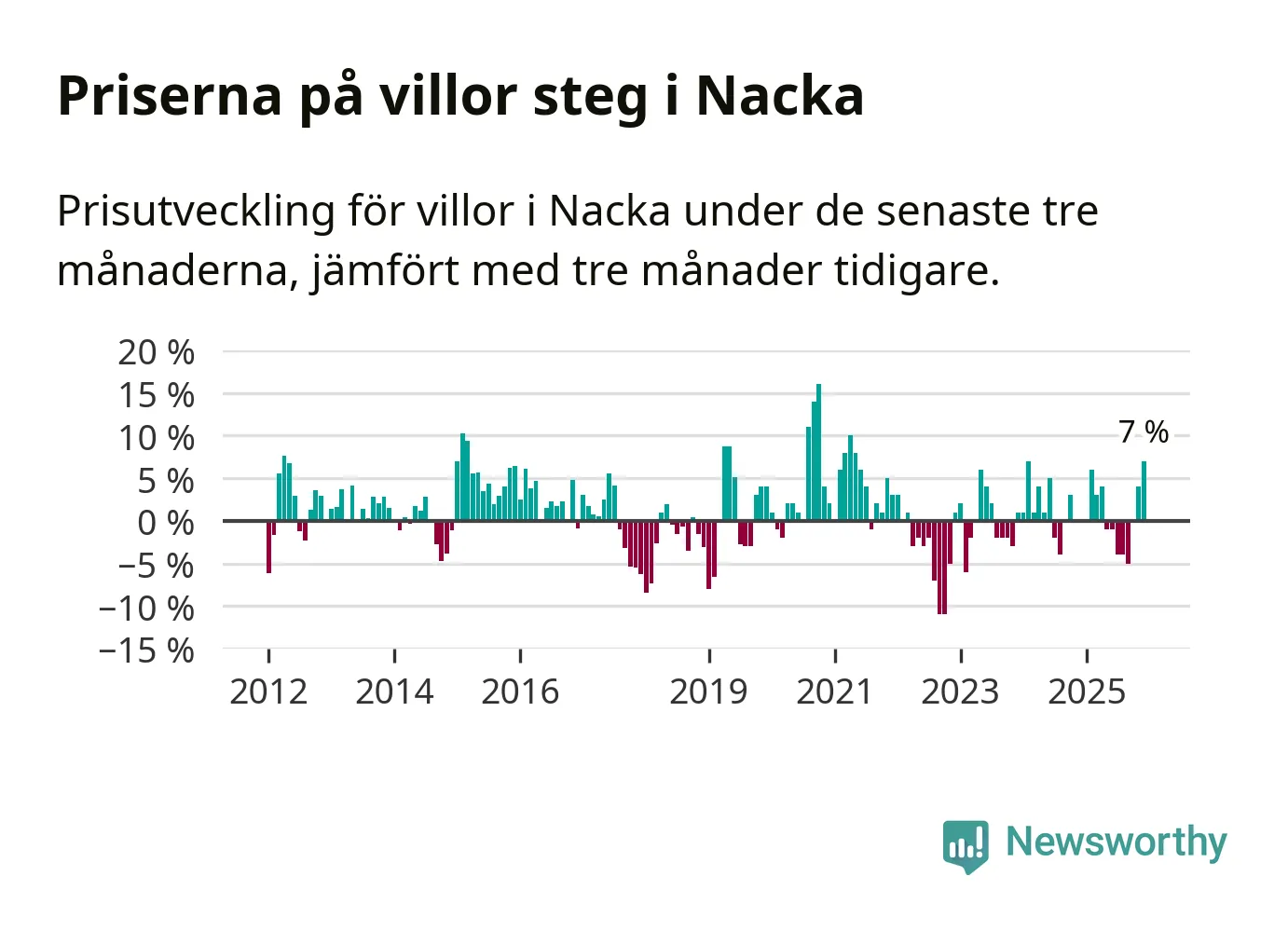 Villapriserna steg mellan oktober och december med 7 procent i Nacka kommun. Det är en betydande uppgång jämfört med det gångna året då priserna i snitt ökat med 1 procent.