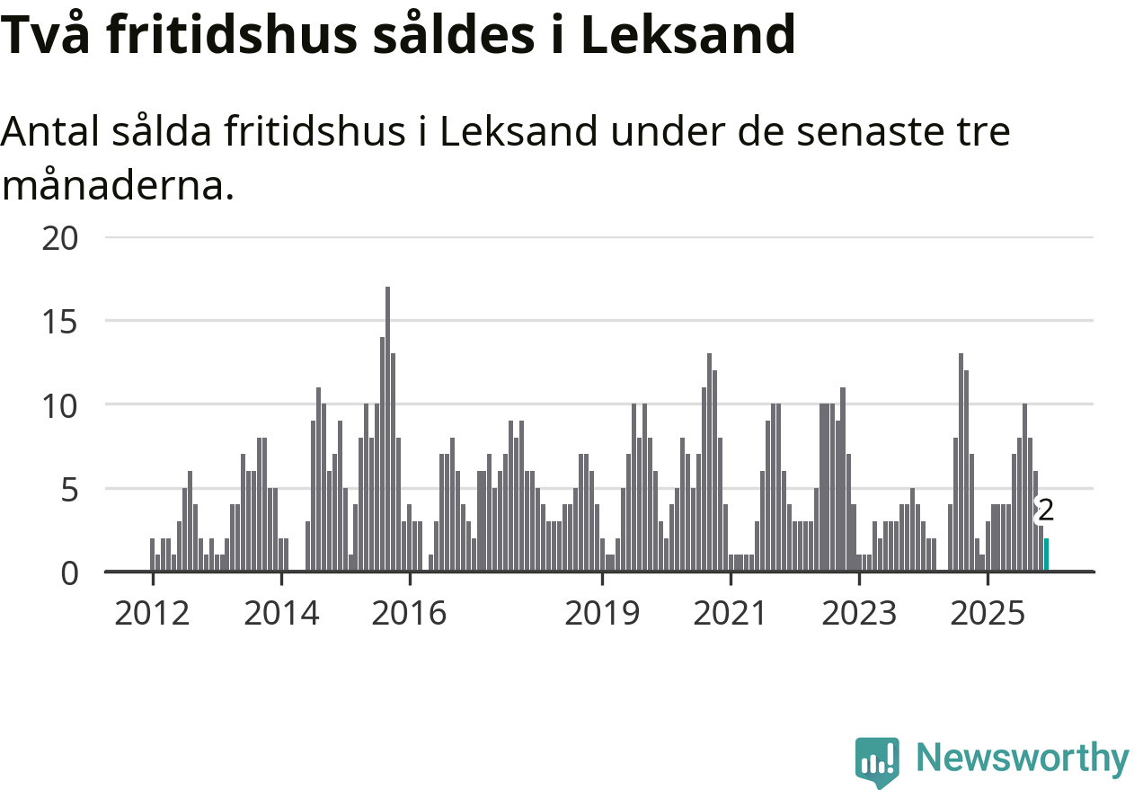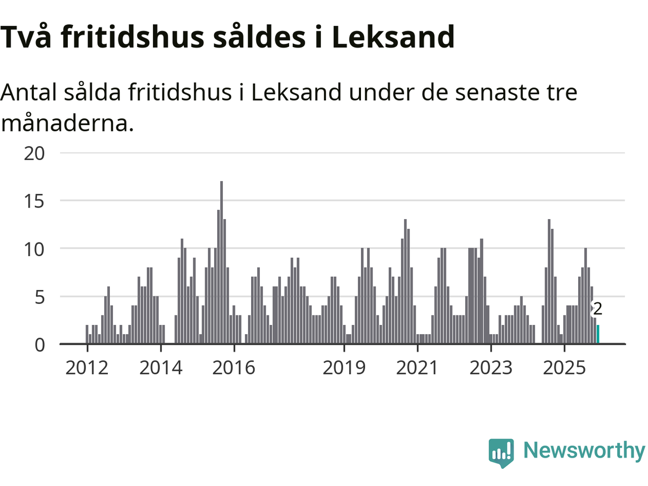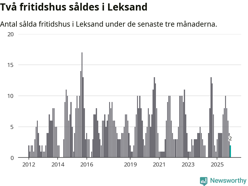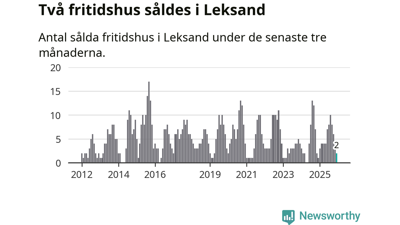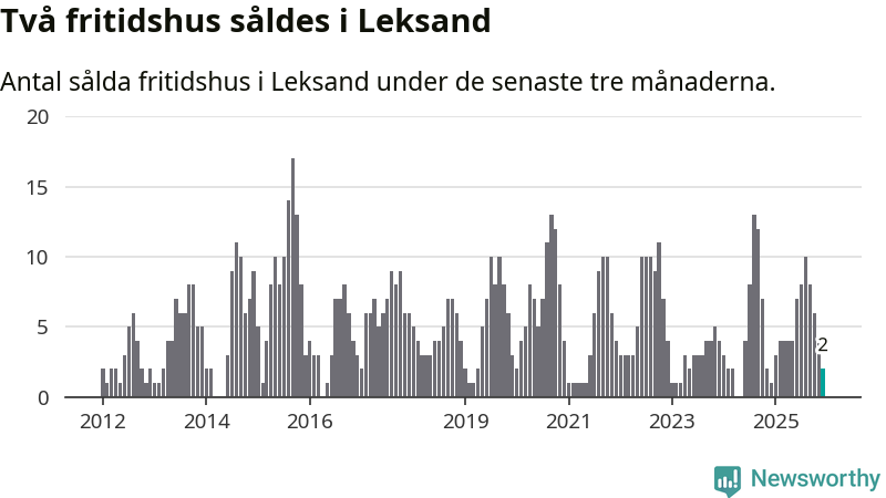 Mellan oktober och december gjordes sammanlagt två affärer med fritidshus i Leksands kommun. Det kan jämföras med ett vid motsvarande tid i fjol.