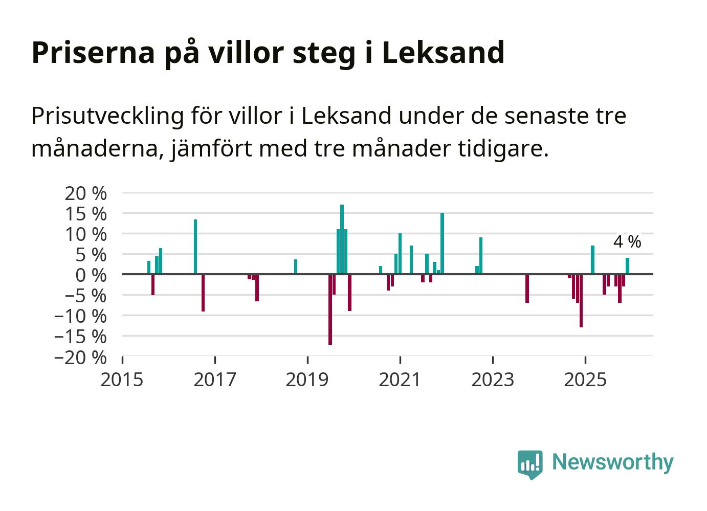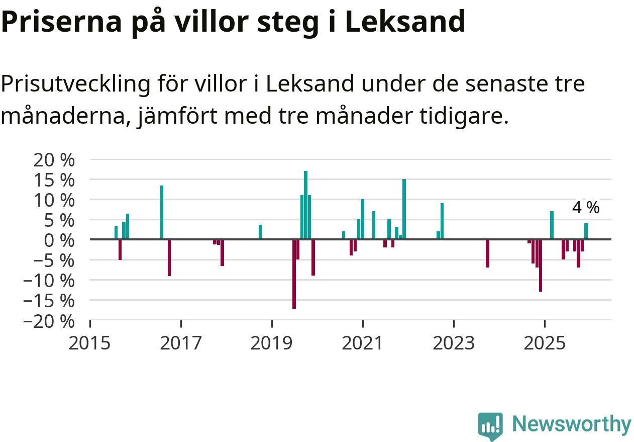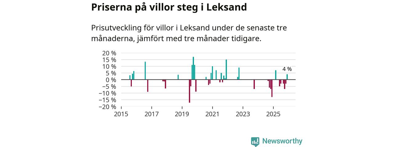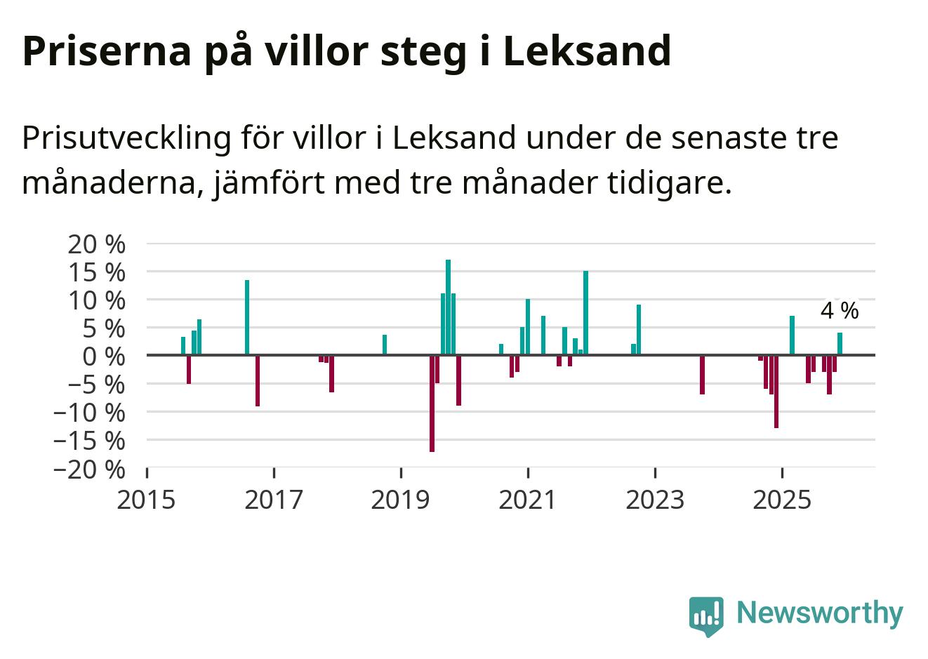 Statistiken visar även på en kännbar prisuppgång i Leksands kommun. Medelpriset på försäljningarna av villor i kommunen var 4 procent högre än för tre månader sedan. I hela Dalarna däremot sjunker villapriserna. I hela länet noterades en prisnedgång på 3 procent.