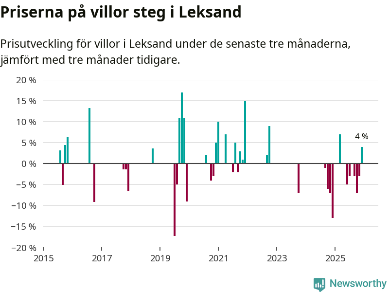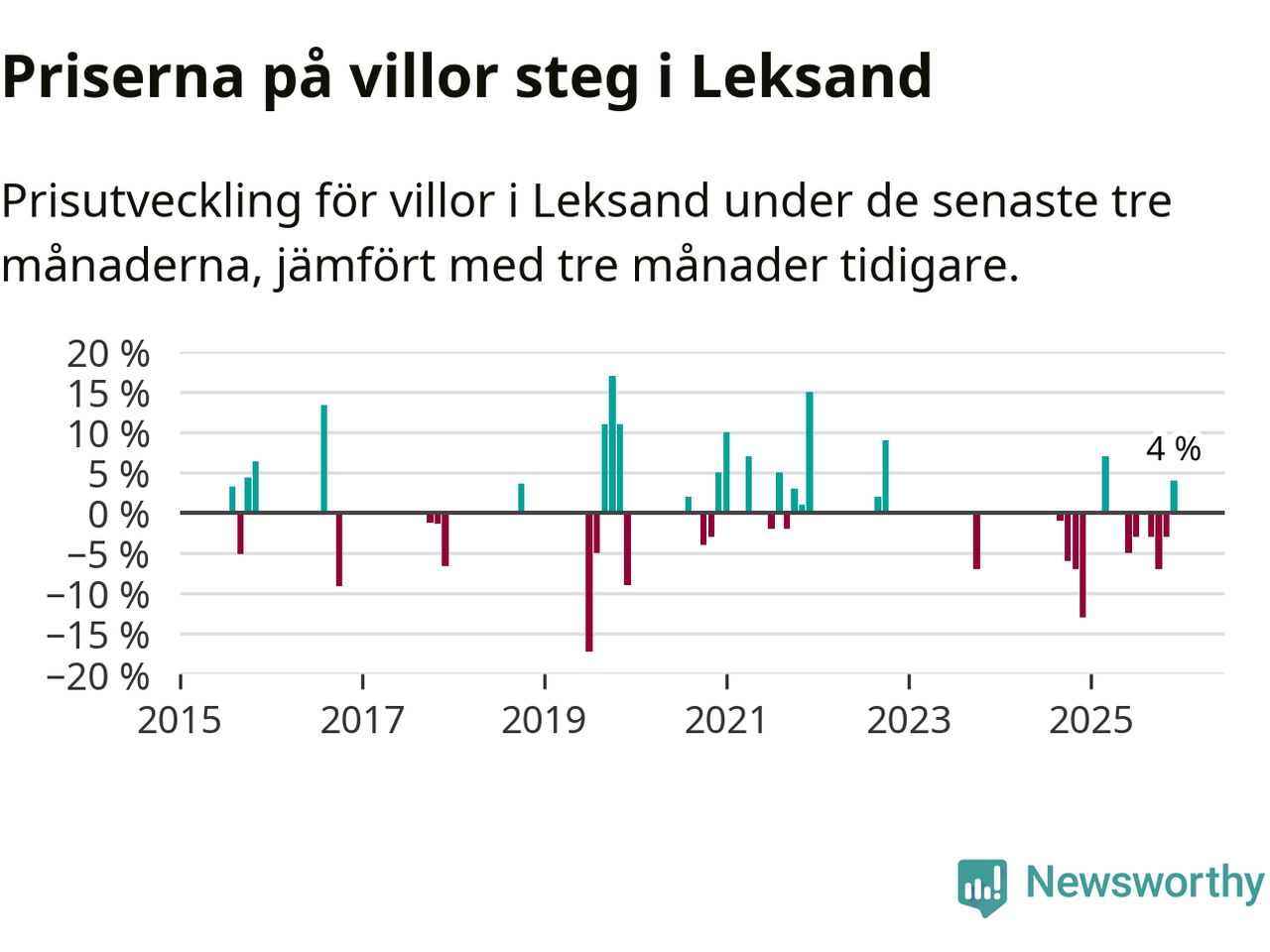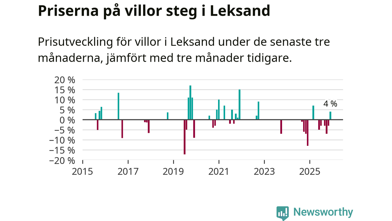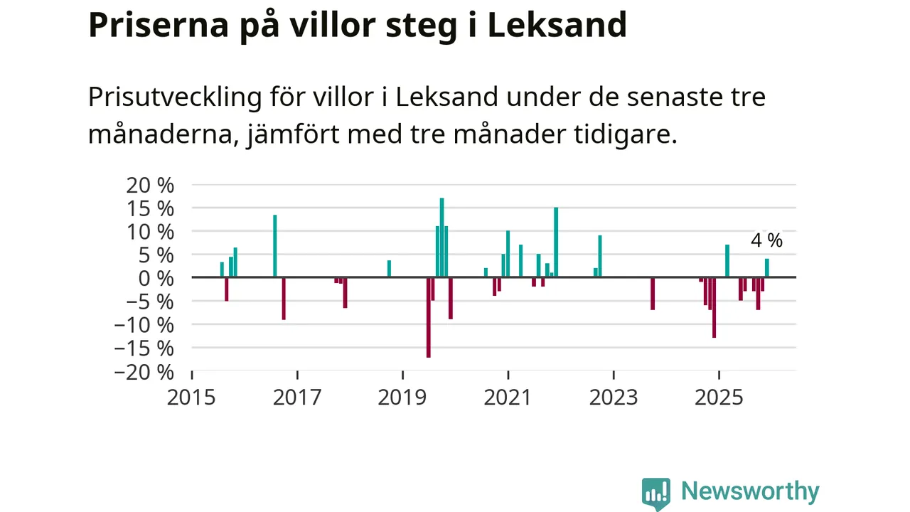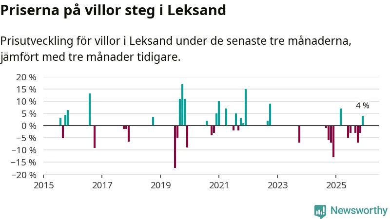 Statistiken visar även på en kännbar prisuppgång i Leksands kommun. Medelpriset på försäljningarna av villor i kommunen var 4 procent högre än för tre månader sedan. I hela Dalarna däremot sjunker villapriserna. I hela länet noterades en prisnedgång på 3 procent.