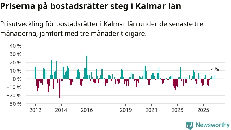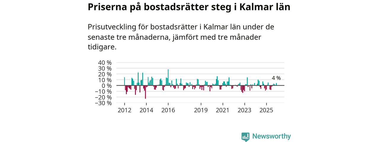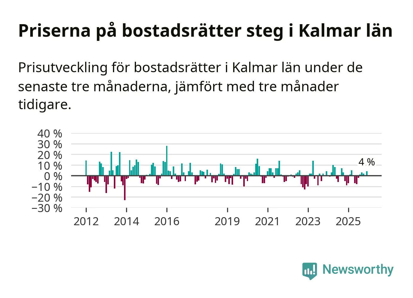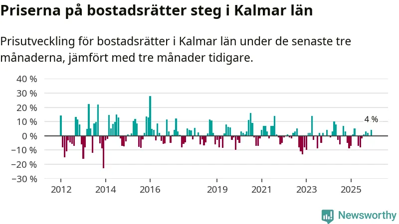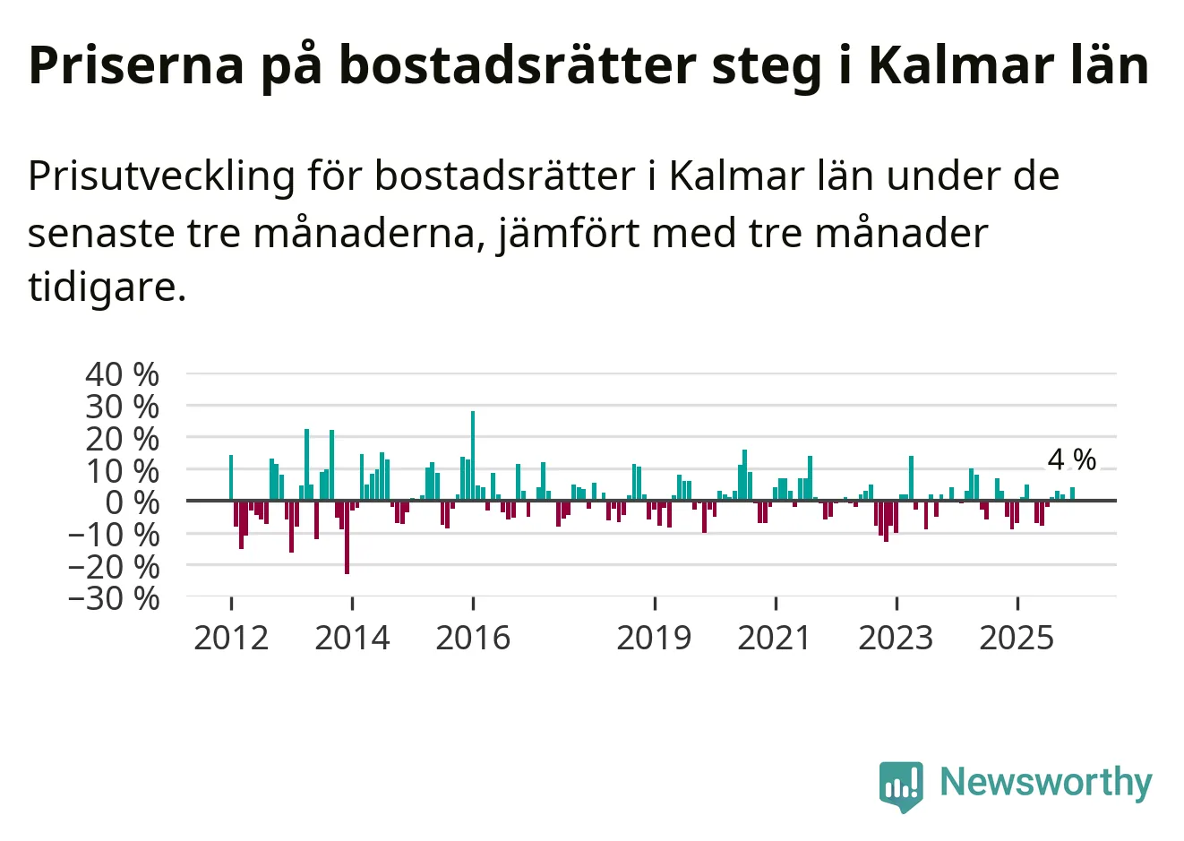 Priserna på bostadsrätter har gått upp i Kalmar län. Medelpriset på försäljningarna under de senaste tre månaderna visar på en uppgång med 4 procent.