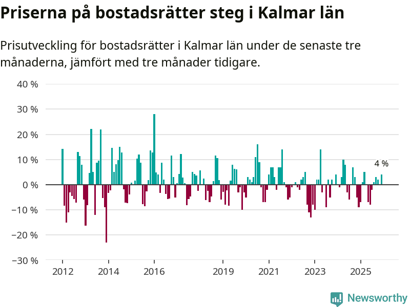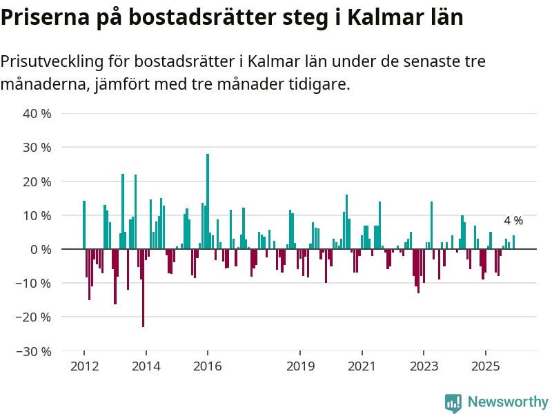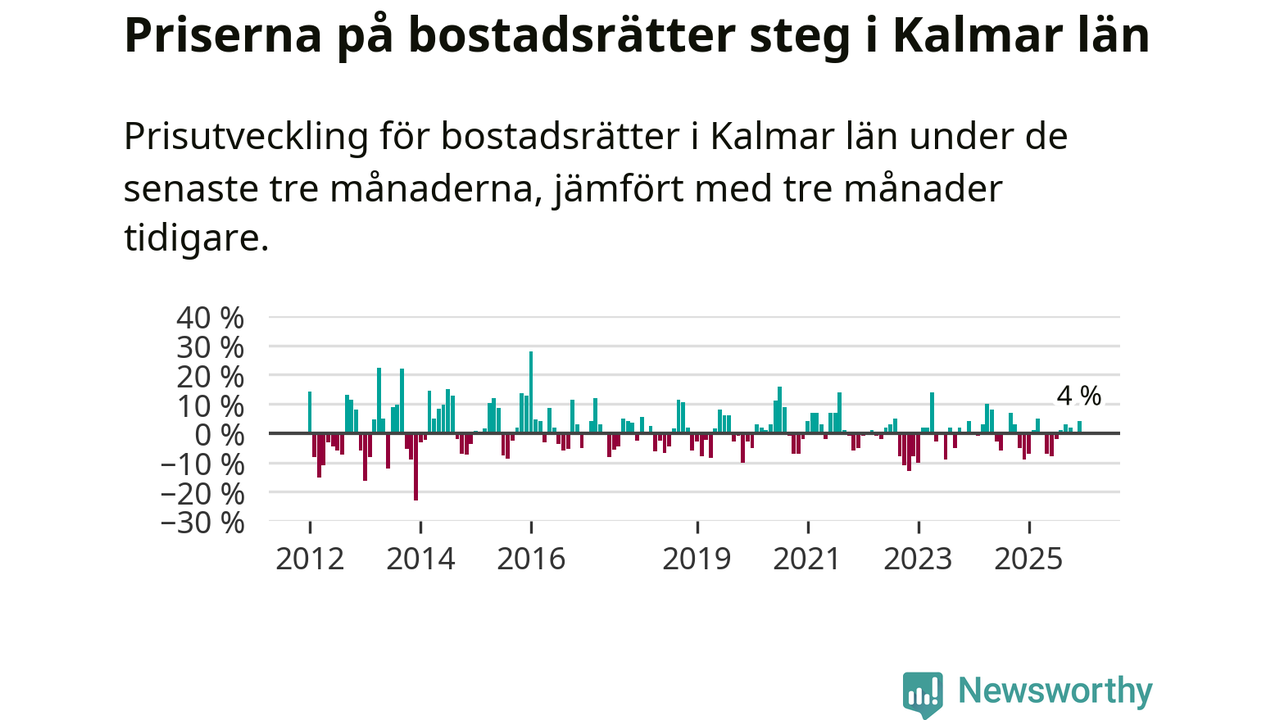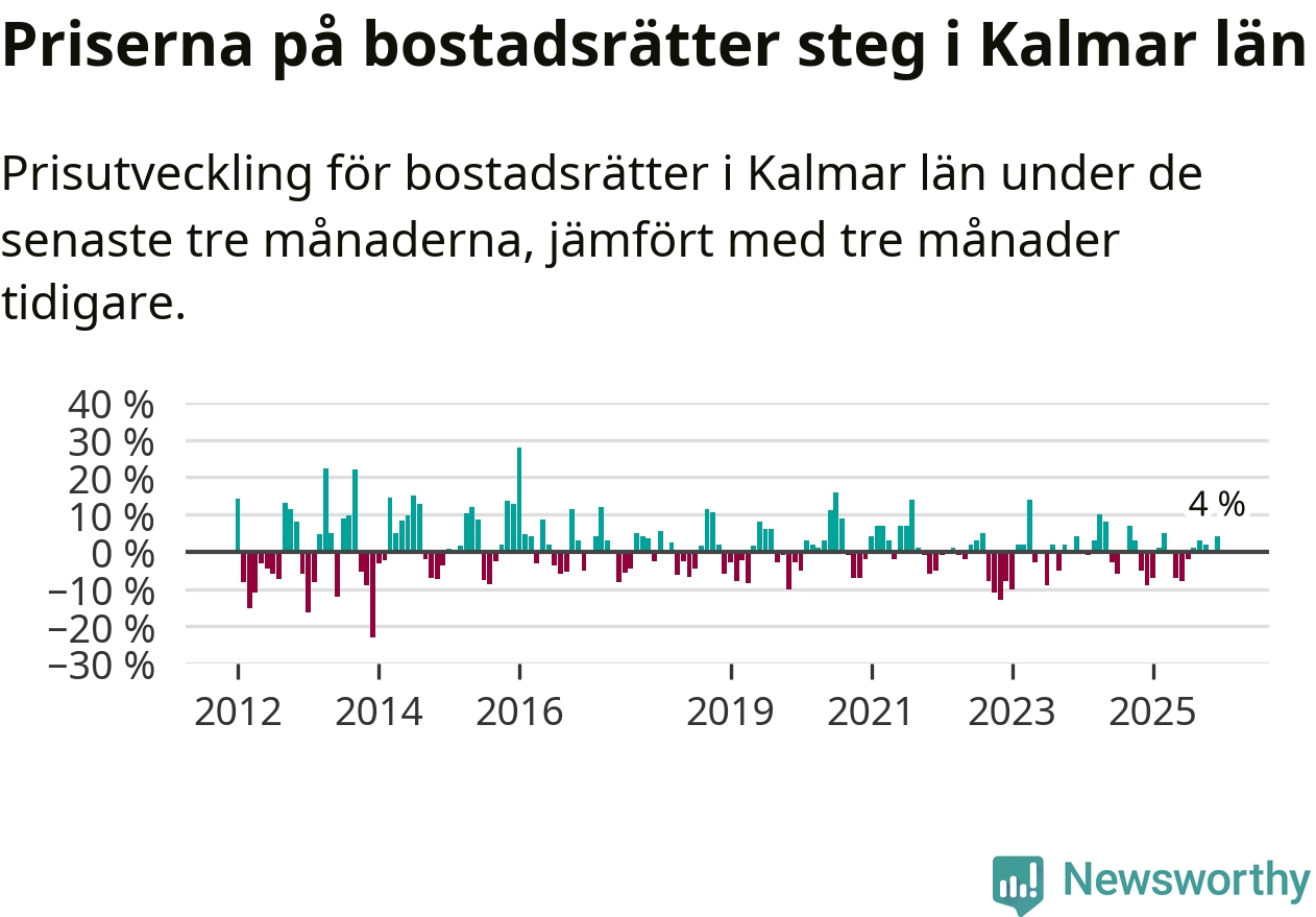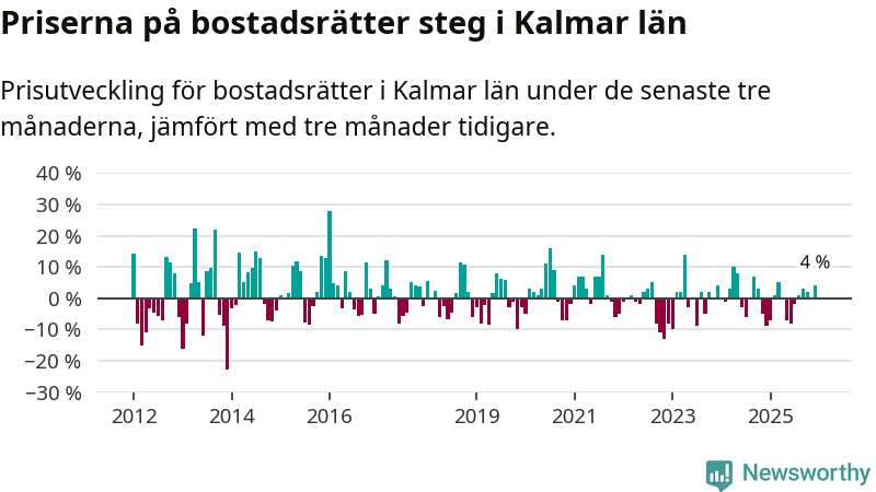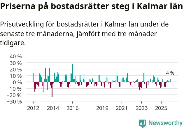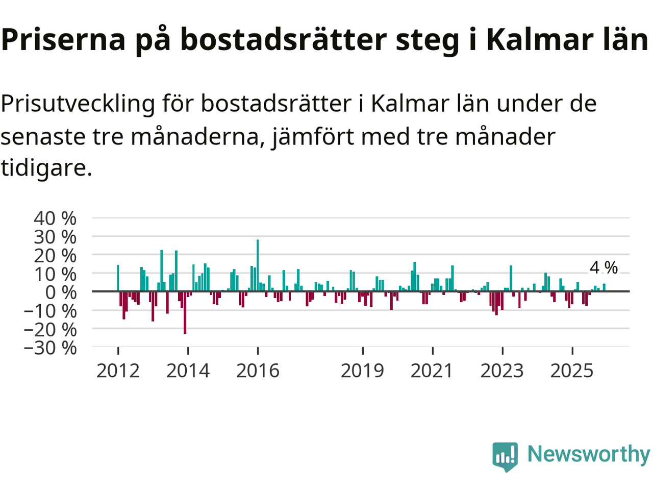 Priserna på bostadsrätter har gått upp i Kalmar län. Medelpriset på försäljningarna under de senaste tre månaderna visar på en uppgång med 4 procent.