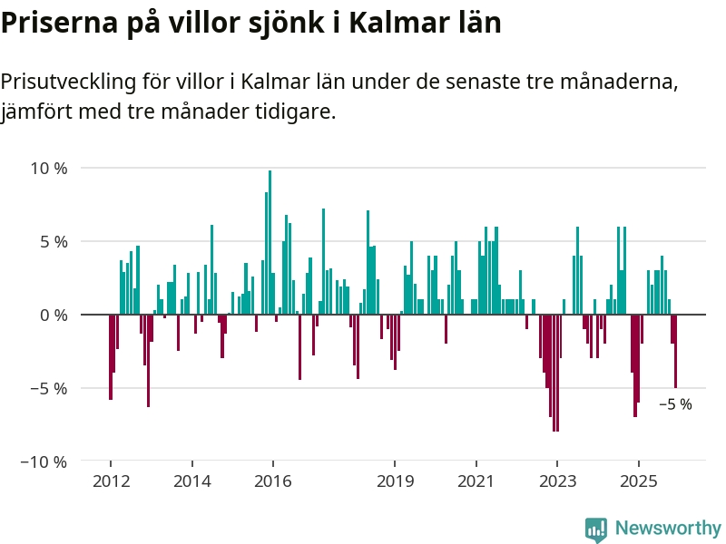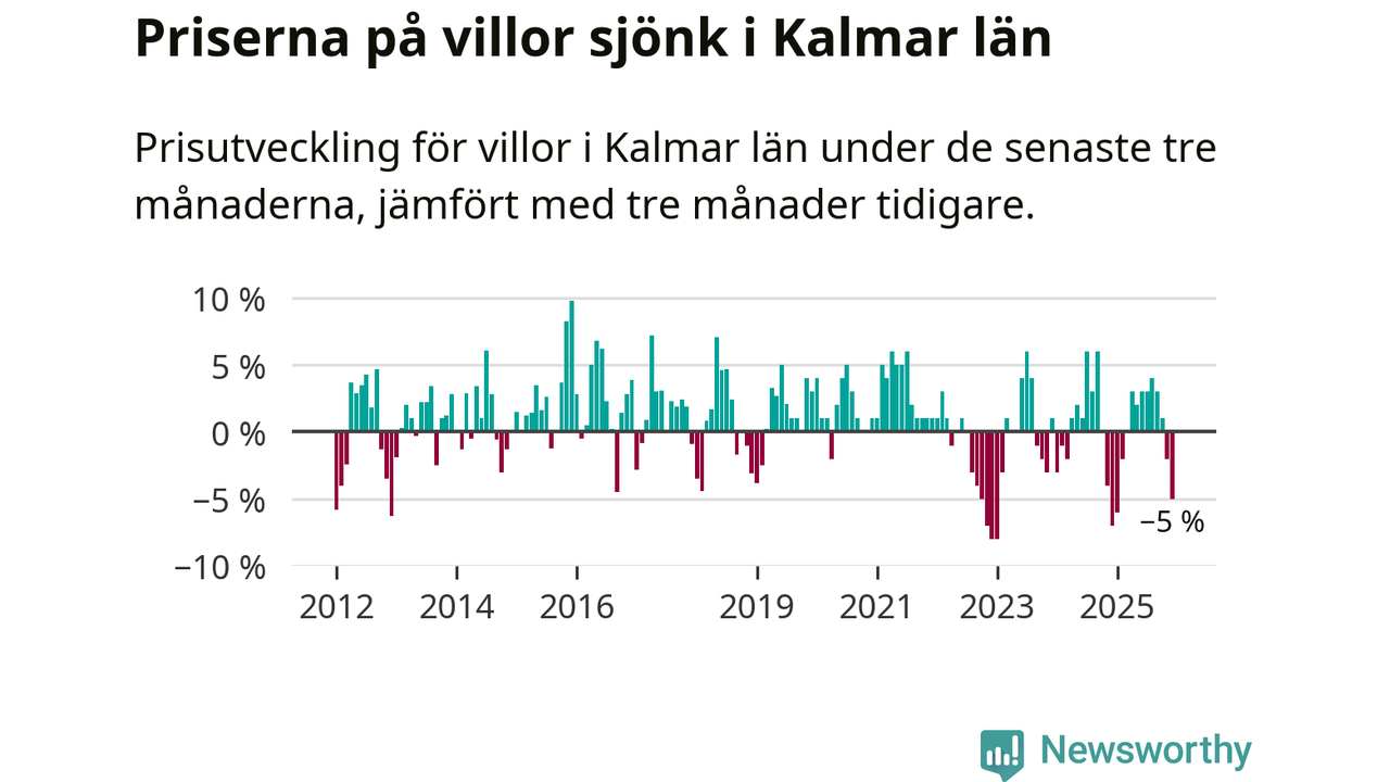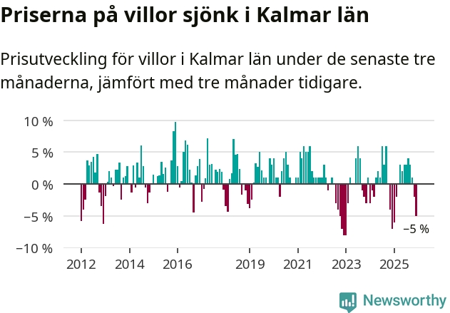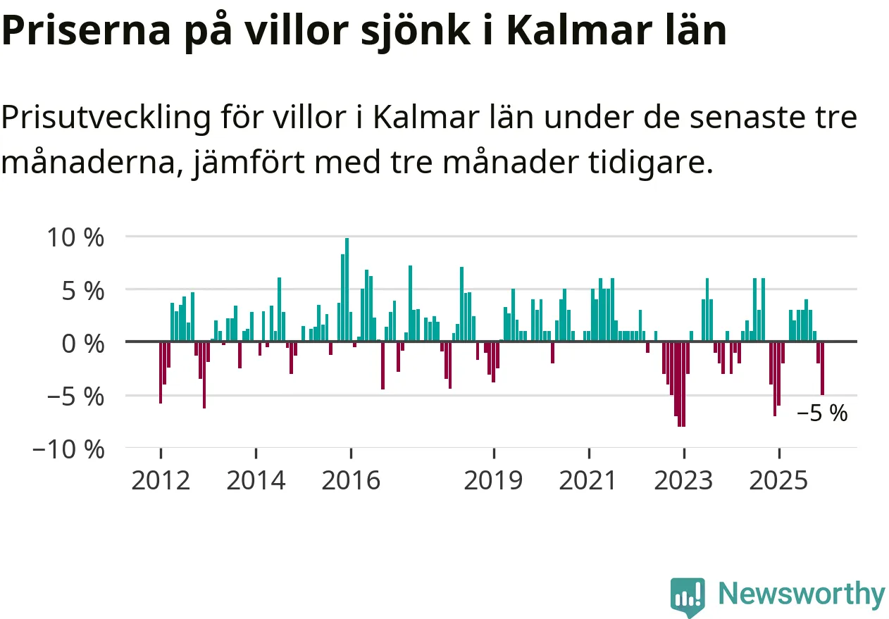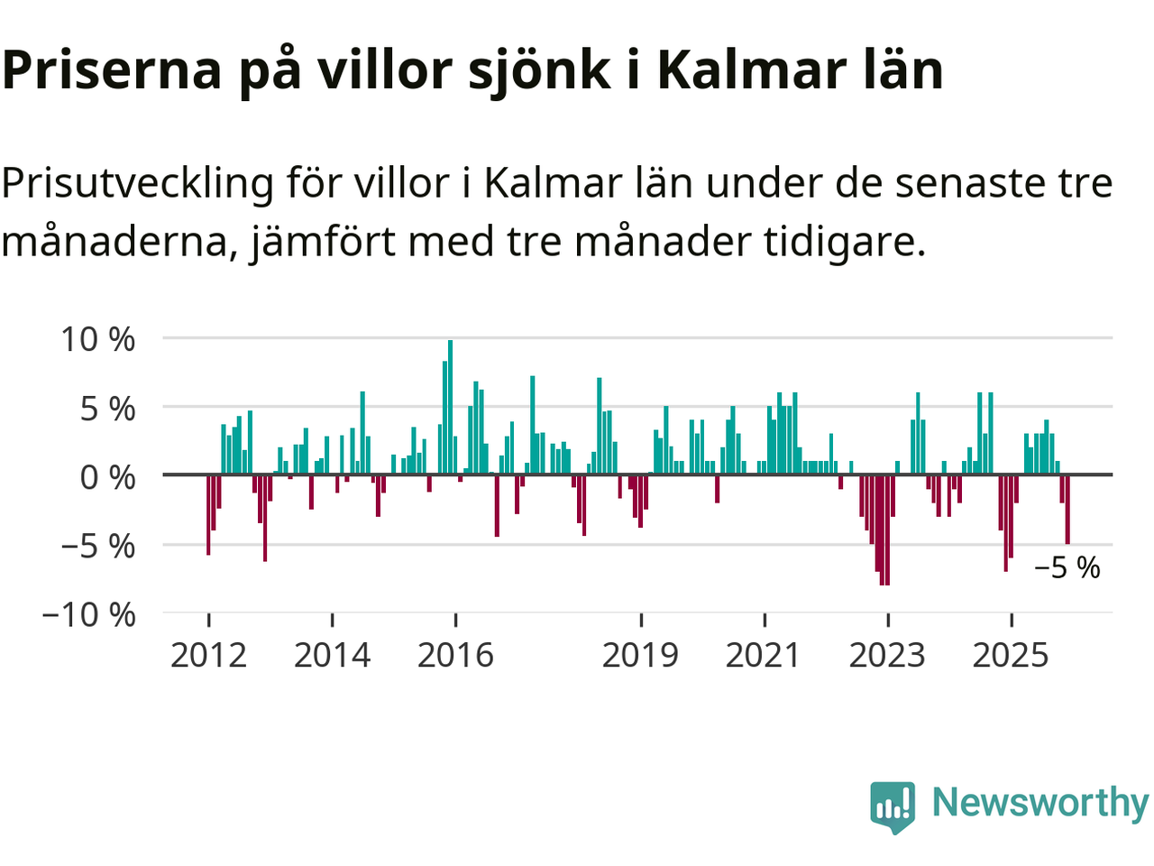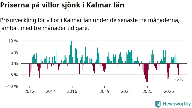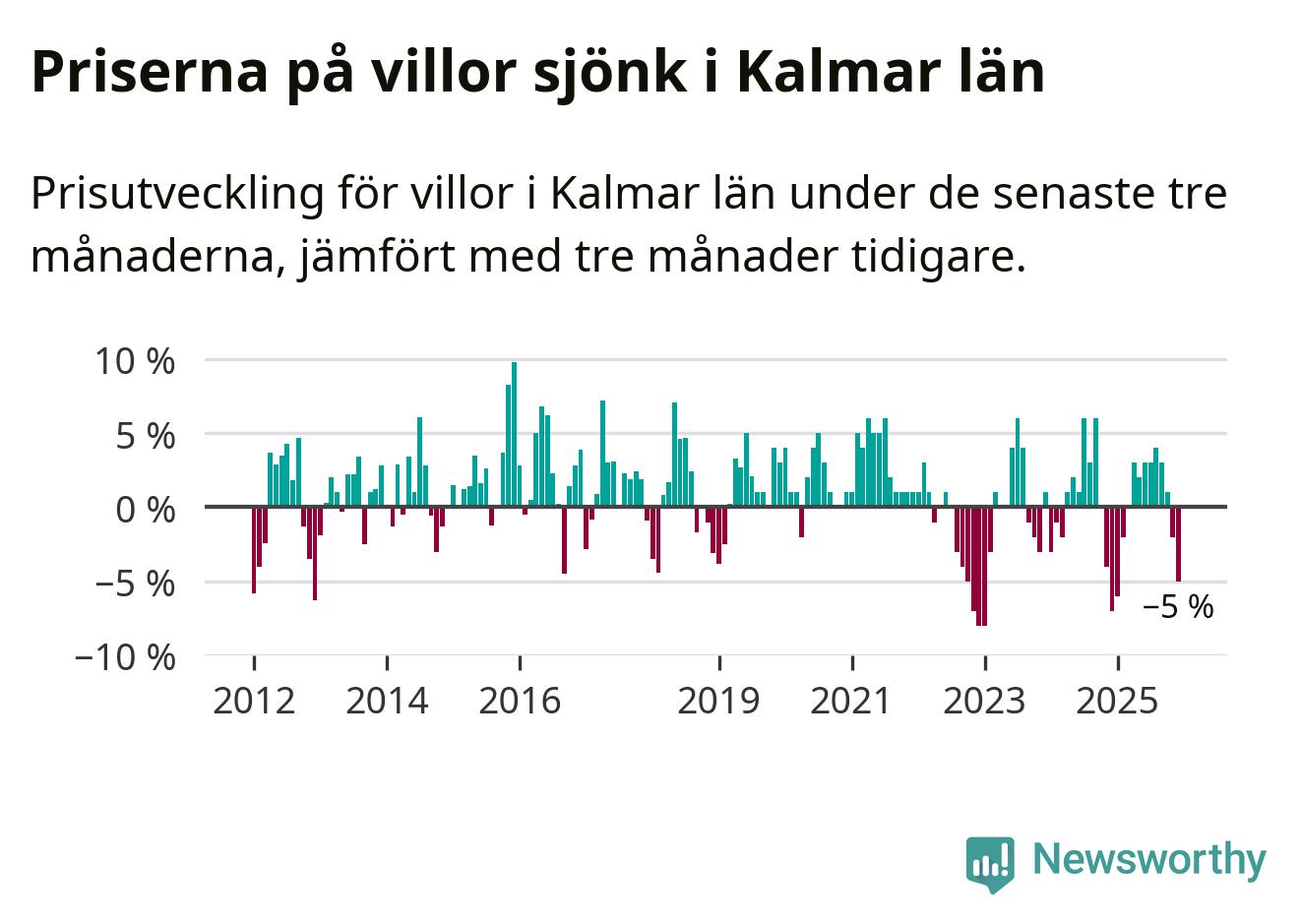 Villapriserna sjönk mellan oktober och december med 5 procent i Kalmar län. Det är en betydande nedgång jämfört med det gångna året då priserna i snitt stått stilla.