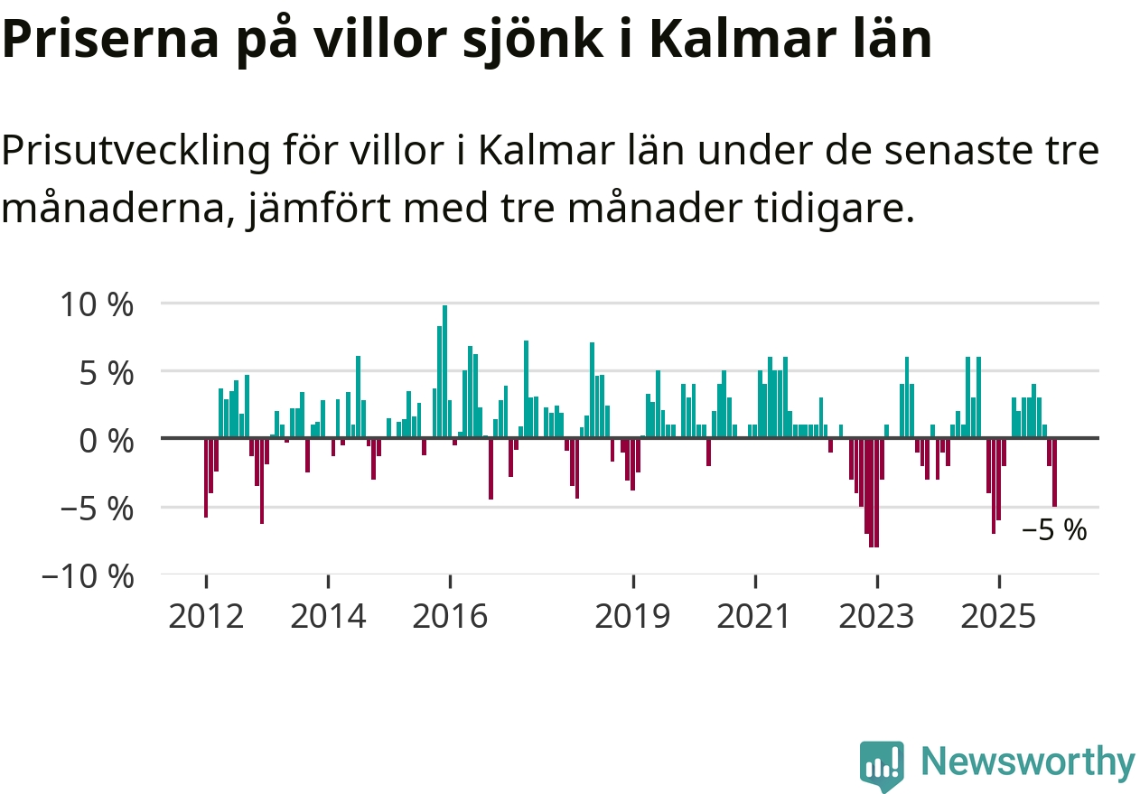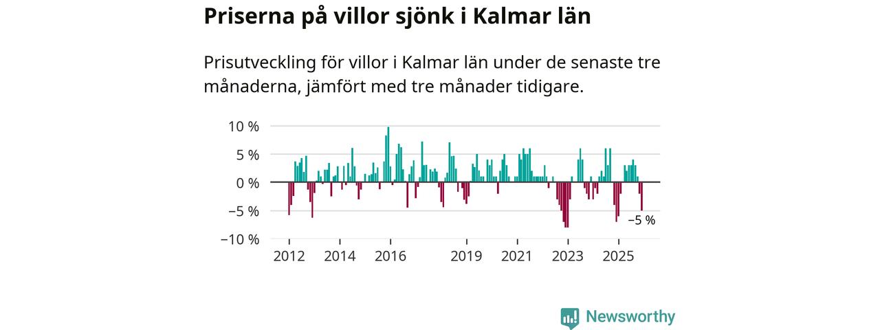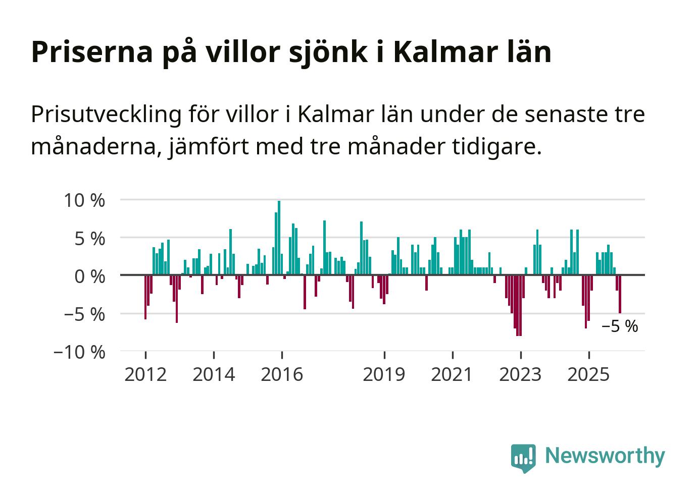 Bland kommunerna i Kalmar län sjunker priserna på villor i fyra av sex kommuner (där det redovisats uppgifter om prisutveckling). Störst var minskningen i Nybro där priserna sjönk med 13 procent. I Mönsterås däremot steg priserna med 8 procent. Notera att det på grund av få försäljningar saknas uppgifter om prisförändringar för villor i sex av länets tolv kommuner.