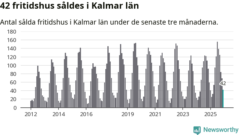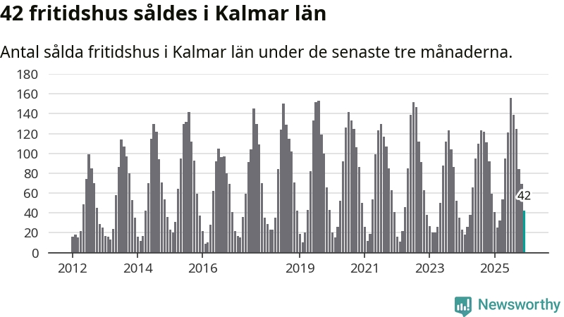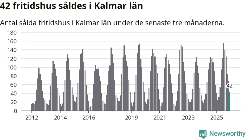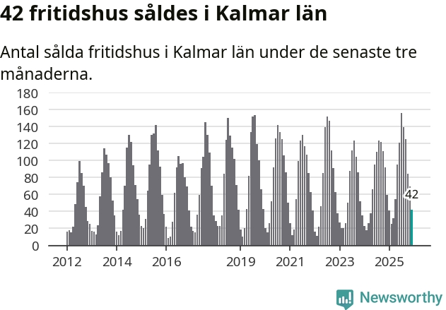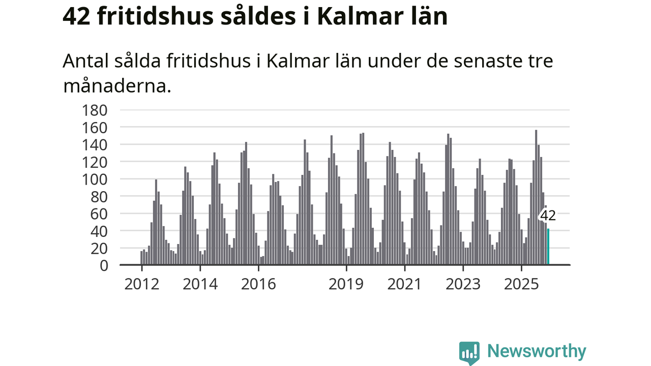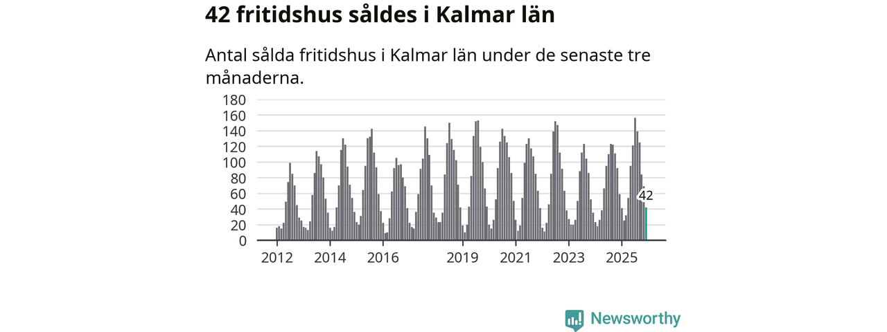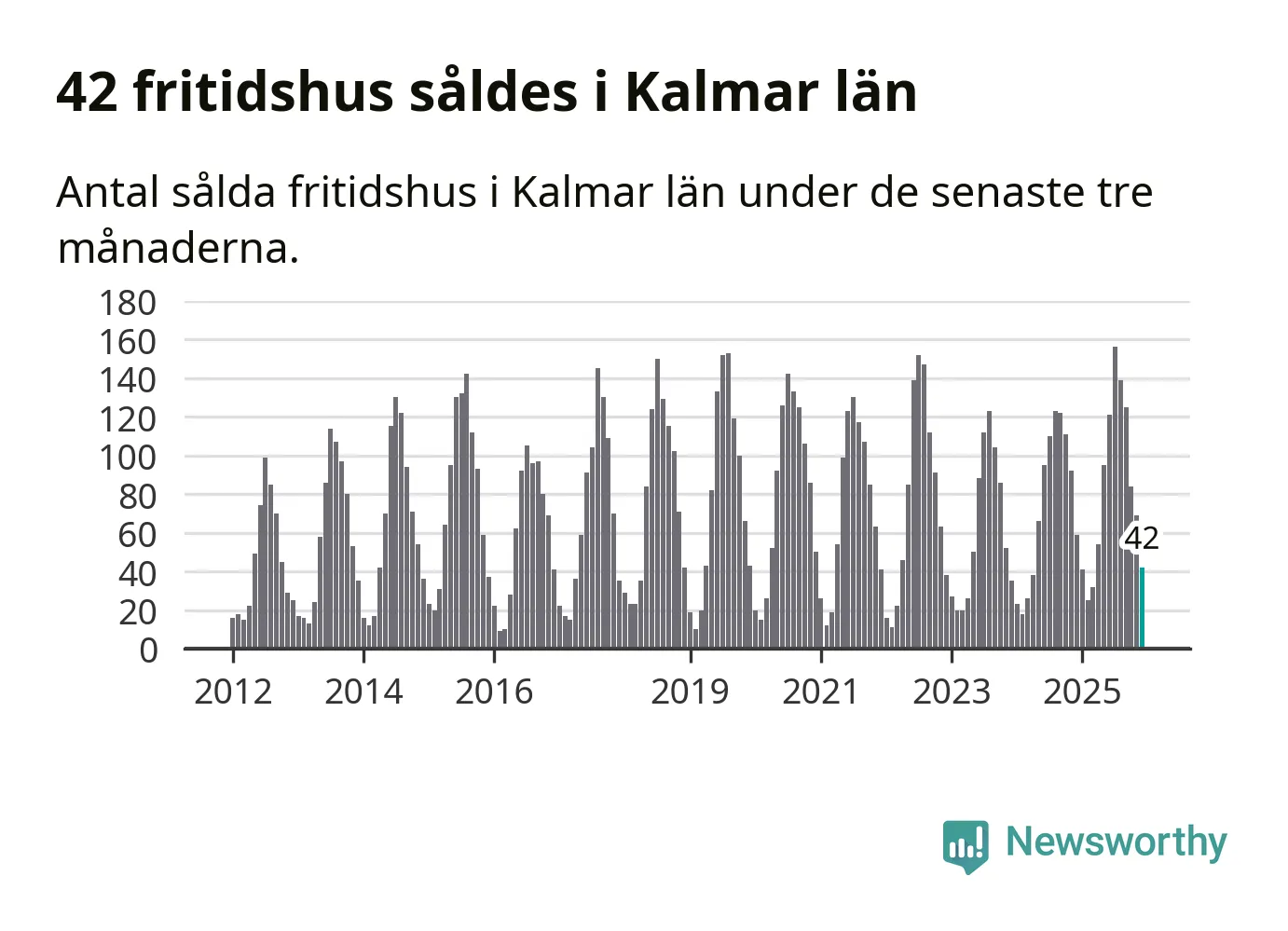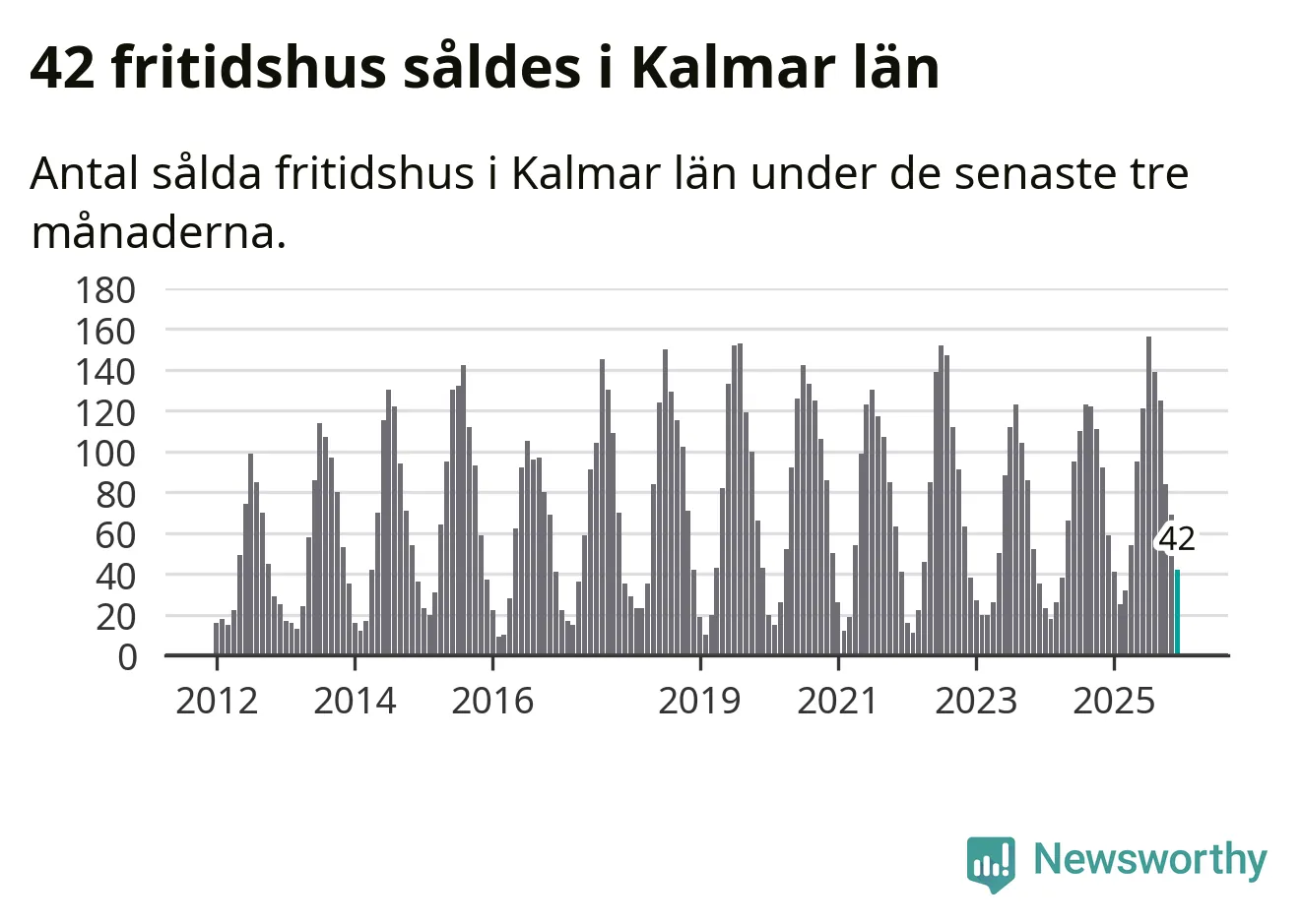 Sammanlagt såldes 42 fritidshus i Kalmar län mellan oktober 2025 och december 2025 till ett genomsnittligt pris på 2,3 miljoner kronor. I fjol gjordes 59 affärer vid den här tiden på året.