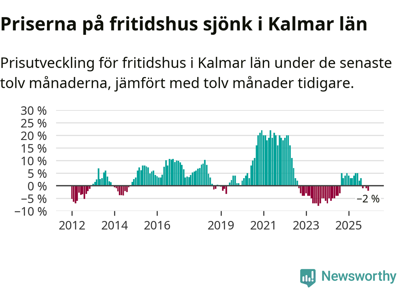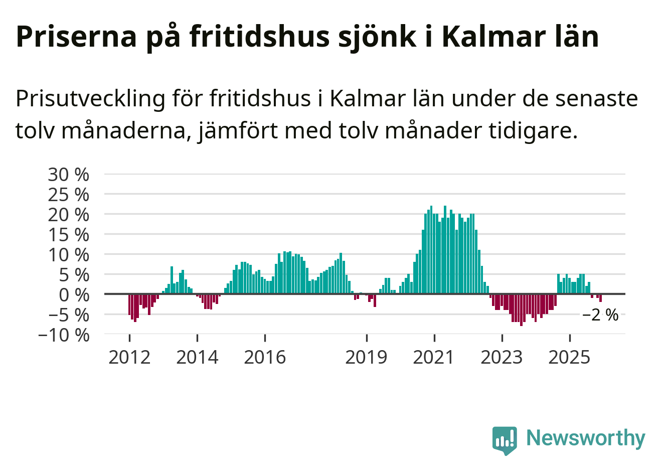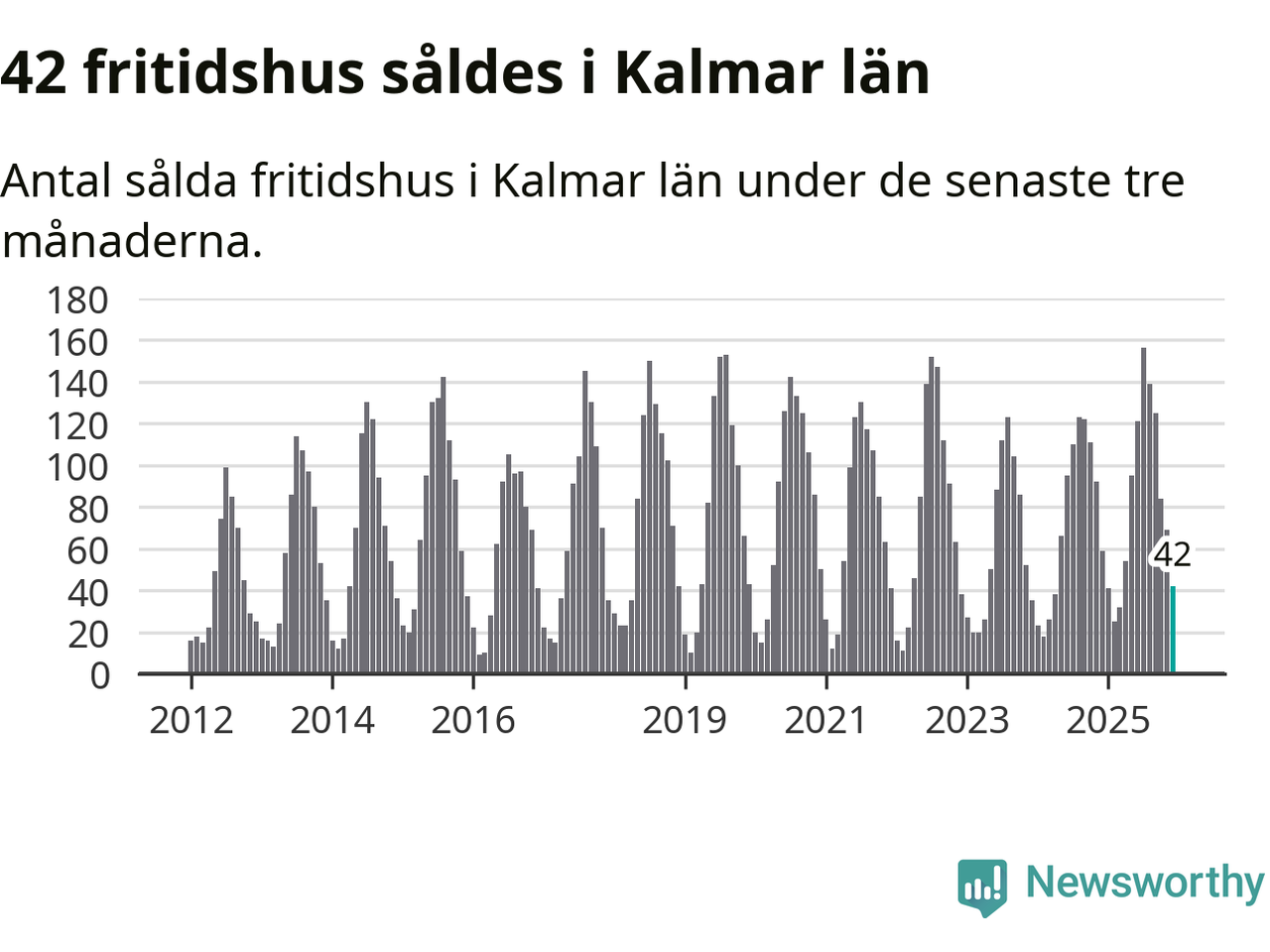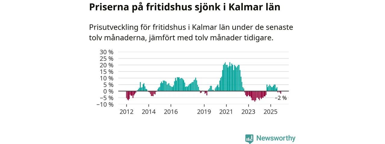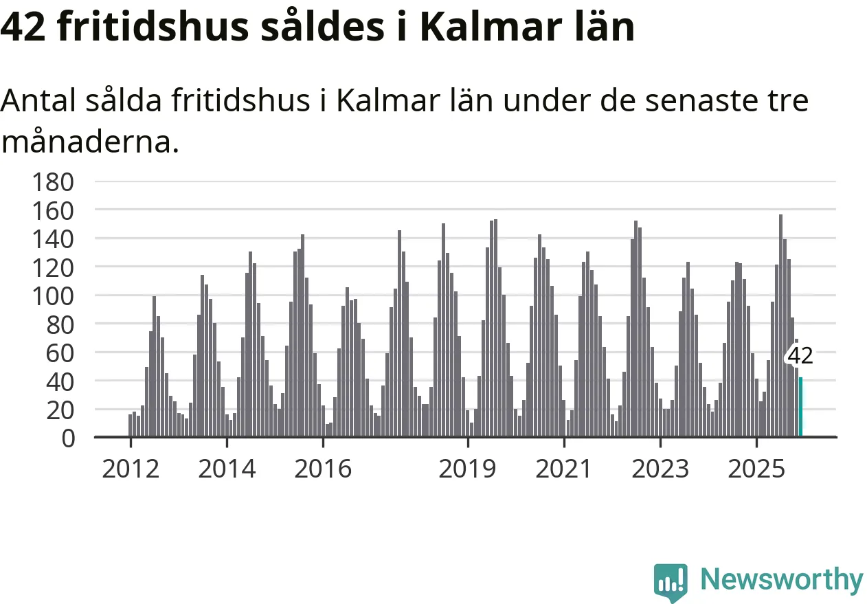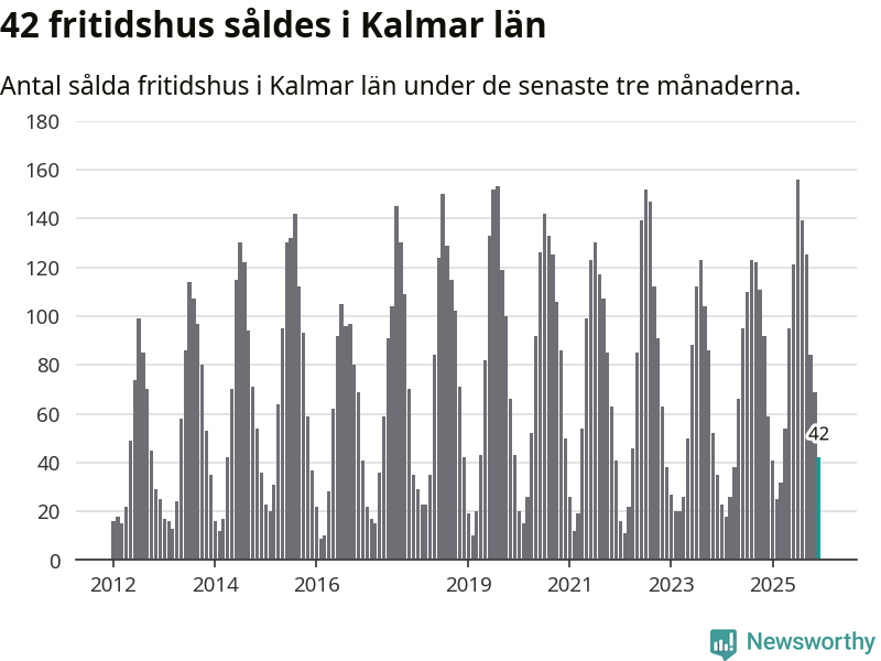 Sammanlagt såldes 42 fritidshus i Kalmar län mellan oktober 2025 och december 2025 till ett genomsnittligt pris på 2,3 miljoner kronor. I fjol gjordes 59 affärer vid den här tiden på året.
