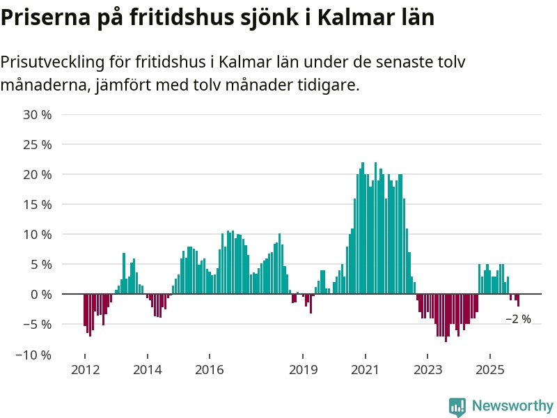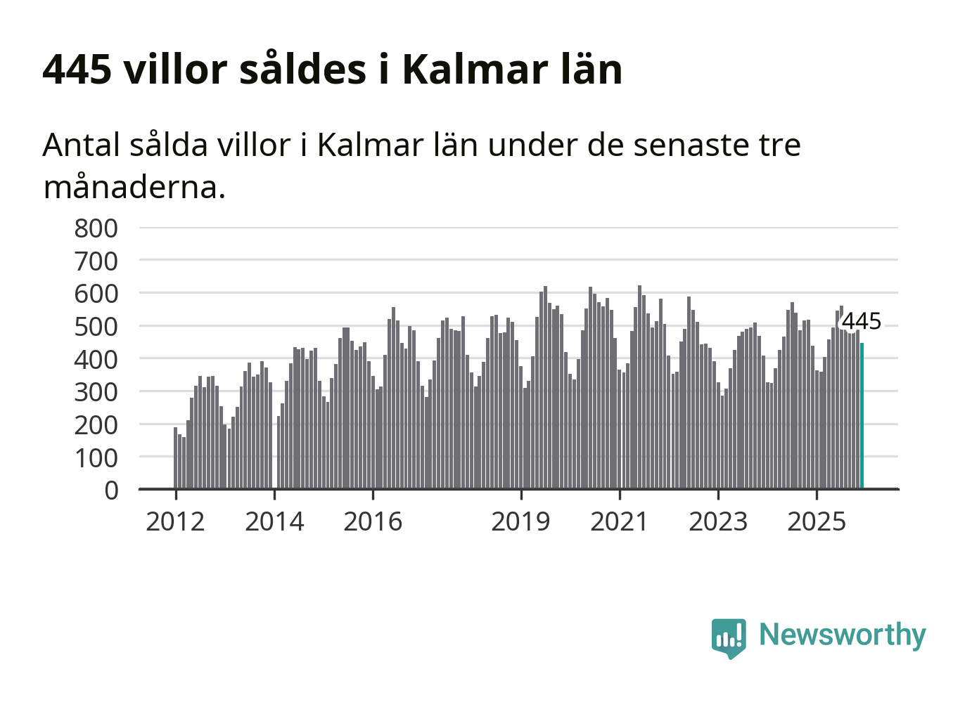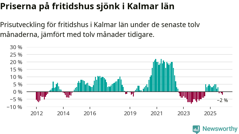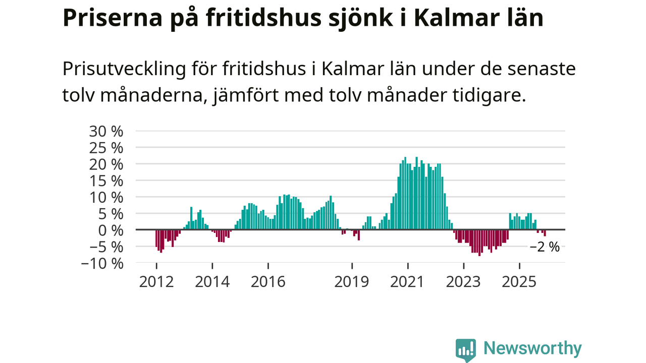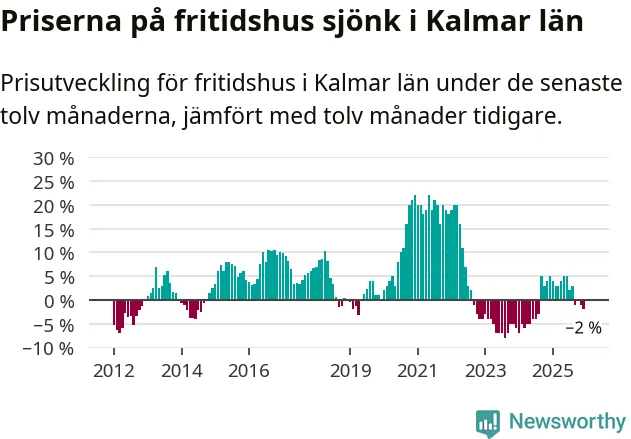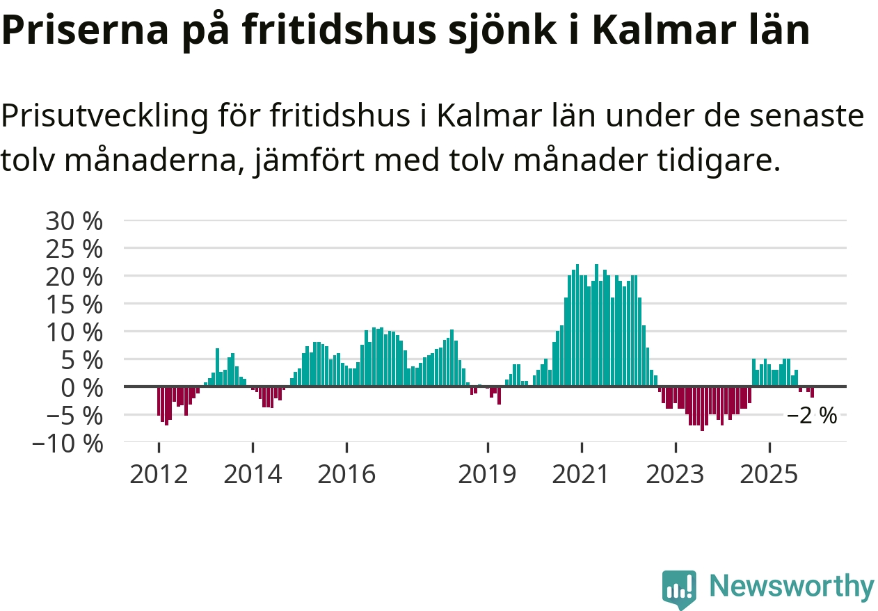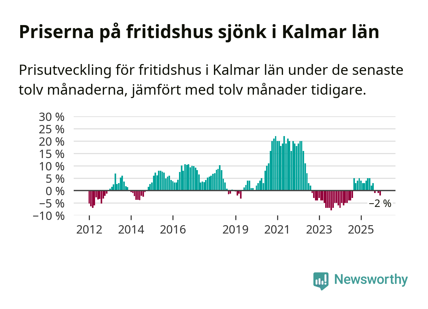 Sammanlagt såldes 42 fritidshus i Kalmar län mellan oktober 2025 och december 2025 till ett genomsnittligt pris på 2,3 miljoner kronor. I fjol gjordes 59 affärer vid den här tiden på året.