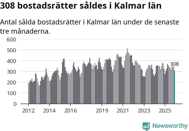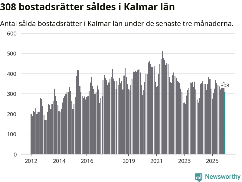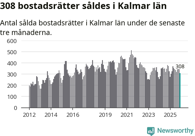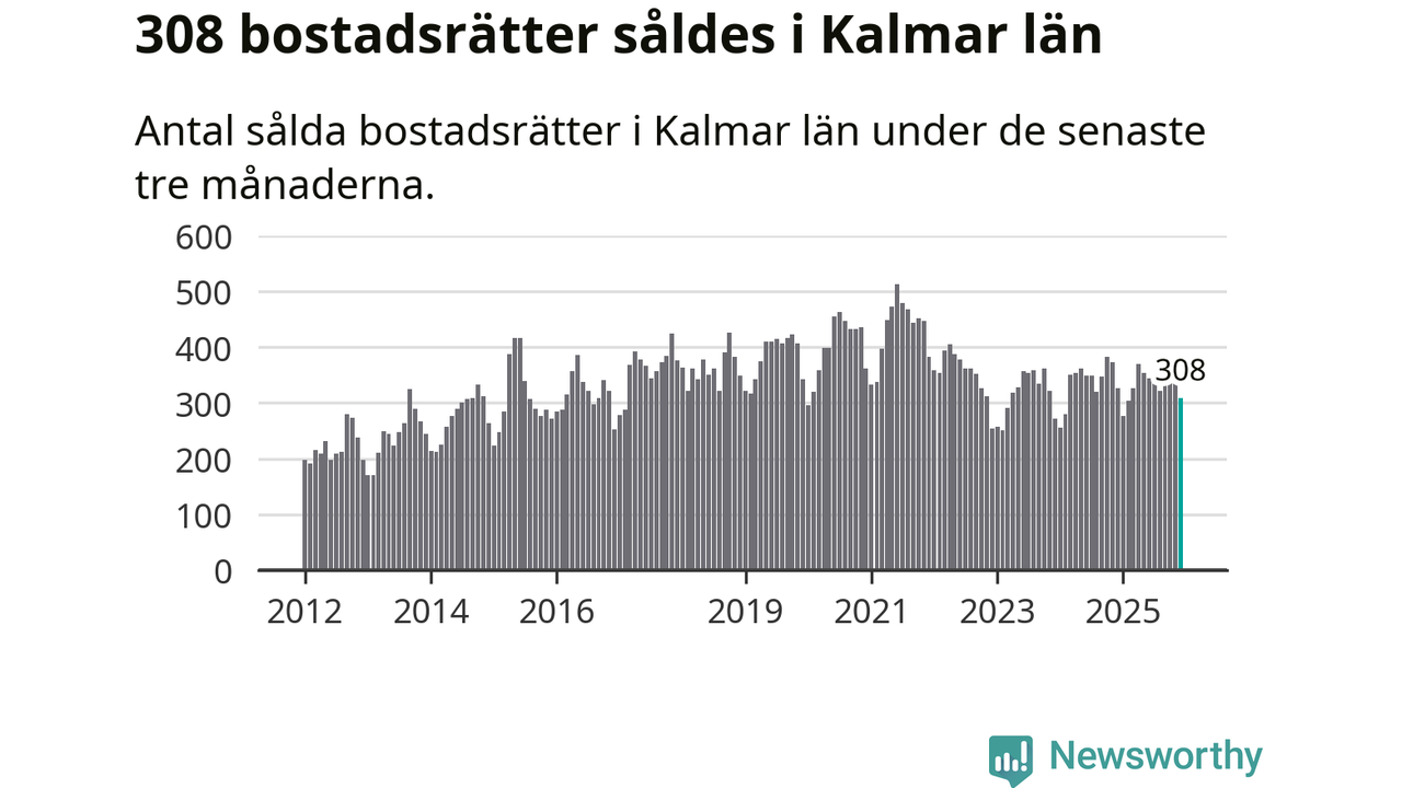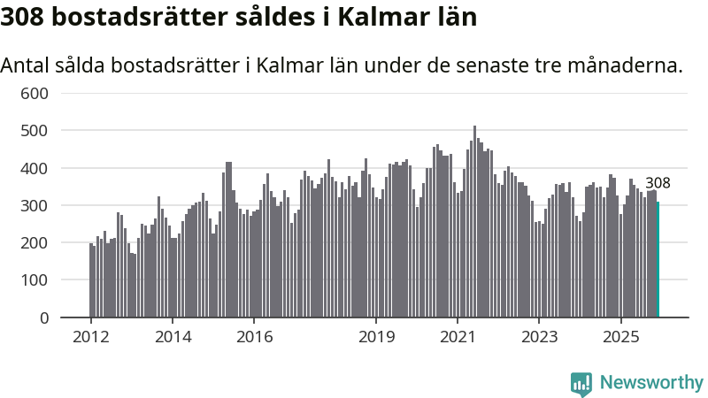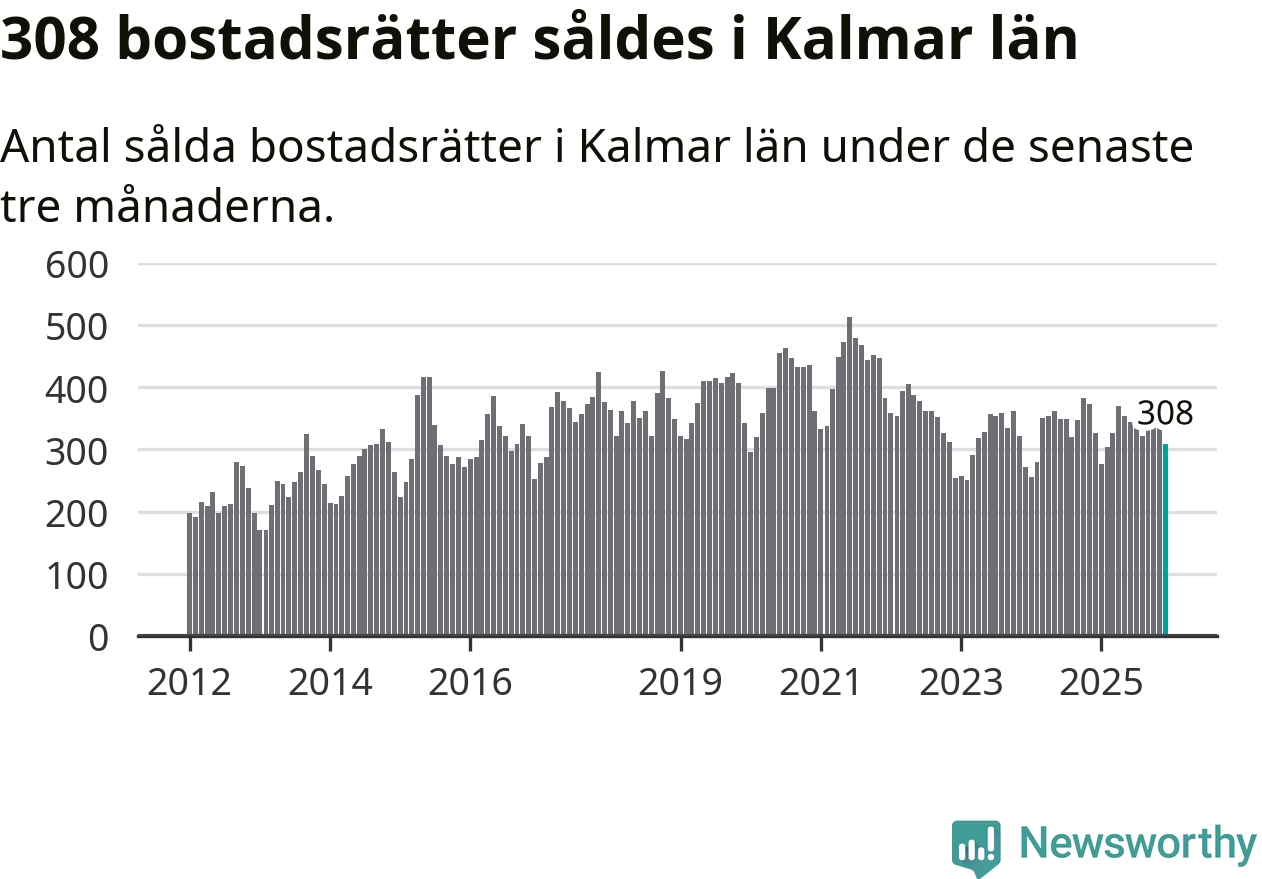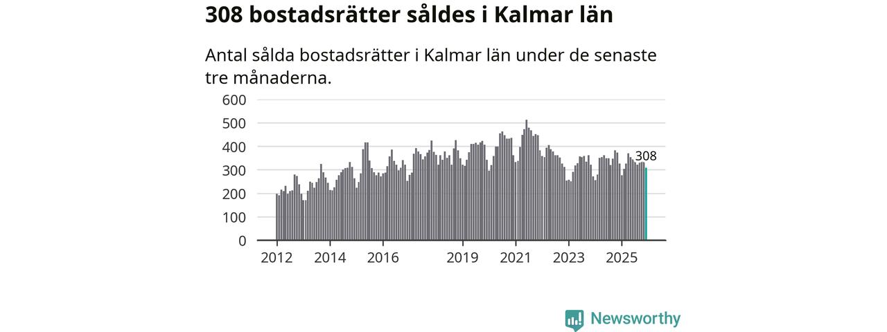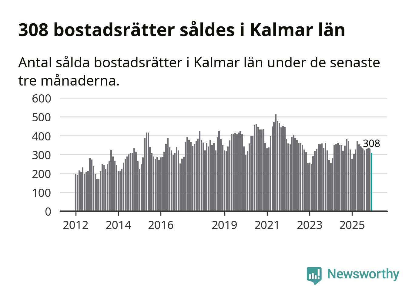 Sammanlagt såldes 308 bostadsrätter i Kalmar län mellan oktober och december till ett genomsnittligt pris på 1,4 miljoner kronor. I fjol gjordes 326 affärer vid den här tiden på året.