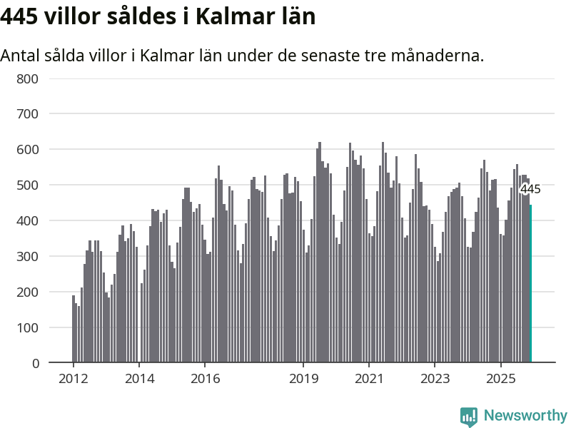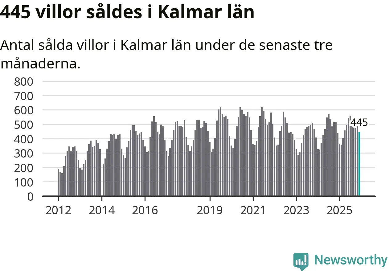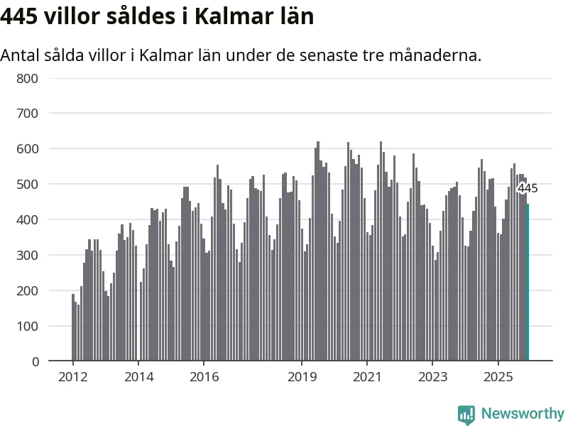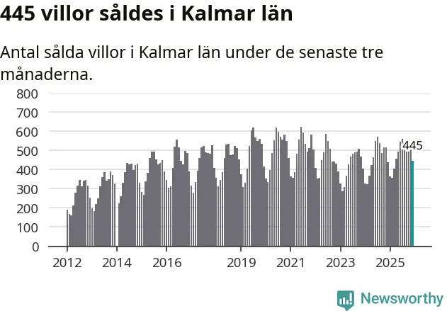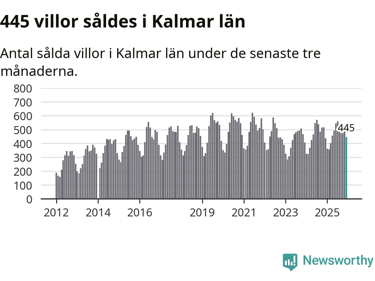 Sammanlagt såldes 445 villor i Kalmar län mellan oktober och december till ett genomsnittligt pris på 2,2 miljoner kronor. I fjol gjordes 437 affärer vid den här tiden på året.