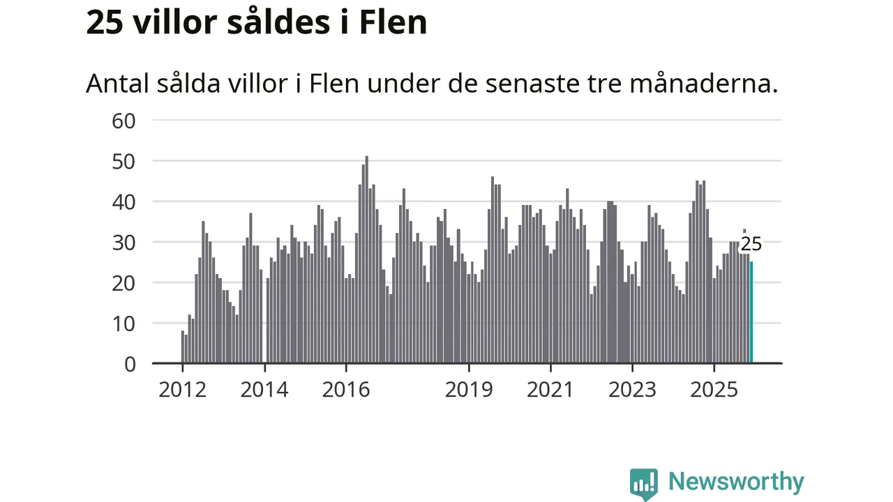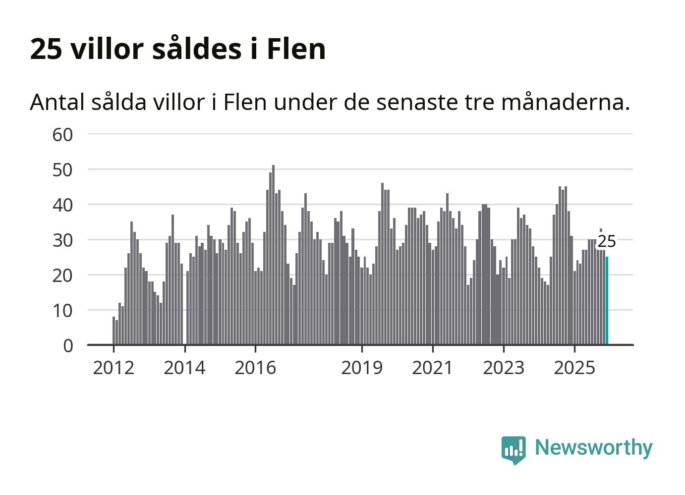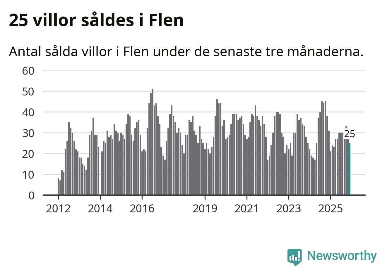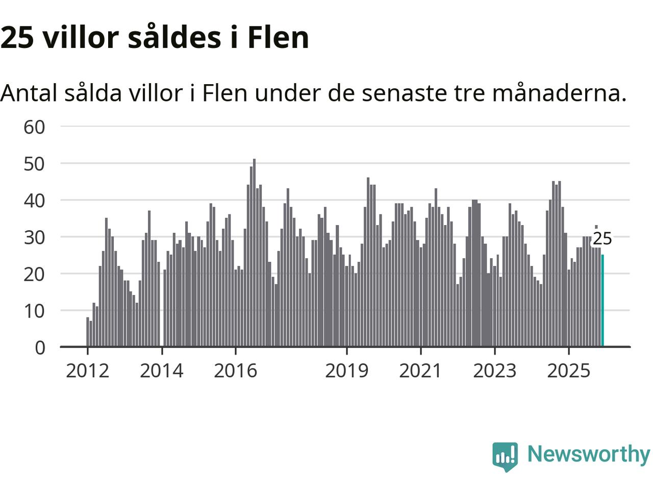 Mellan oktober och december gjordes sammanlagt 25 affärer med villor i Flens kommun. Det kan jämföras med 31 vid motsvarande tid i fjol.
