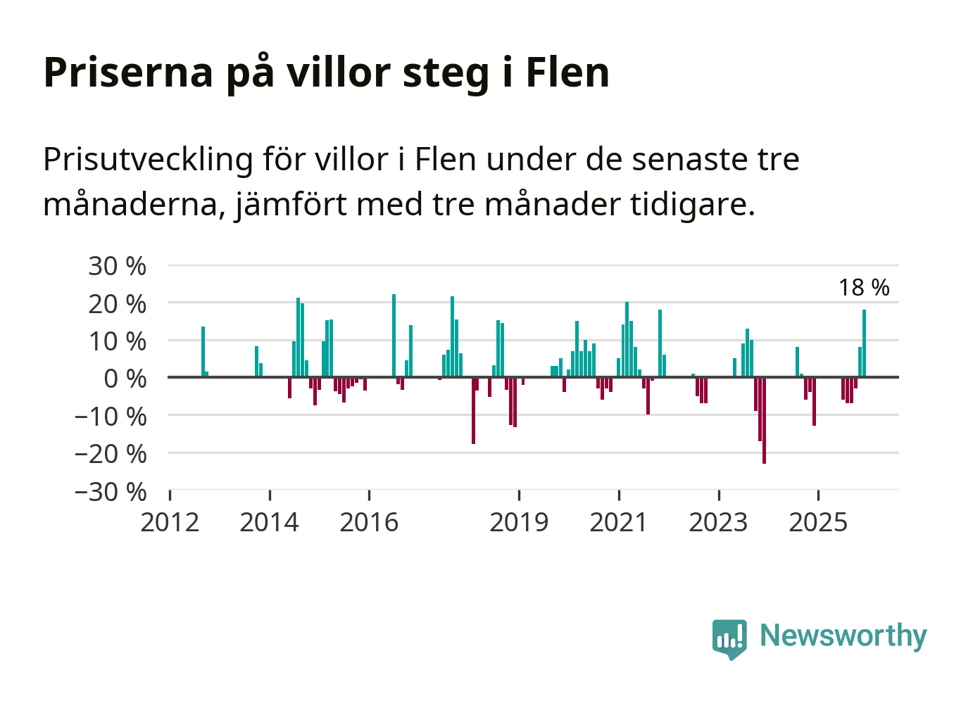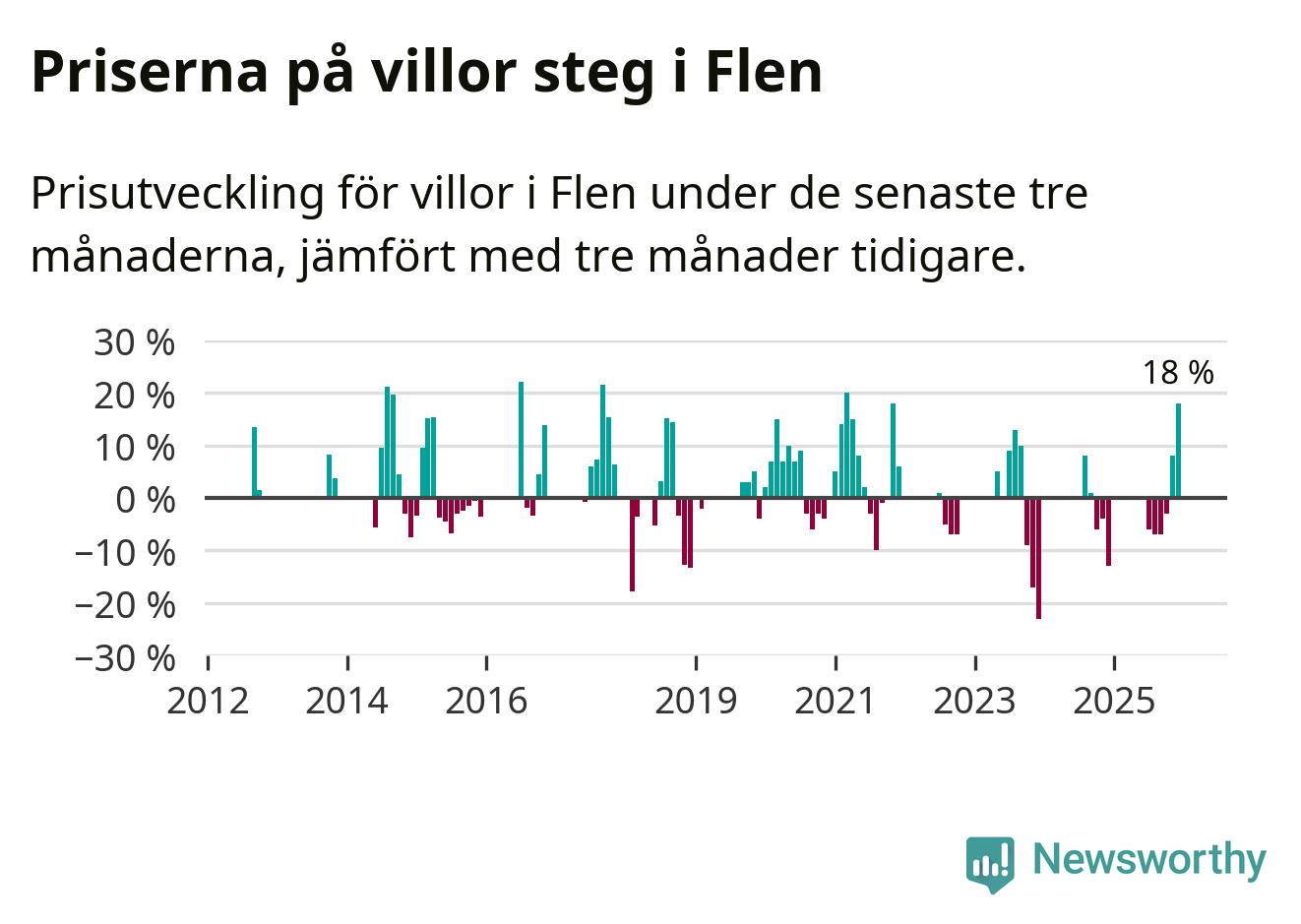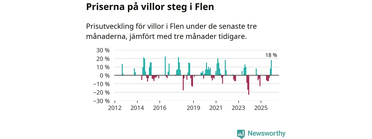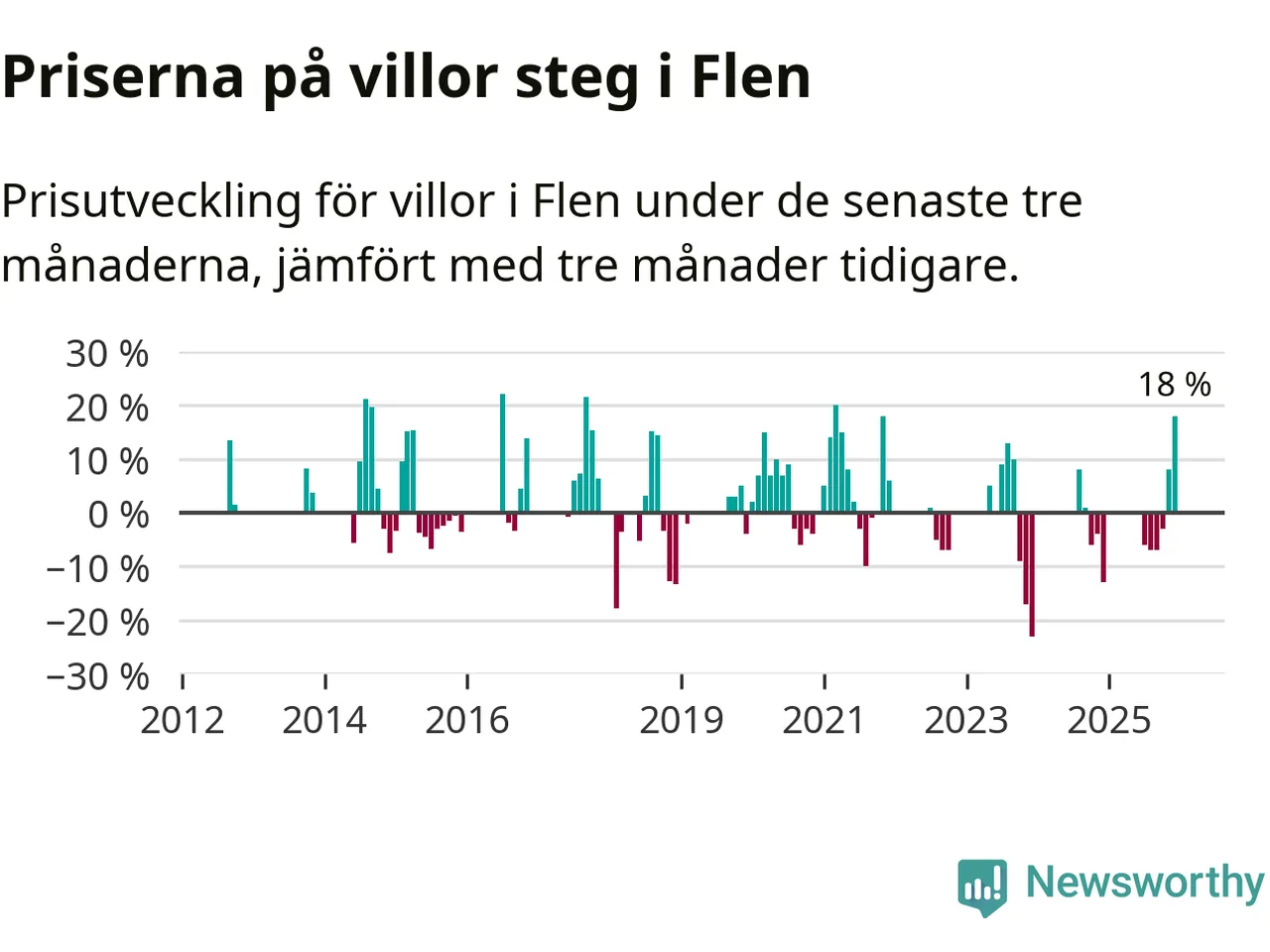 Statistiken visar även på en stor prisuppgång i Flens kommun. Medelpriset på försäljningarna av villor i kommunen var 18 procent högre än för tre månader sedan. Även i hela Södermanland ökar villapriserna. I hela länet noterades en prisuppgång på 1 procent.