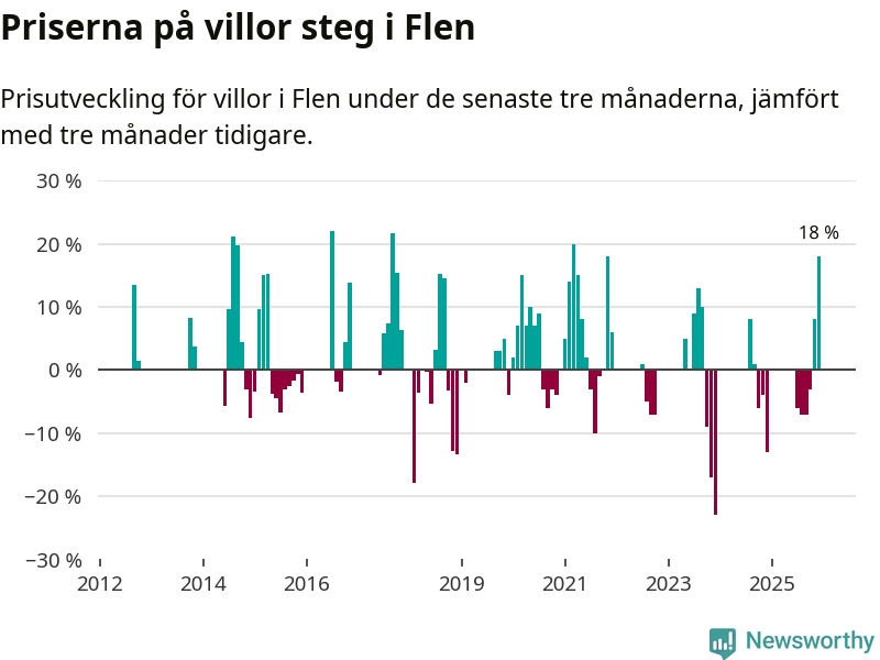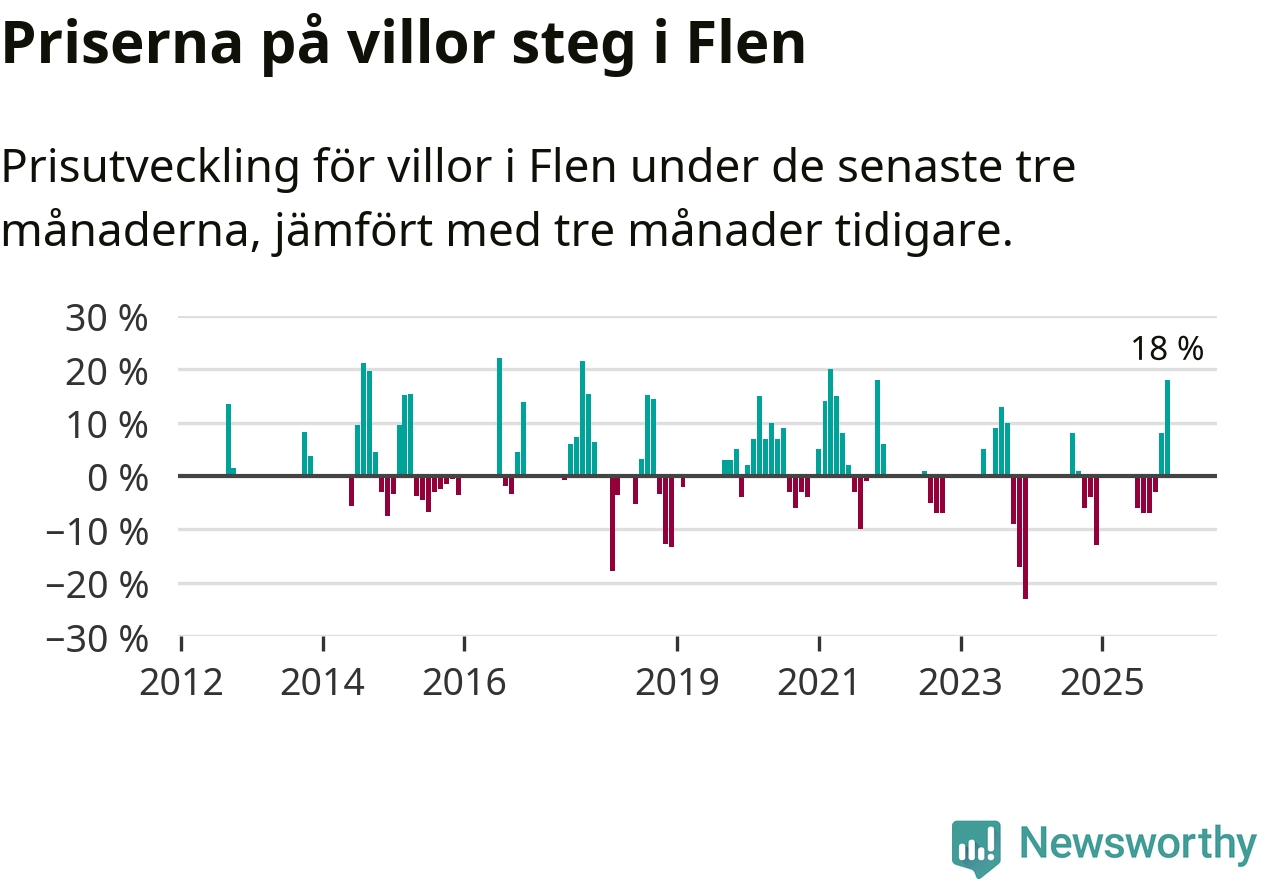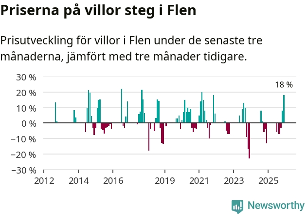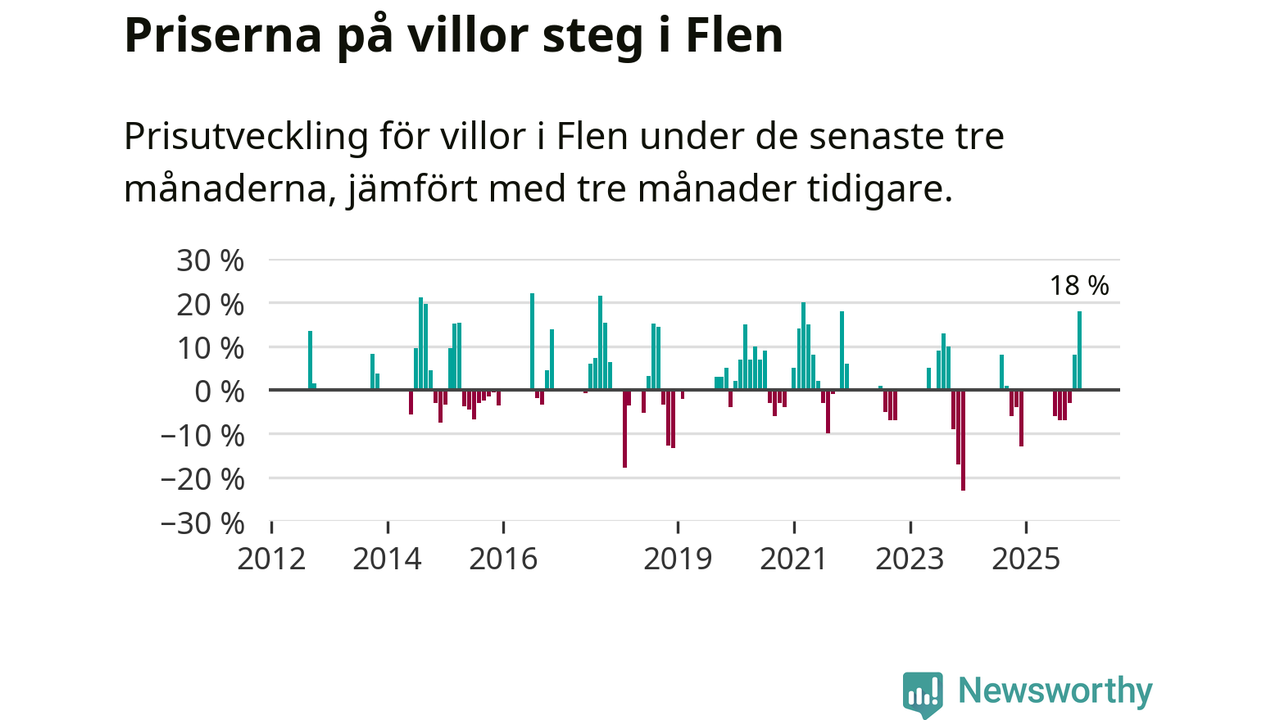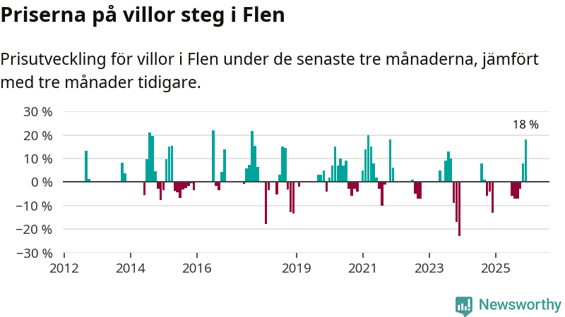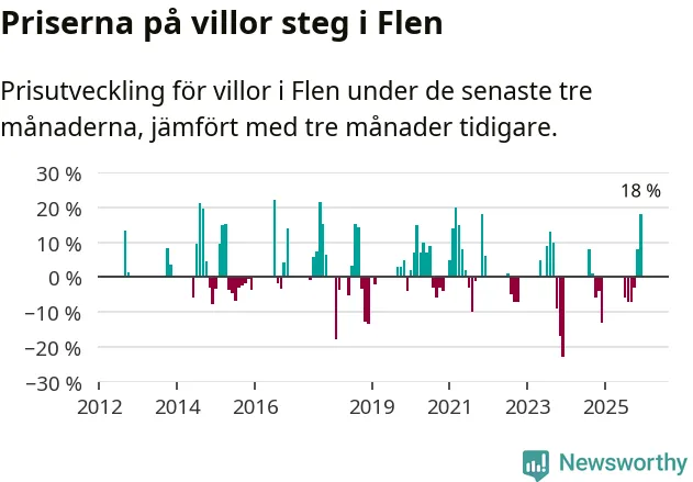 Statistiken visar även på en stor prisuppgång i Flens kommun. Medelpriset på försäljningarna av villor i kommunen var 18 procent högre än för tre månader sedan. Även i hela Södermanland ökar villapriserna. I hela länet noterades en prisuppgång på 1 procent.