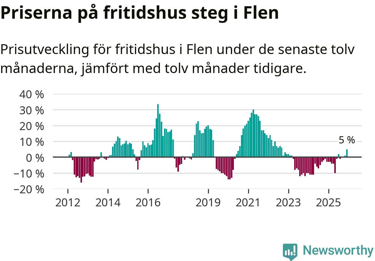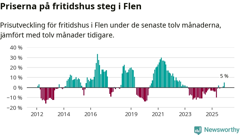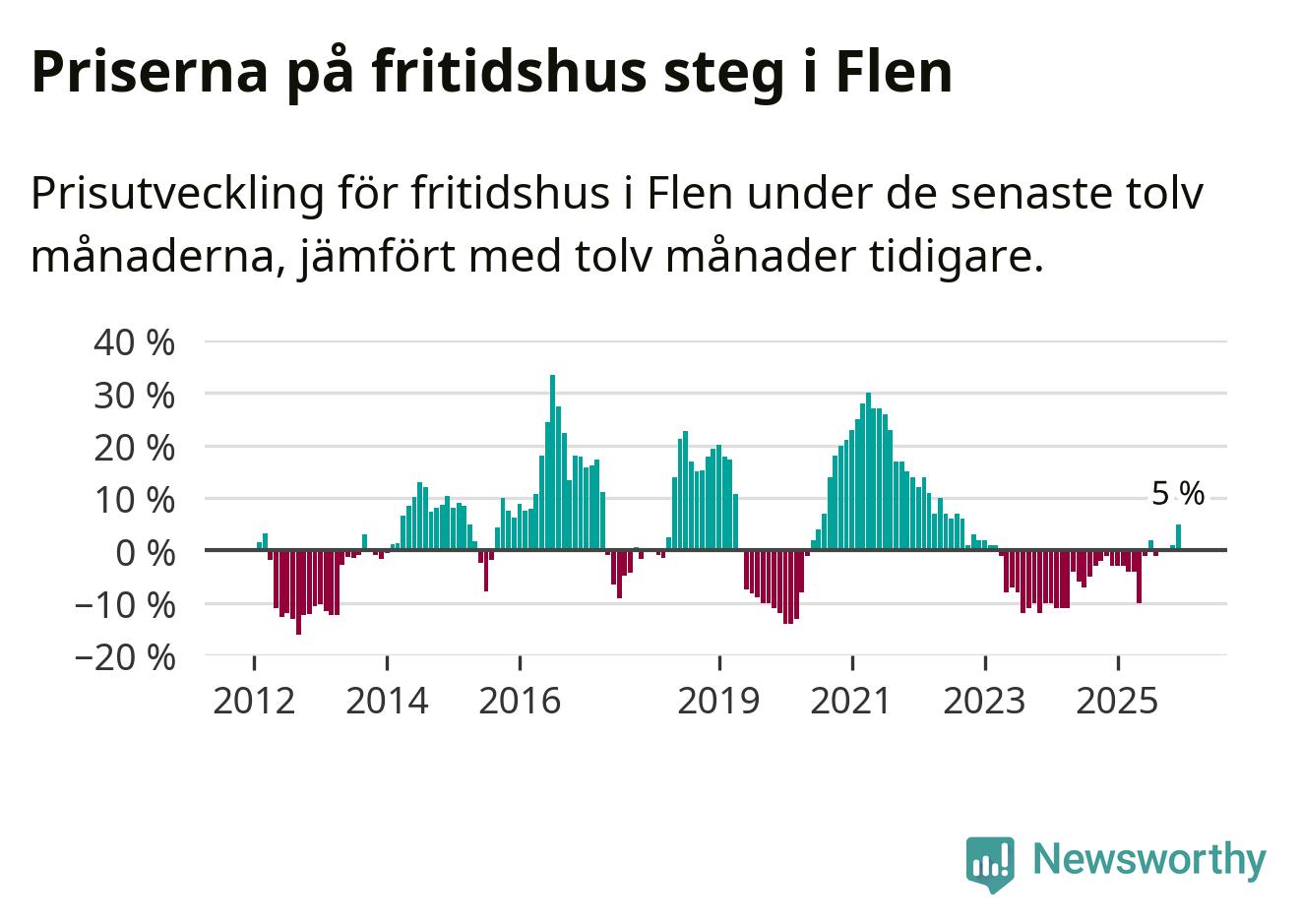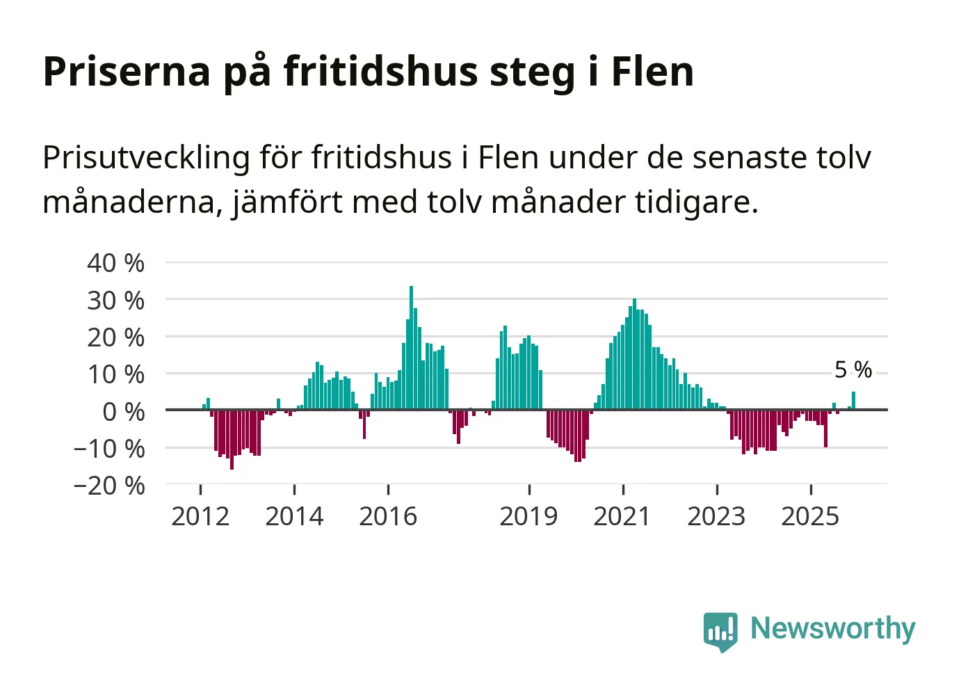 Priserna på fritidshus har gått upp i Flens kommun. Medelpriset på försäljningarna under de senaste tolv månaderna visar på en uppgång med 5 procent.
