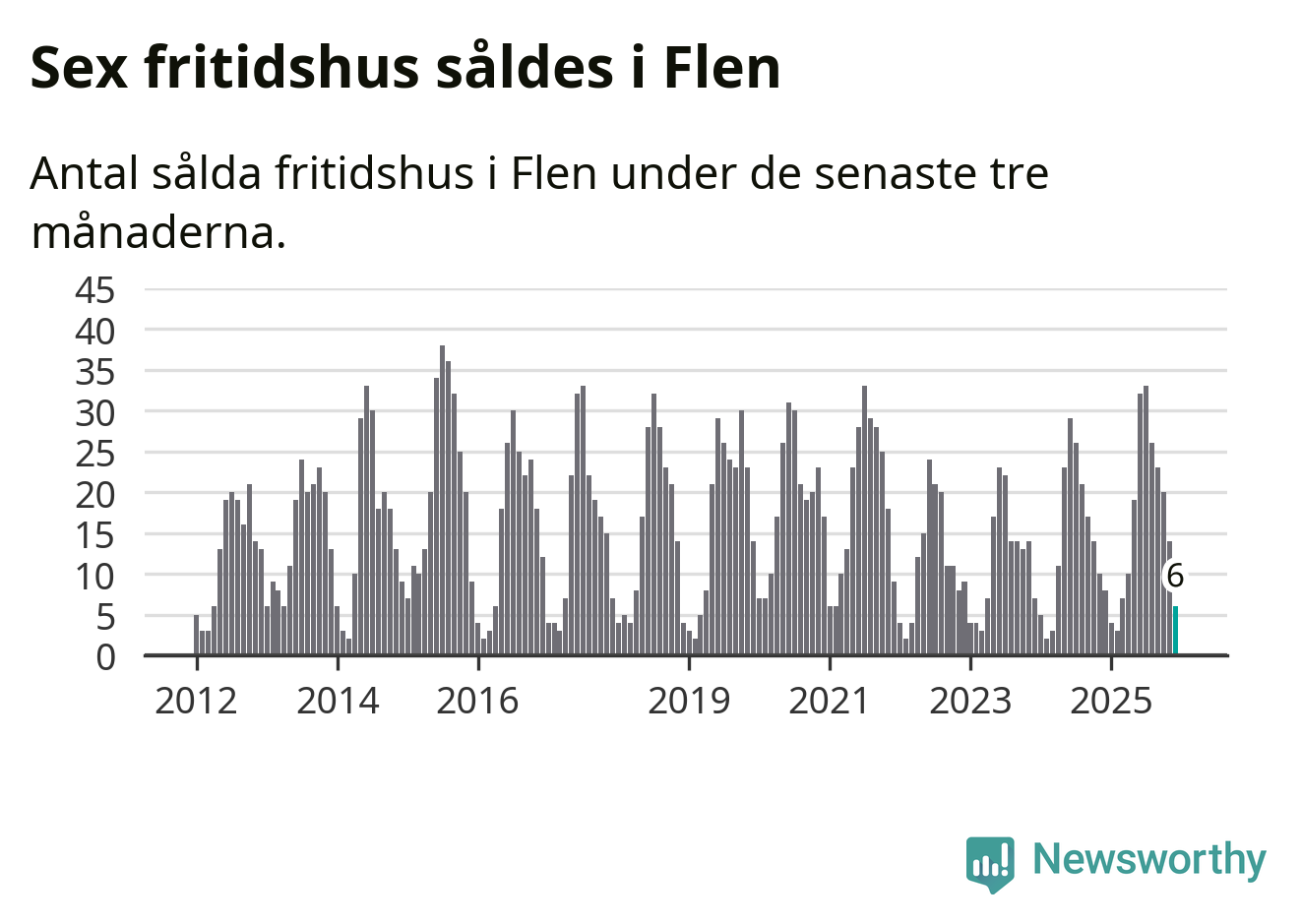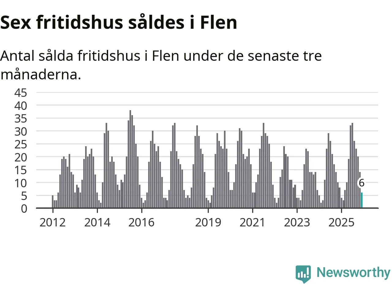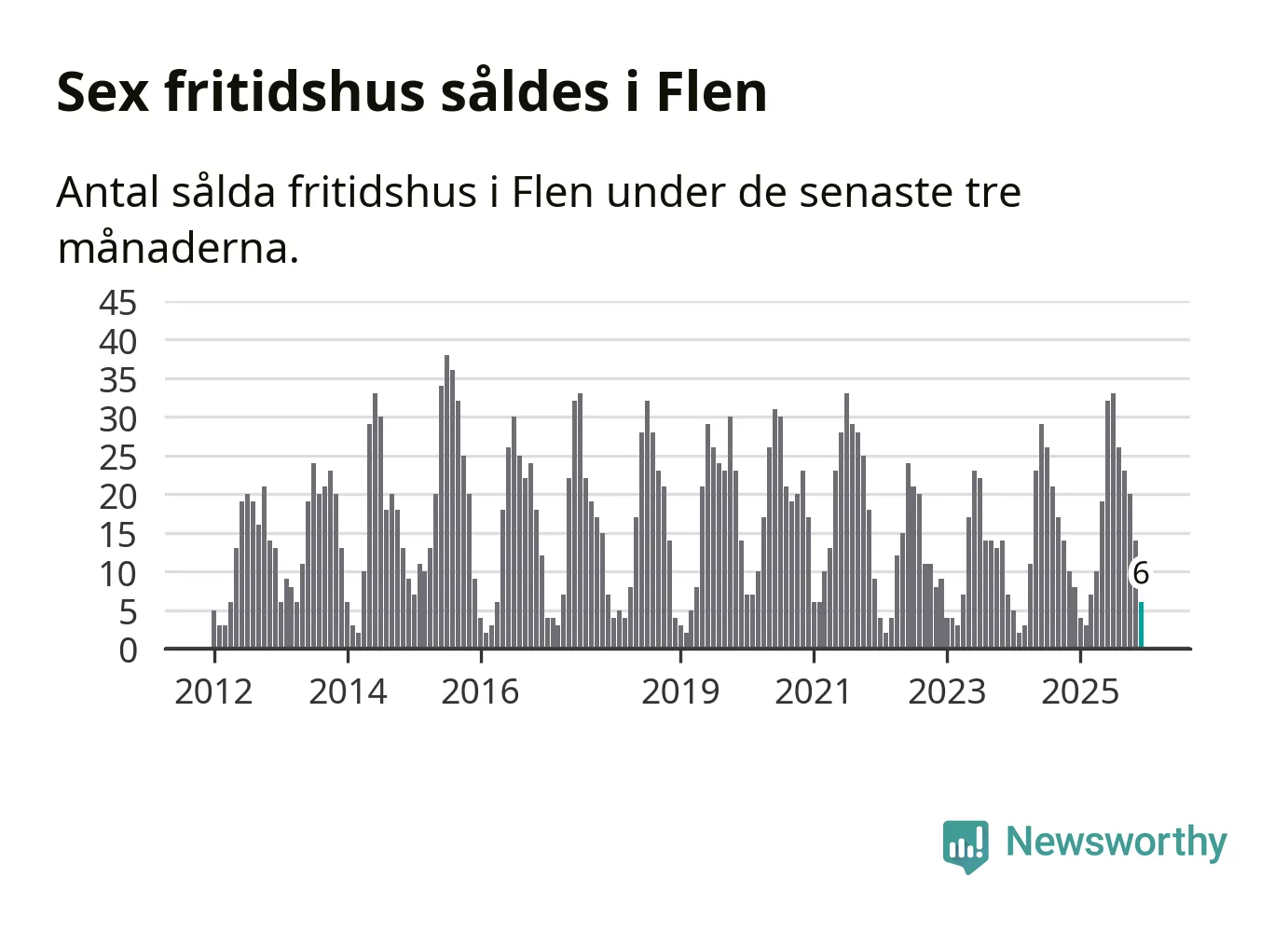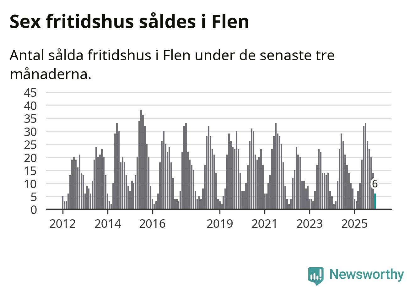 Sammanlagt såldes sex fritidshus i Flens kommun mellan oktober 2025 och december 2025 till ett genomsnittligt pris på 2,4 miljoner kronor. I fjol gjordes åtta affärer vid den här tiden på året.