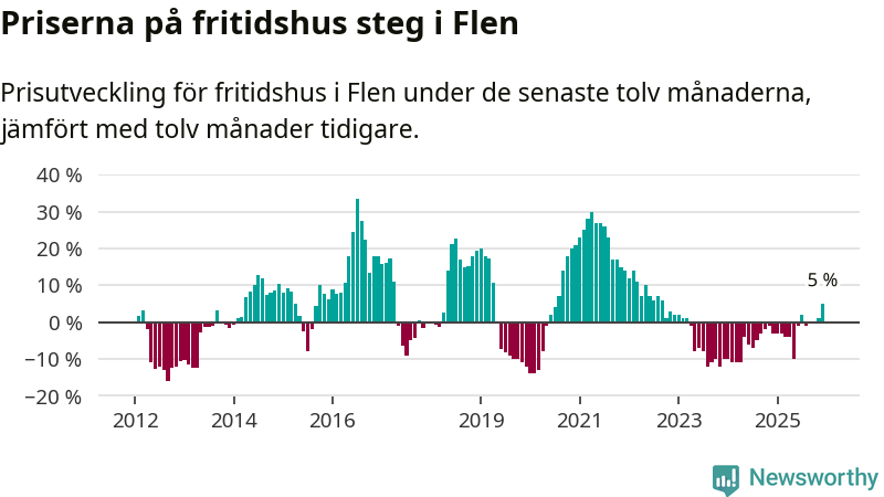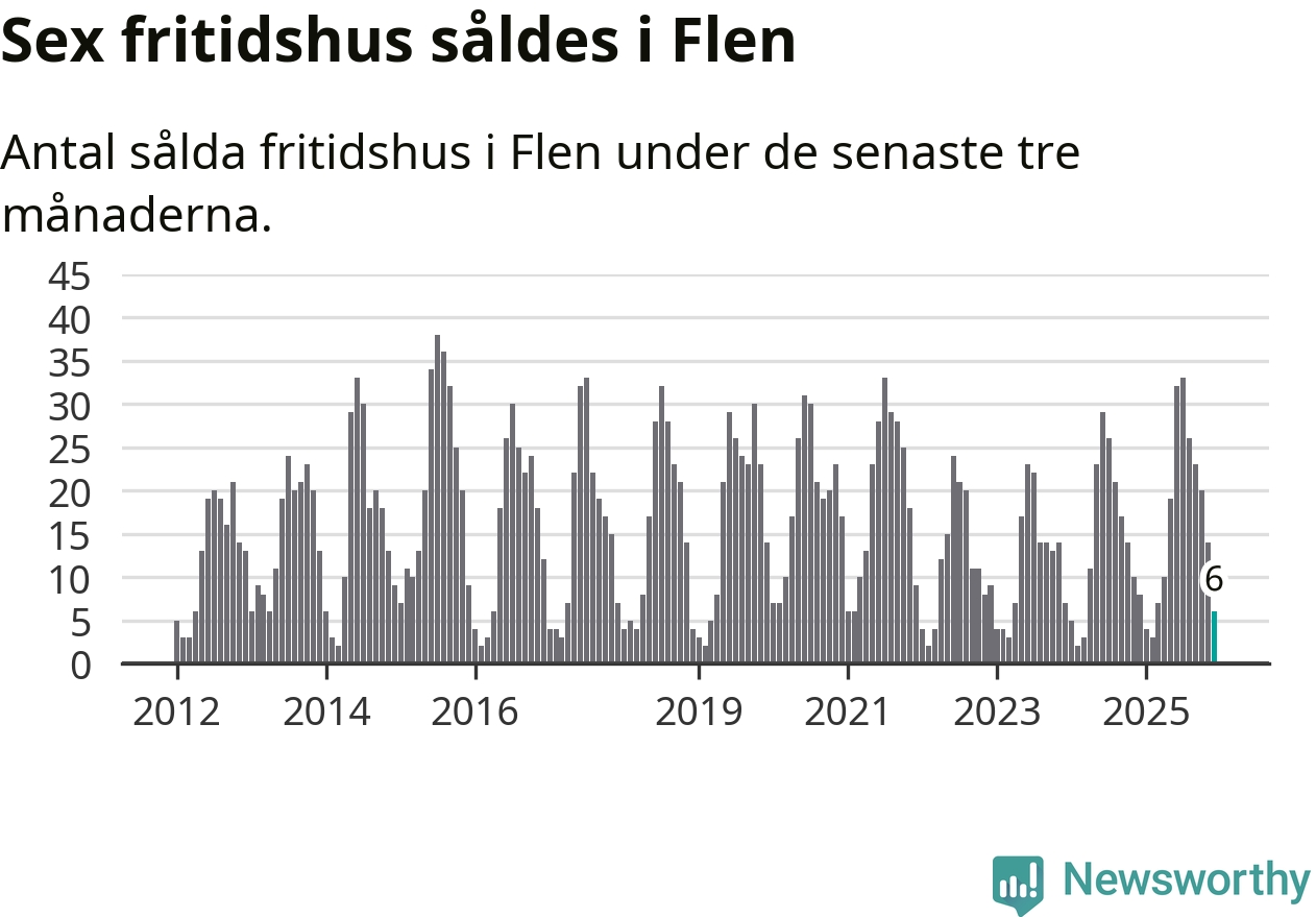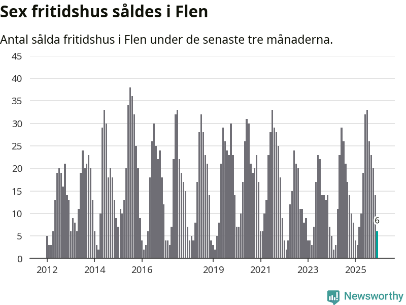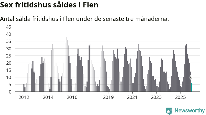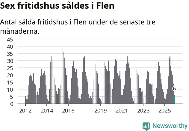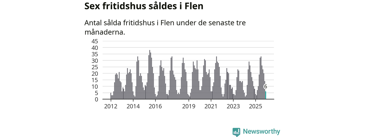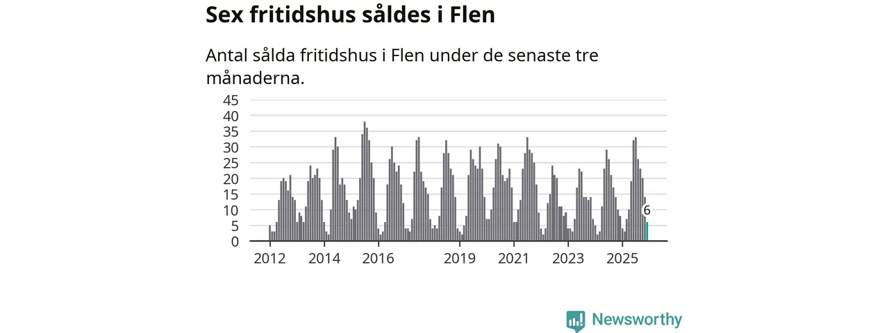 Sammanlagt såldes sex fritidshus i Flens kommun mellan oktober 2025 och december 2025 till ett genomsnittligt pris på 2,4 miljoner kronor. I fjol gjordes åtta affärer vid den här tiden på året.
