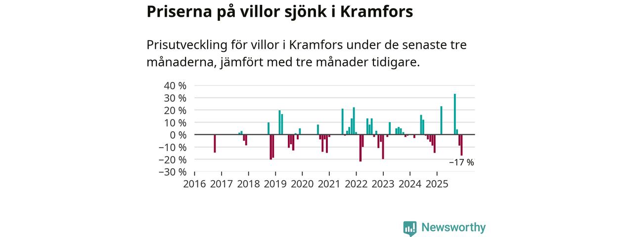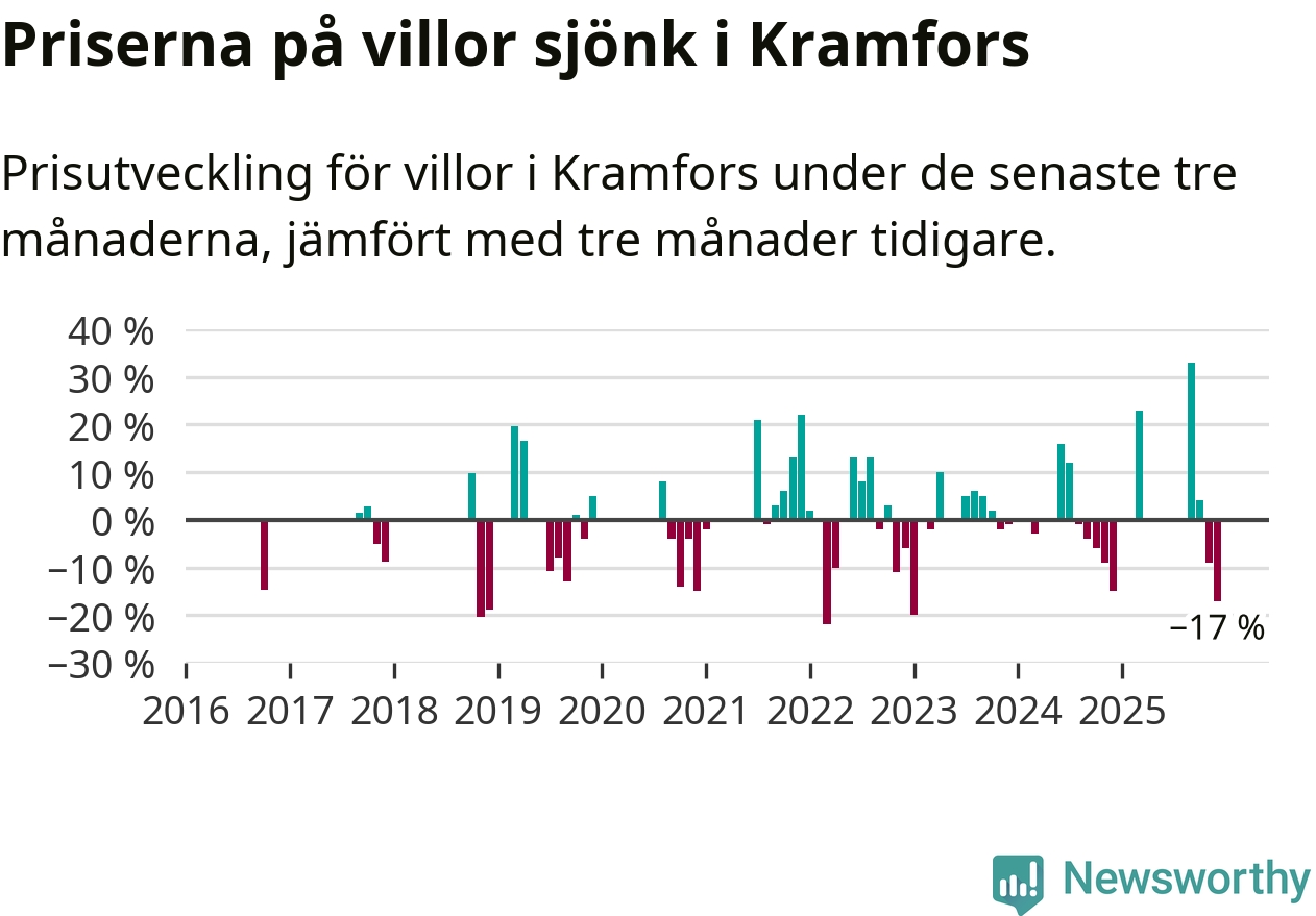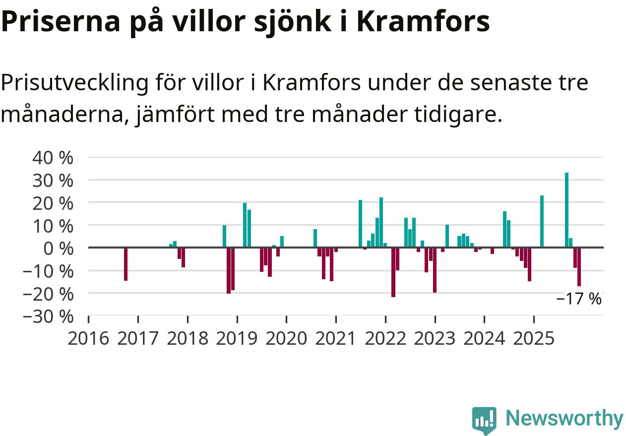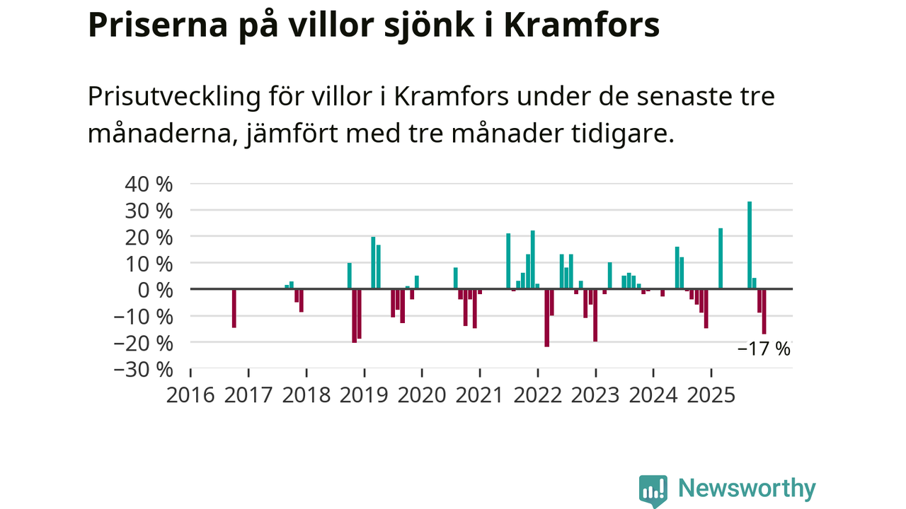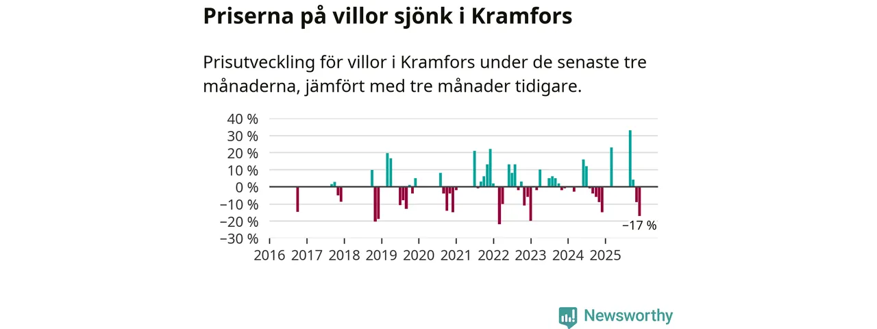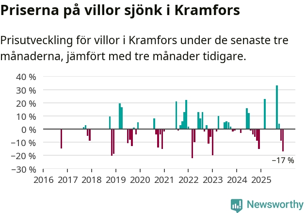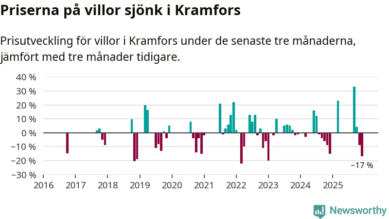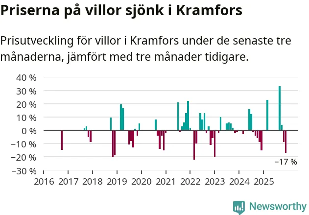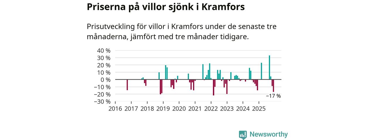 Statistiken visar även på en stor prisnedgång i Kramfors kommun. Medelpriset på försäljningarna av villor i kommunen var 17 procent lägre än för tre månader sedan. Även i hela Västernorrland sjunker villapriserna. I hela länet noterades en prisnedgång på 4 procent.