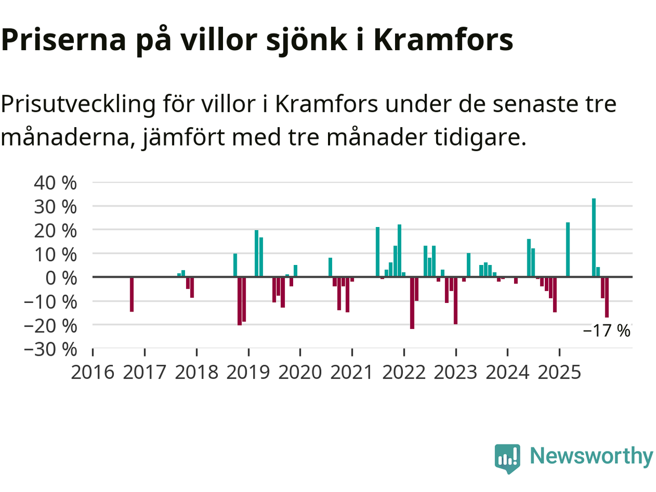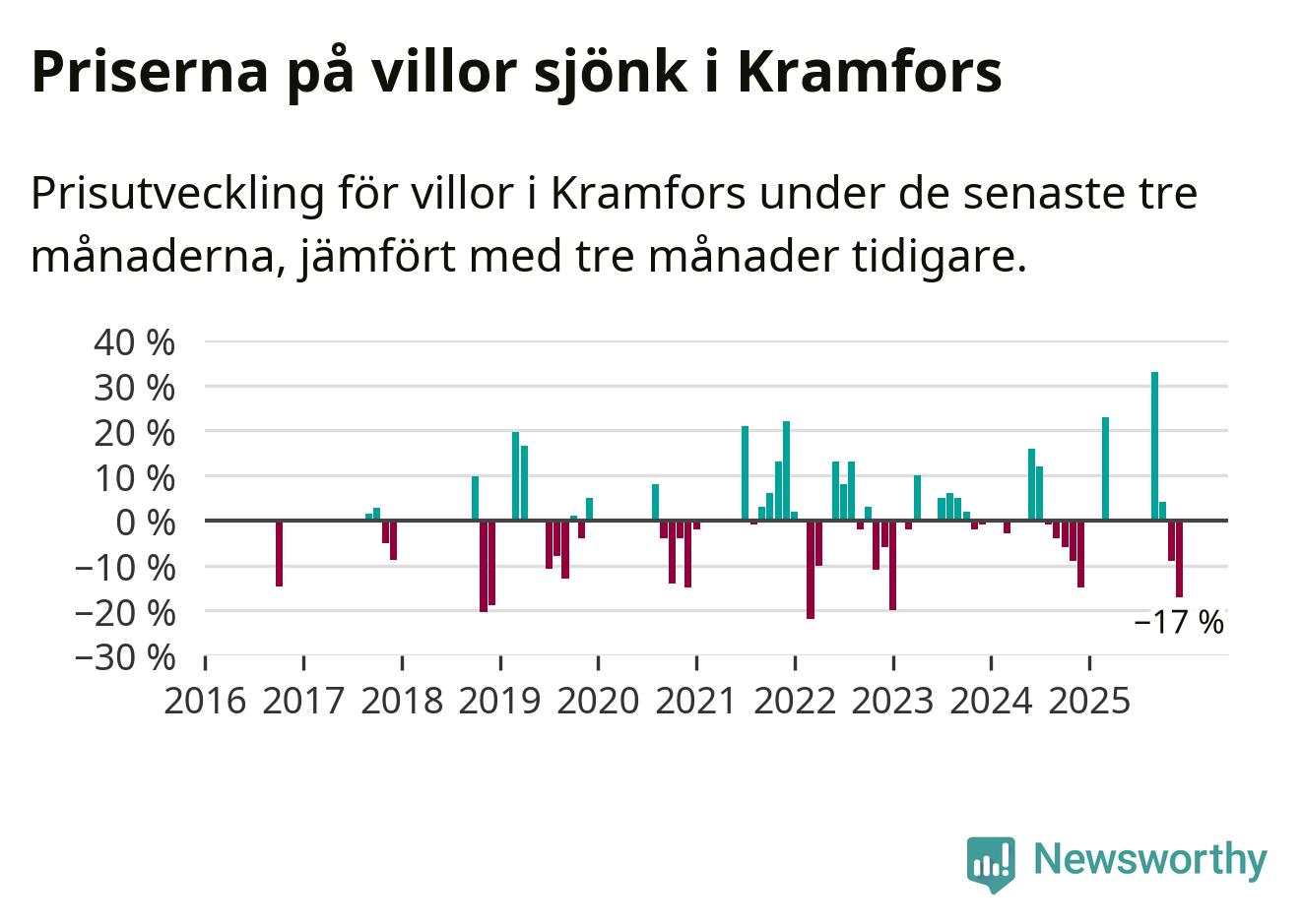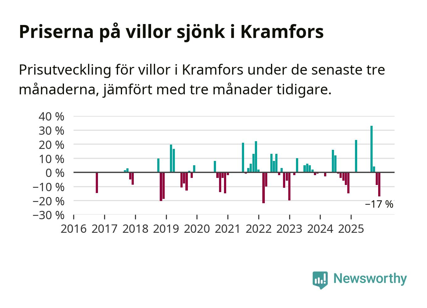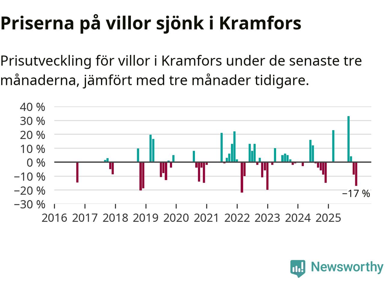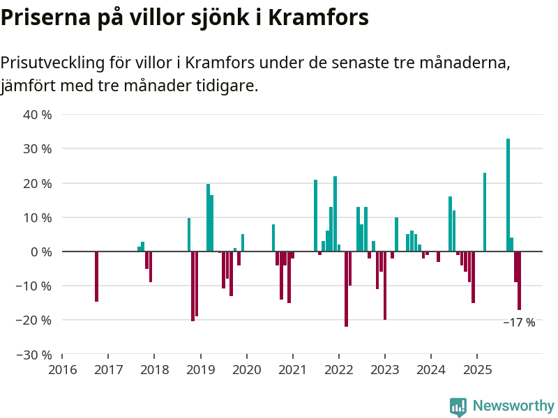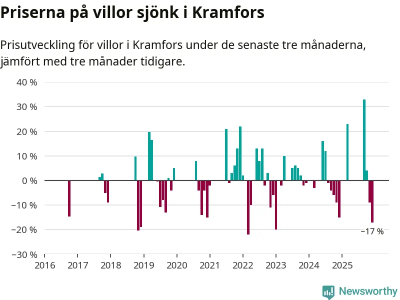 Statistiken visar även på en stor prisnedgång i Kramfors kommun. Medelpriset på försäljningarna av villor i kommunen var 17 procent lägre än för tre månader sedan. Även i hela Västernorrland sjunker villapriserna. I hela länet noterades en prisnedgång på 4 procent.