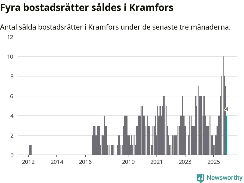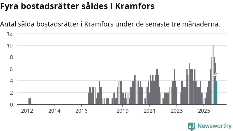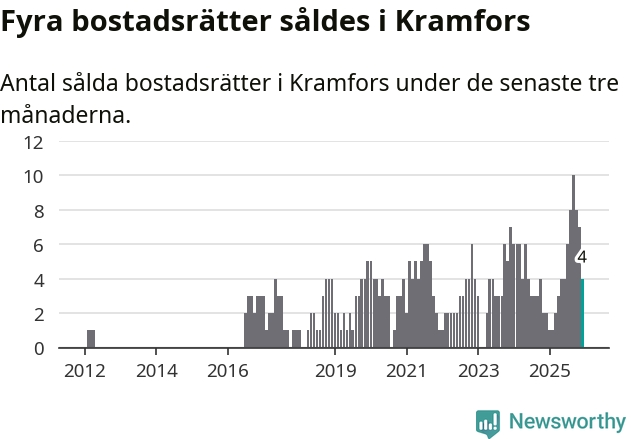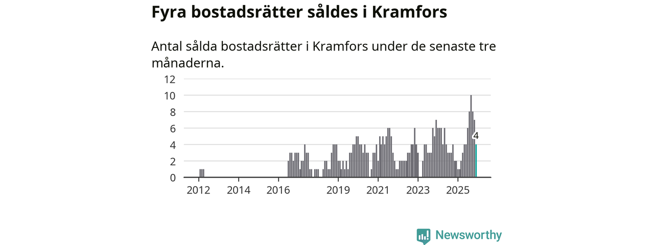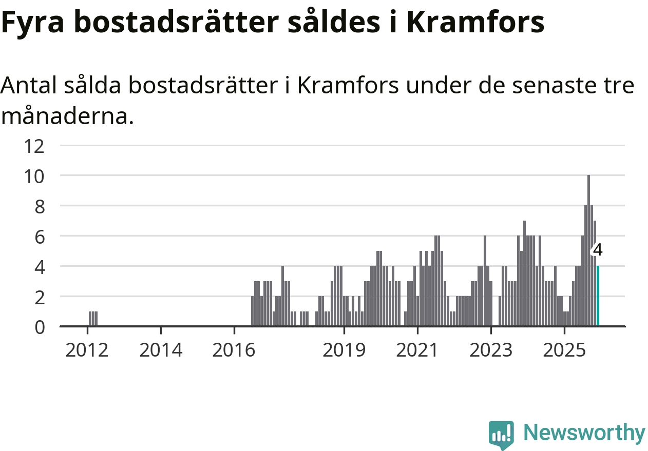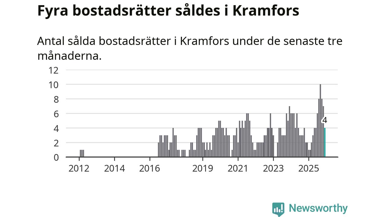 Mellan oktober och december gjordes sammanlagt fyra affärer med bostadsrätter i Kramfors kommun. Det kan jämföras med två vid motsvarande tid i fjol.