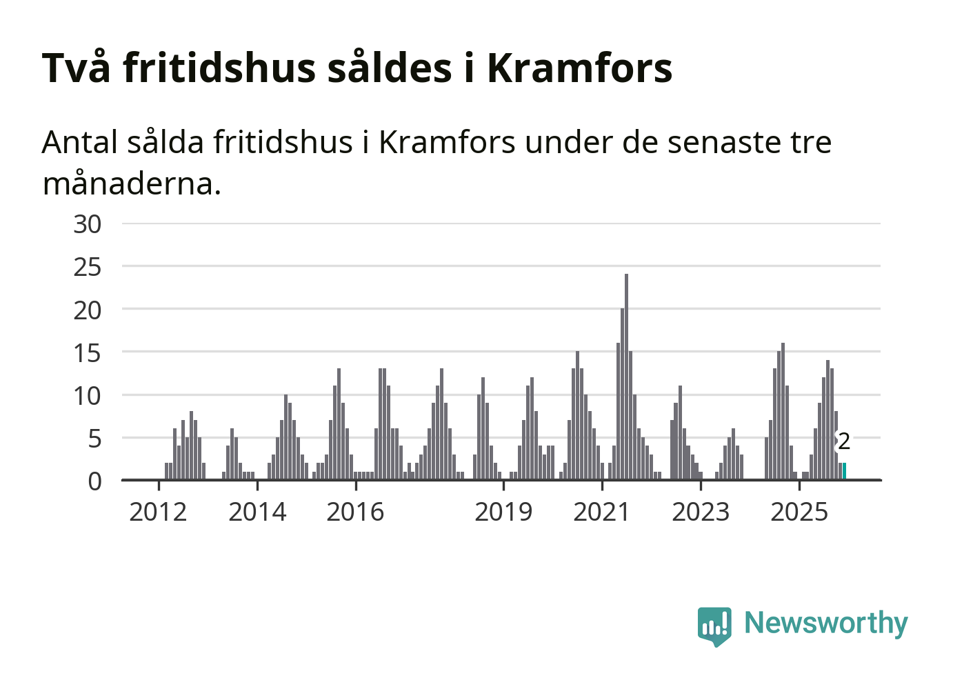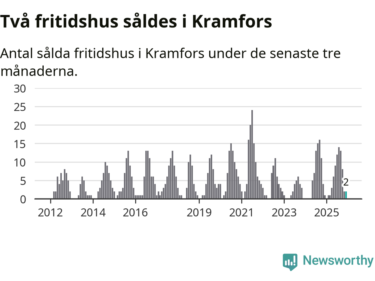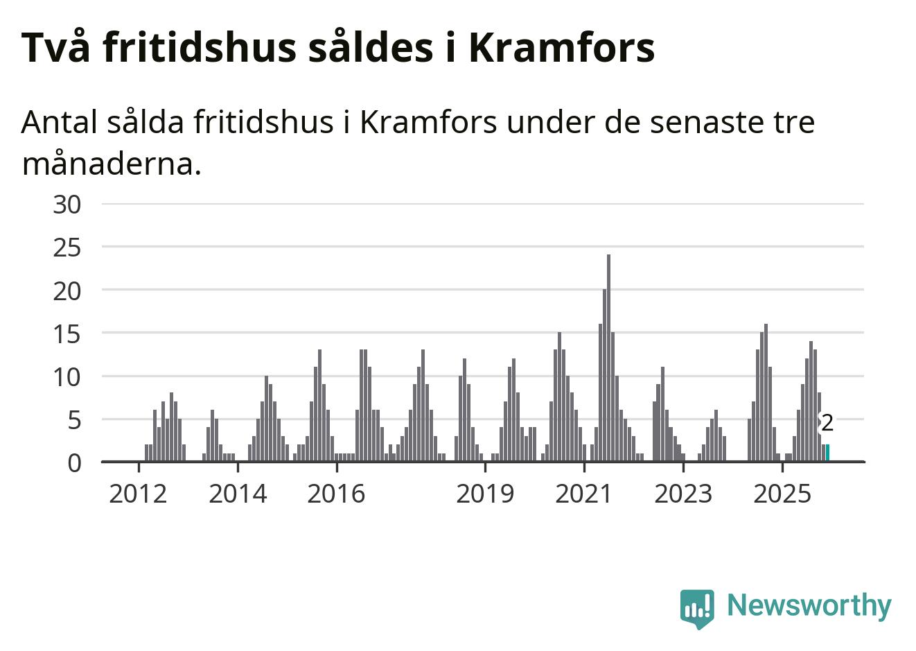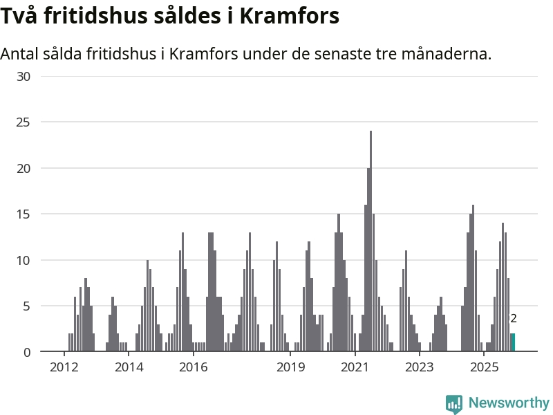 Mellan oktober och december gjordes sammanlagt två affärer med fritidshus i Kramfors kommun. Det kan jämföras med ett vid motsvarande tid i fjol.