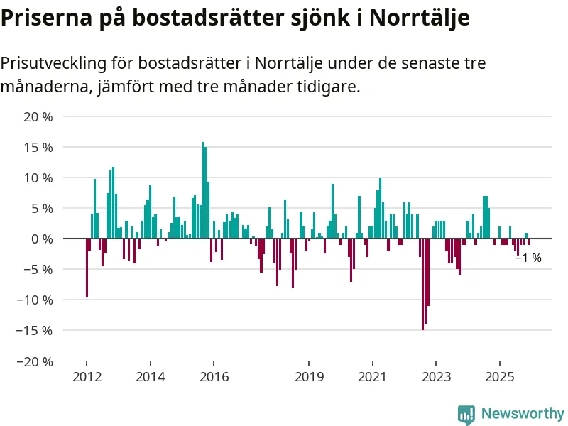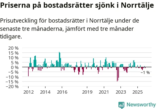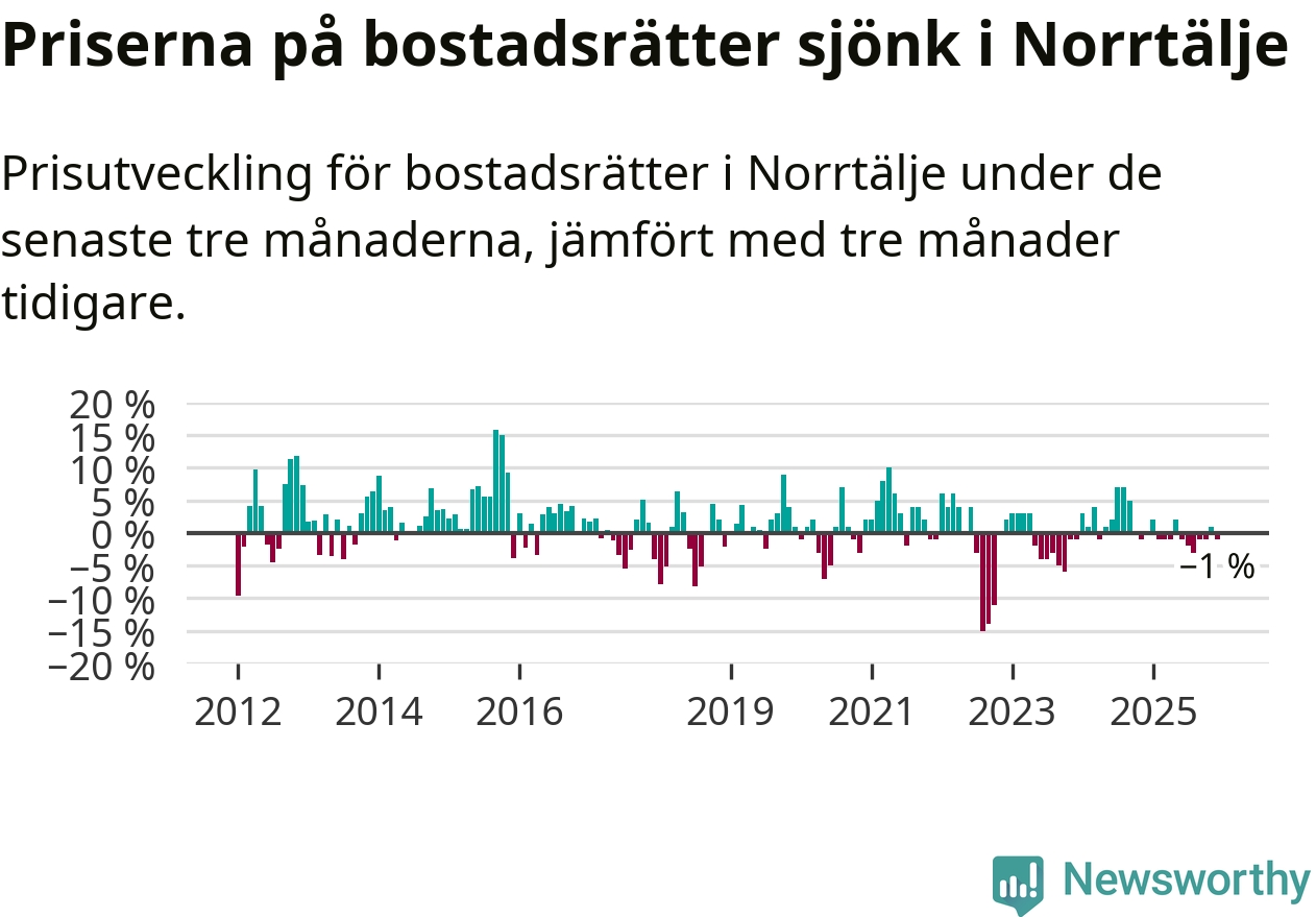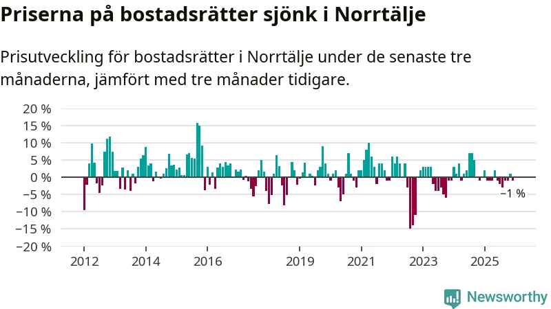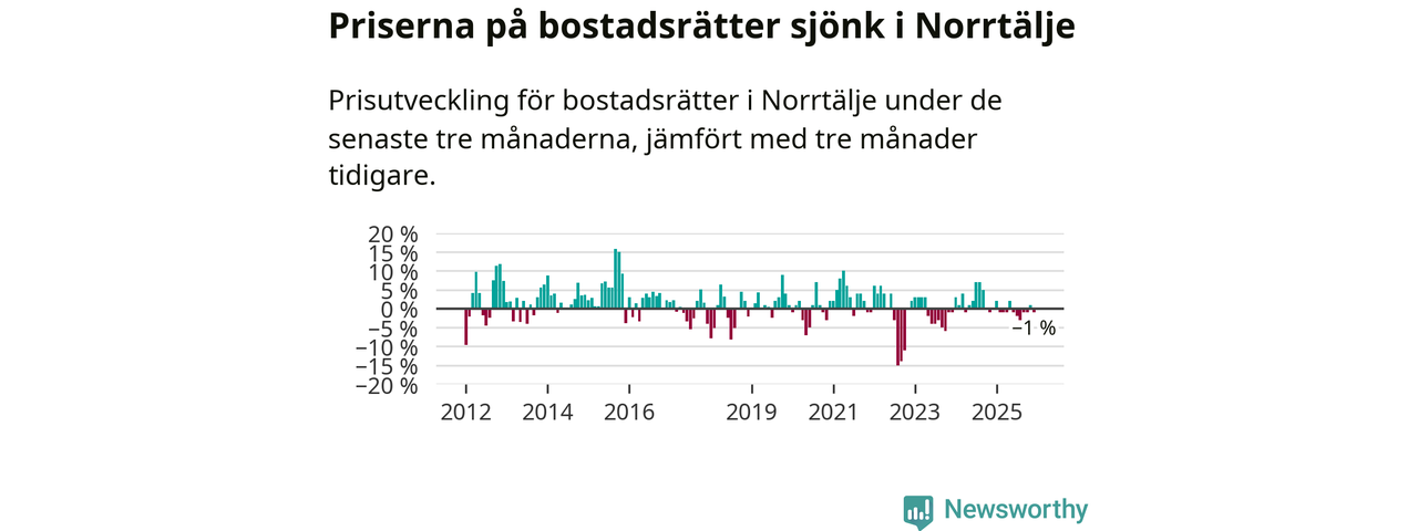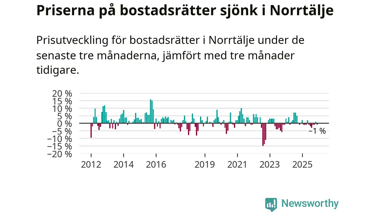 Priserna på bostadsrätter har gått ner i Norrtälje kommun. Medelpriset på försäljningarna under de senaste tre månaderna visar på en nedgång med 1 procent.