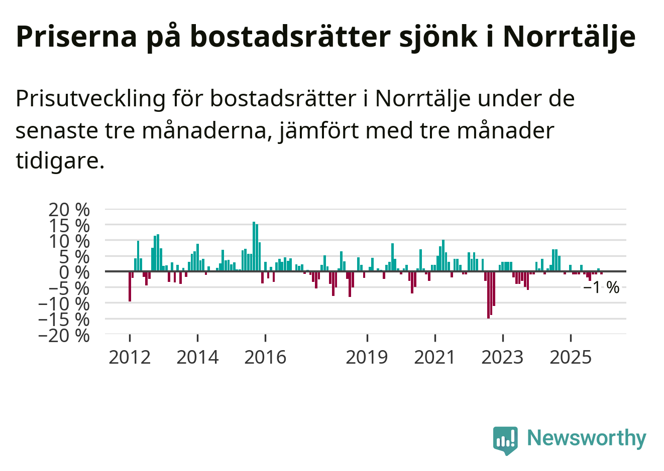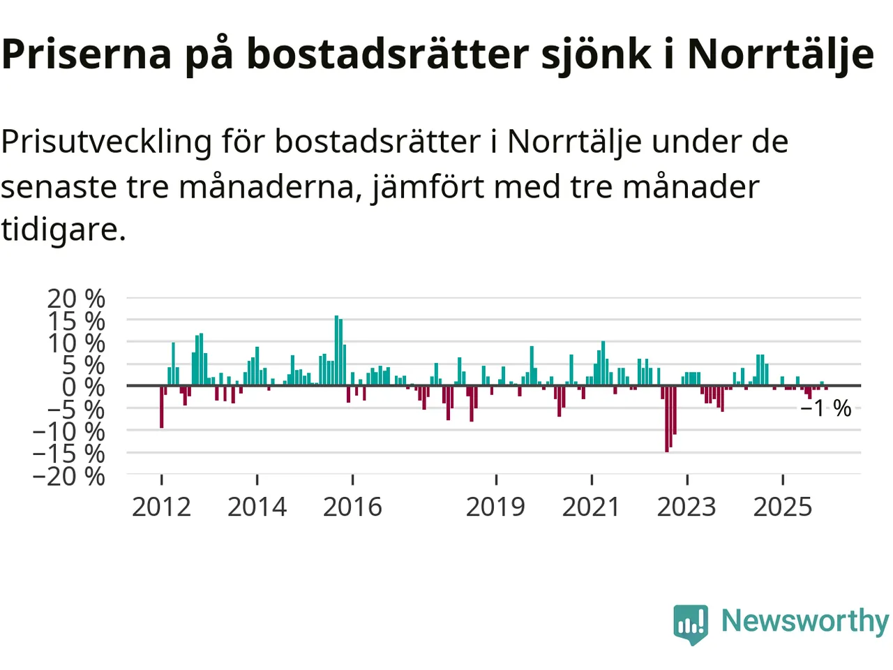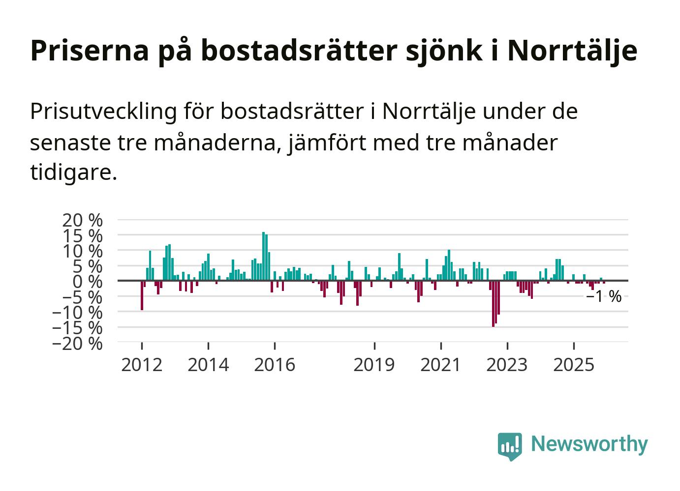 Priserna på bostadsrätter har gått ner i Norrtälje kommun. Medelpriset på försäljningarna under de senaste tre månaderna visar på en nedgång med 1 procent.