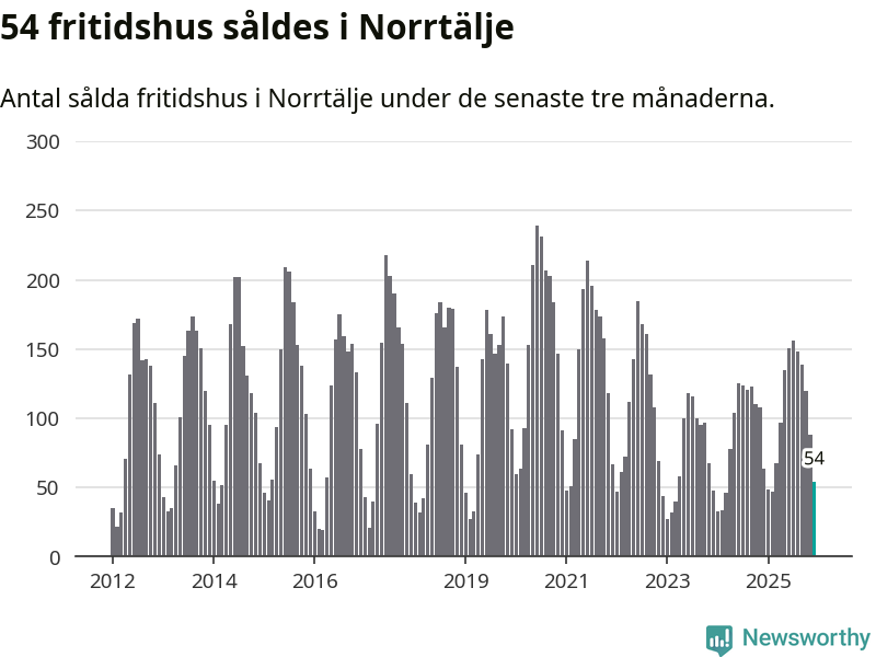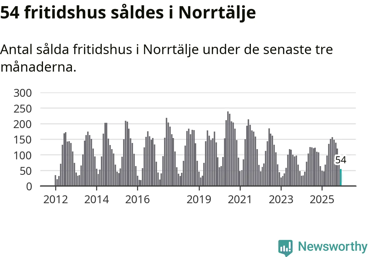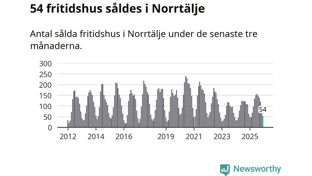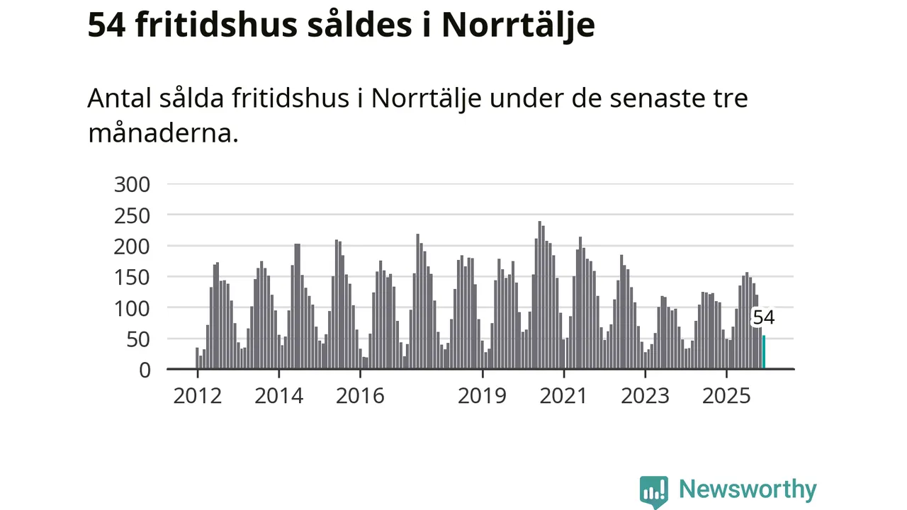 Sammanlagt såldes 54 fritidshus i Norrtälje kommun mellan oktober 2025 och december 2025 till ett genomsnittligt pris på 2,8 miljoner kronor. I fjol gjordes 64 affärer vid den här tiden på året.