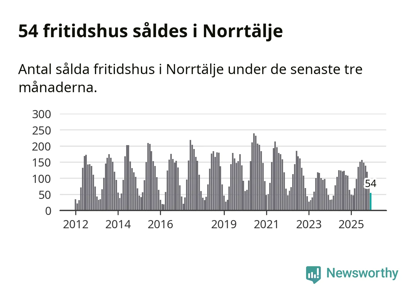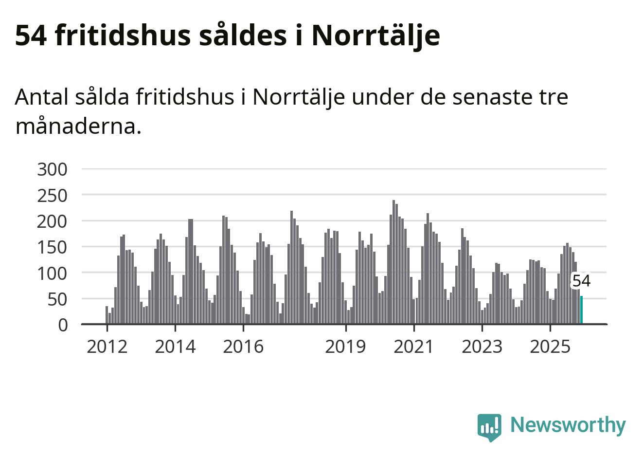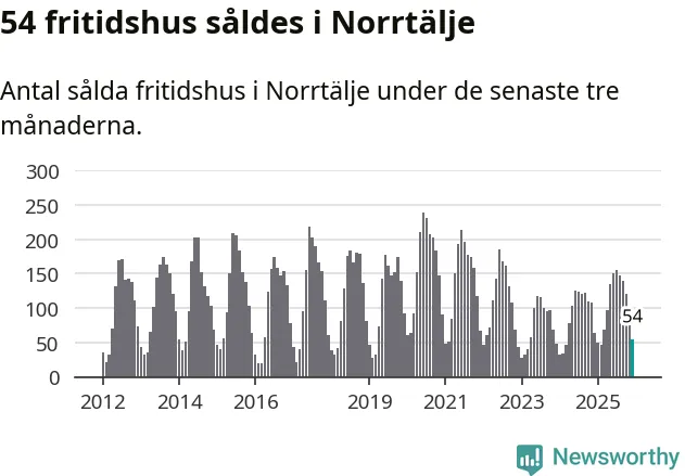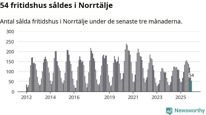 Sammanlagt såldes 54 fritidshus i Norrtälje kommun mellan oktober 2025 och december 2025 till ett genomsnittligt pris på 2,8 miljoner kronor. I fjol gjordes 64 affärer vid den här tiden på året.