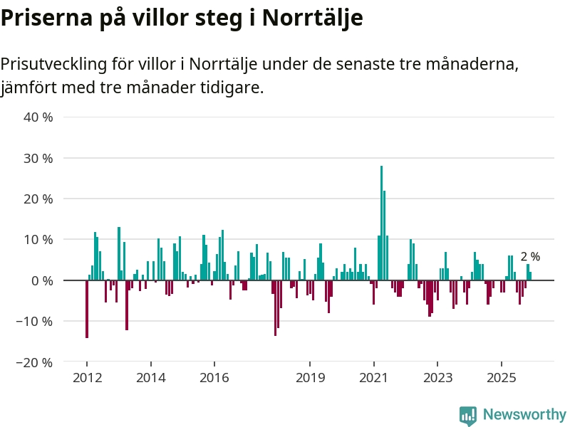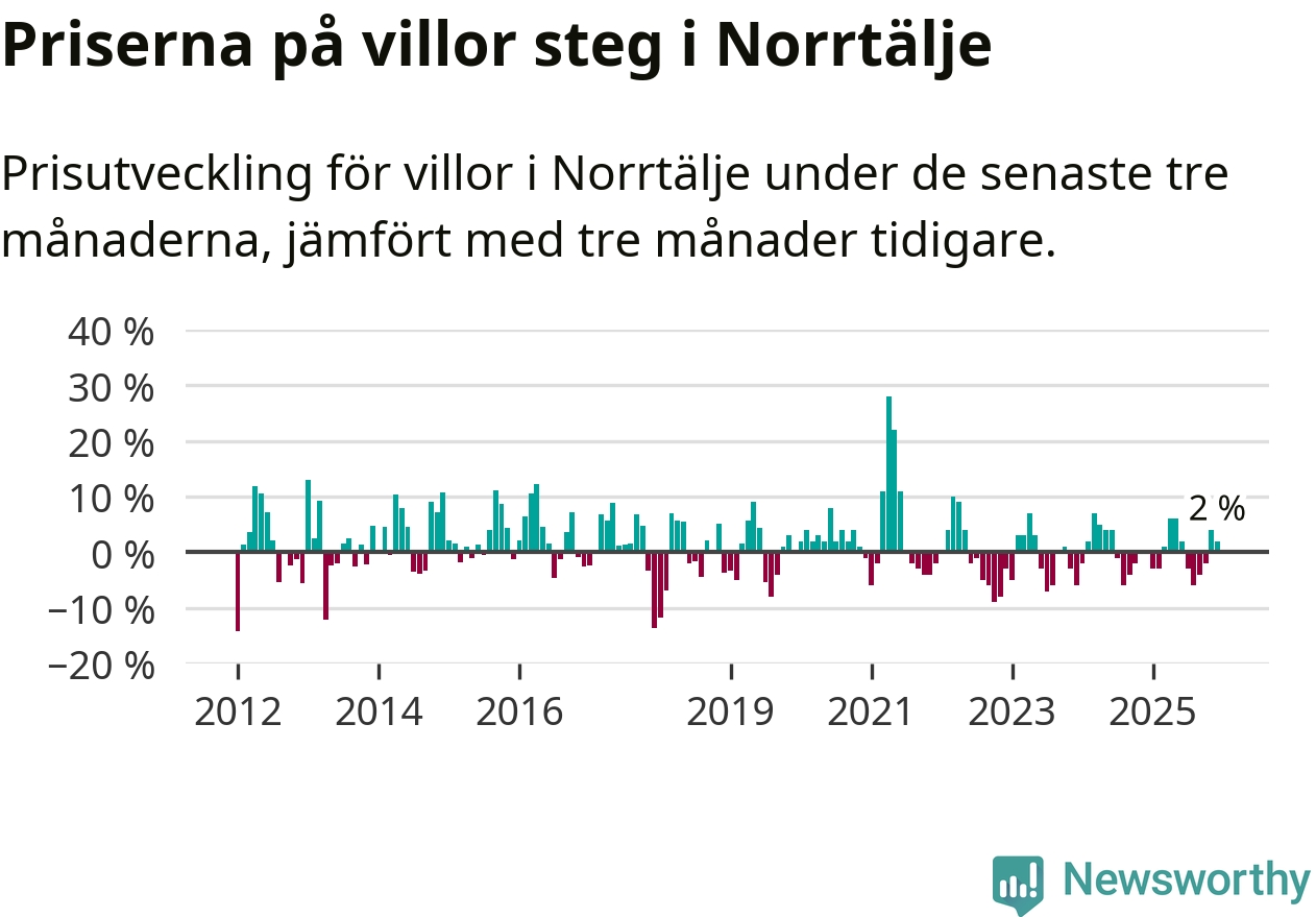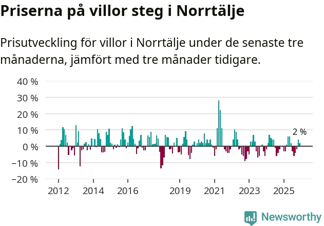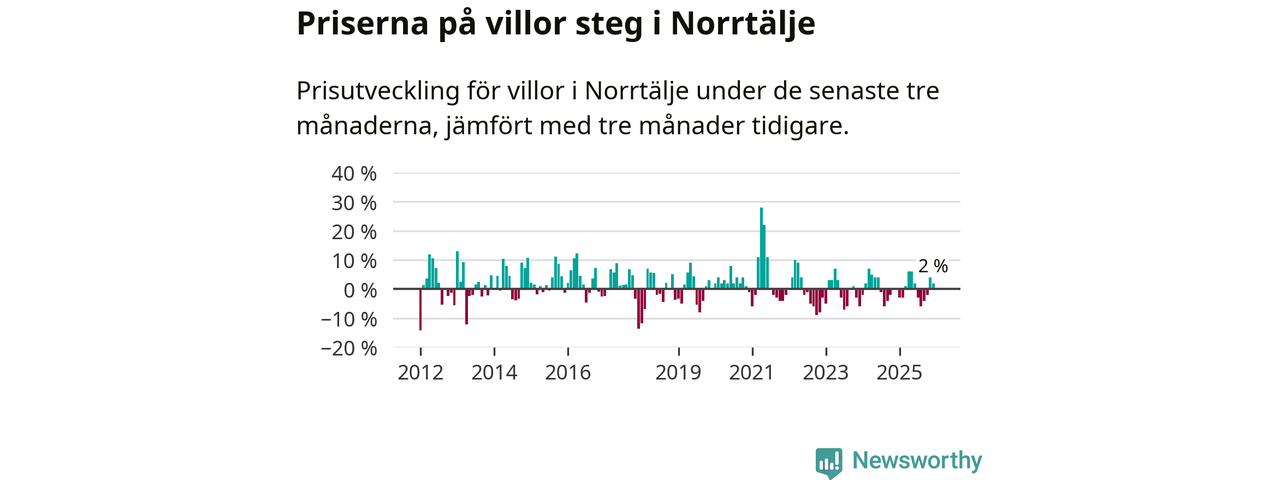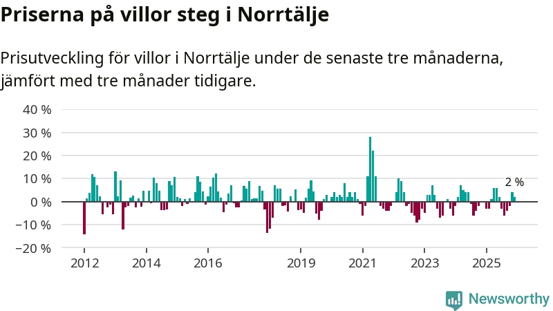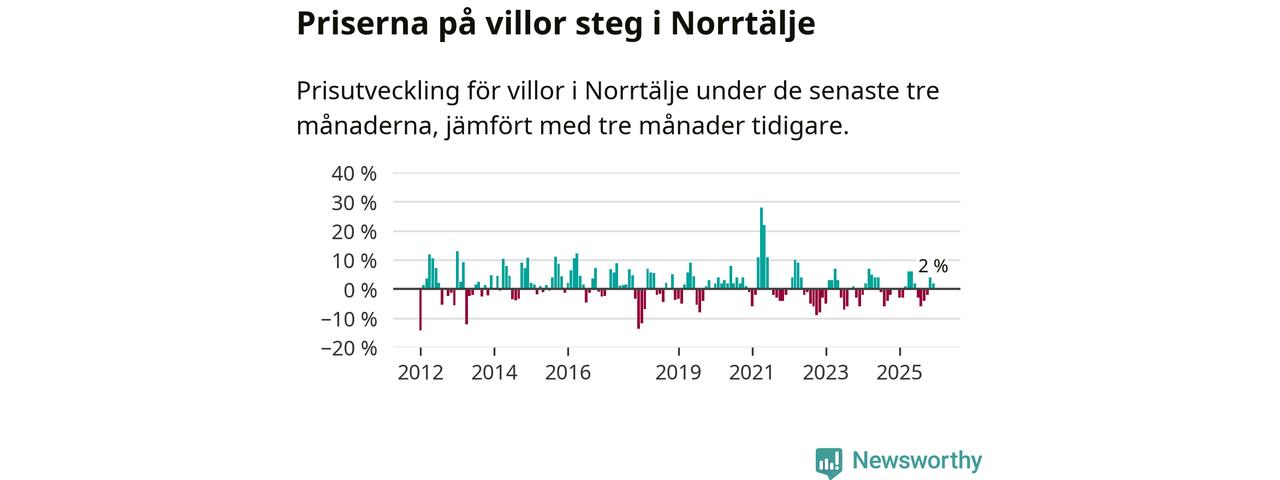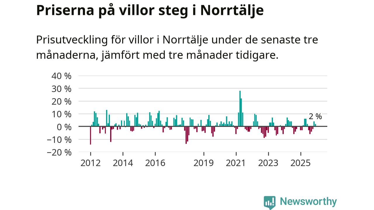 Villapriserna har gått upp i Norrtälje kommun. Medelpriset på försäljningarna under de senaste tre månaderna visar på en uppgång med 2 procent.
