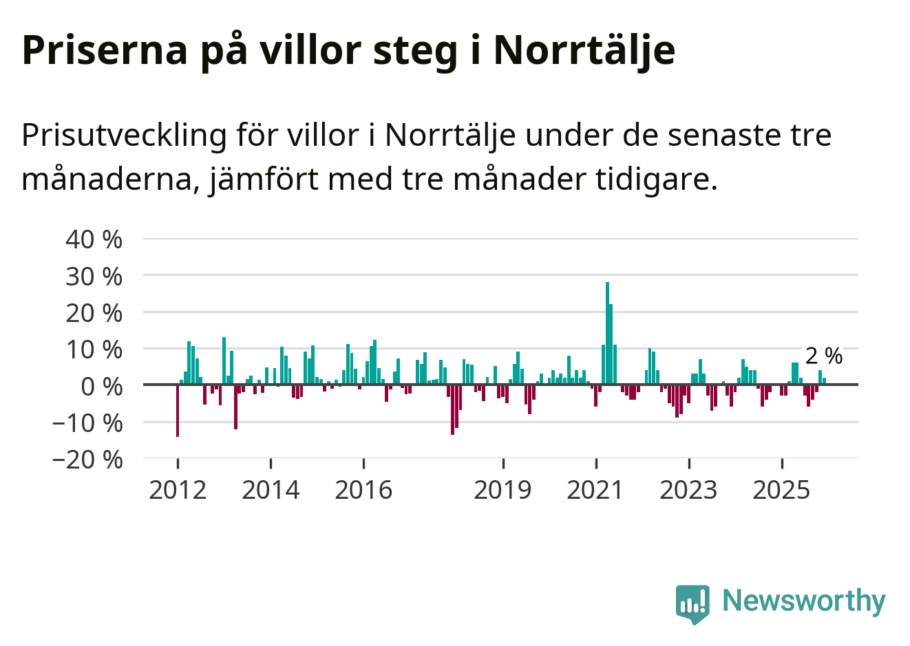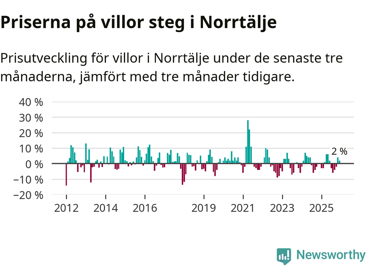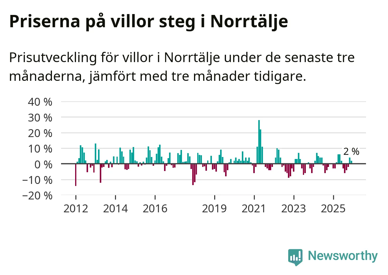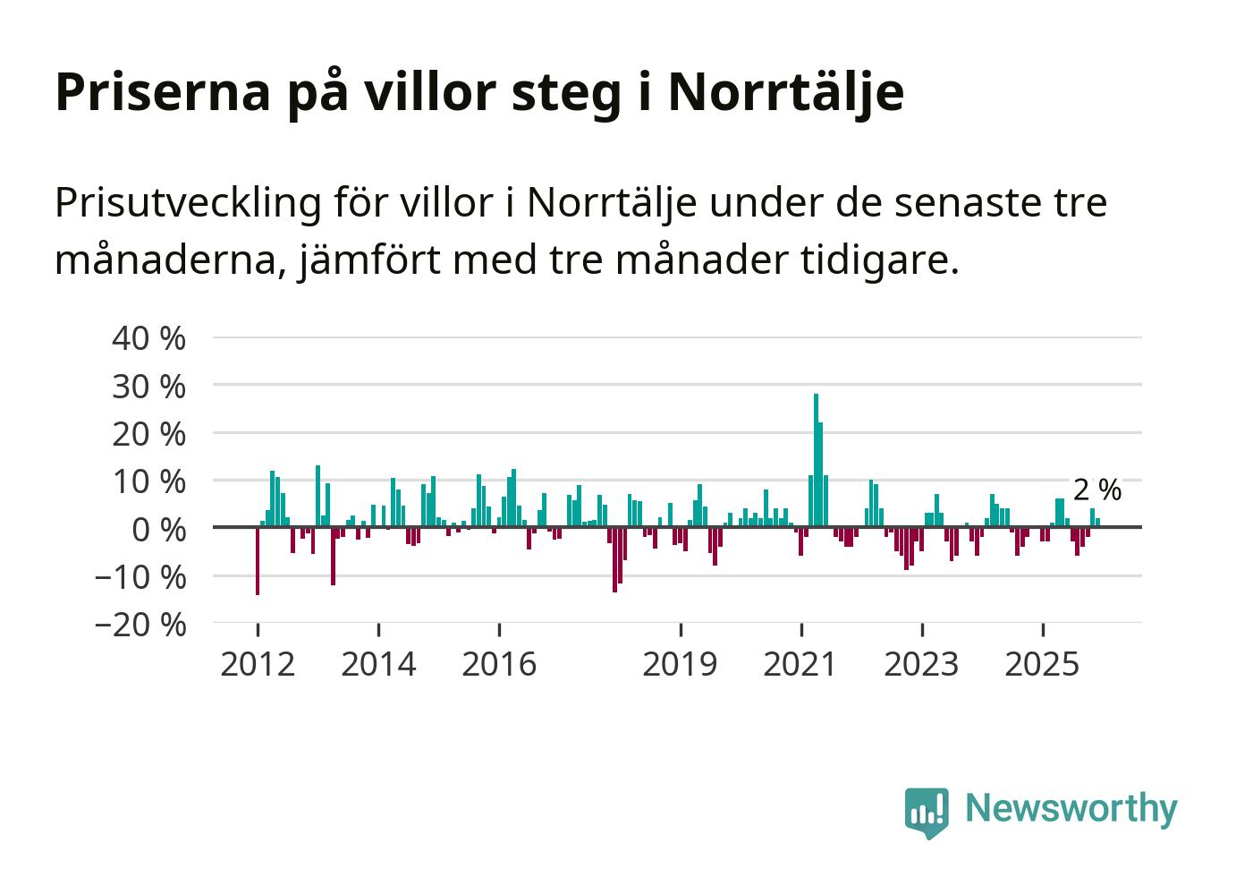 Villapriserna har gått upp i Norrtälje kommun. Medelpriset på försäljningarna under de senaste tre månaderna visar på en uppgång med 2 procent.