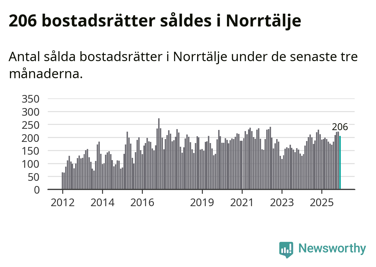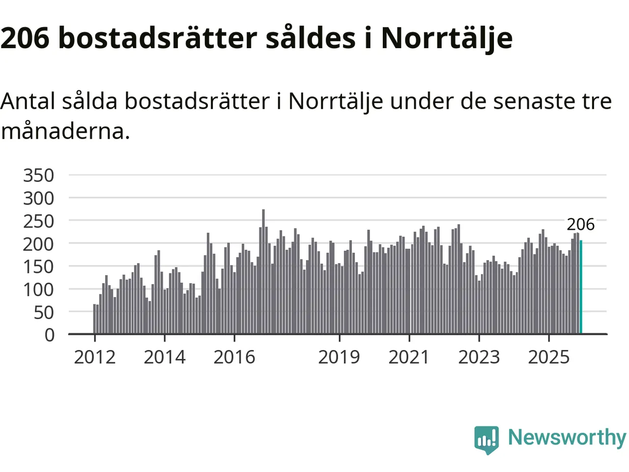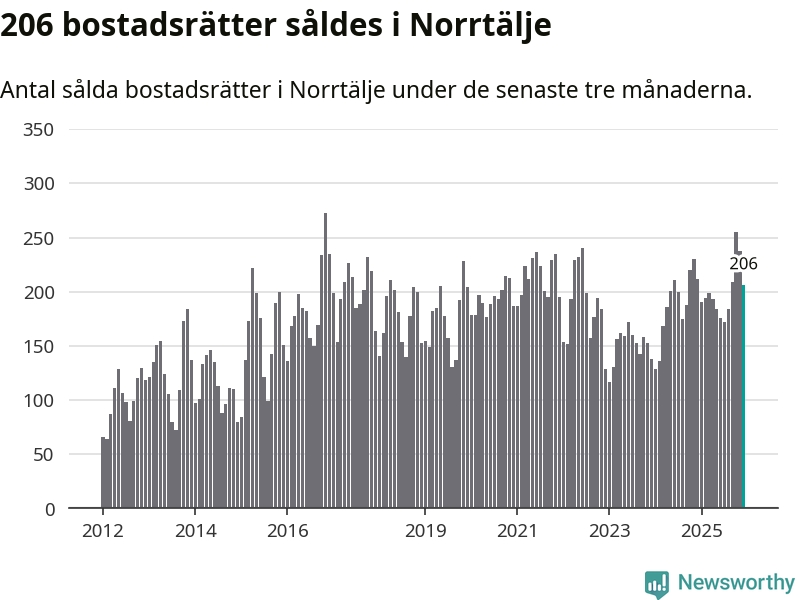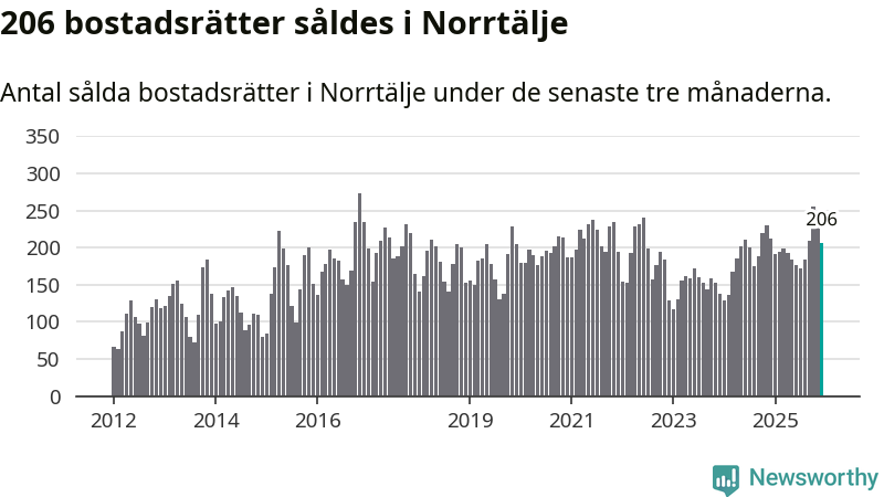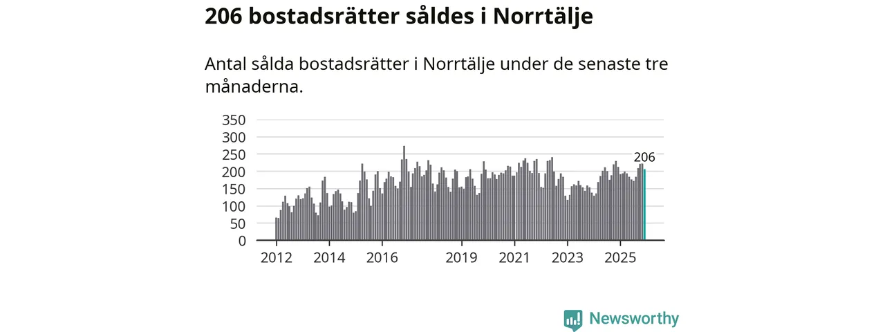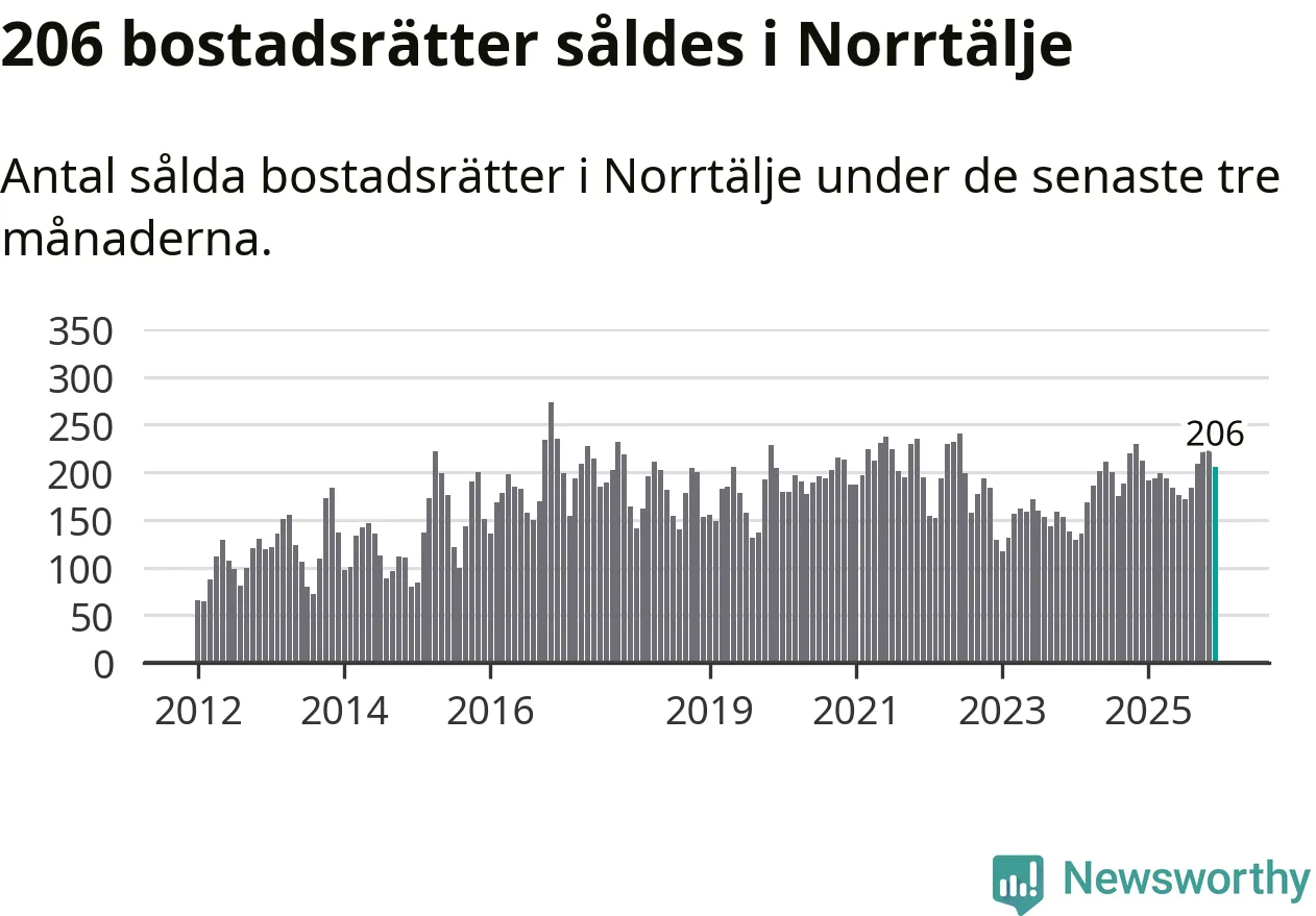 Sammanlagt såldes 206 bostadsrätter i Norrtälje kommun mellan oktober och december till ett genomsnittligt pris på 2,1 miljoner kronor. I fjol gjordes 212 affärer vid den här tiden på året.