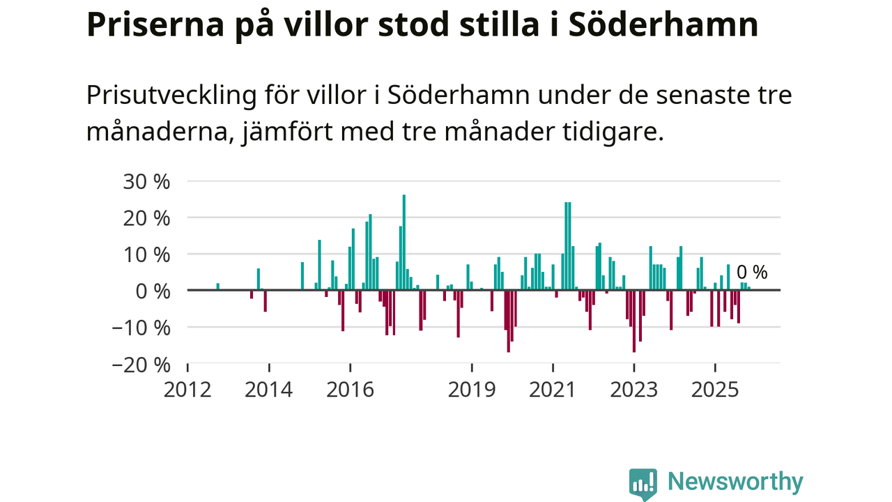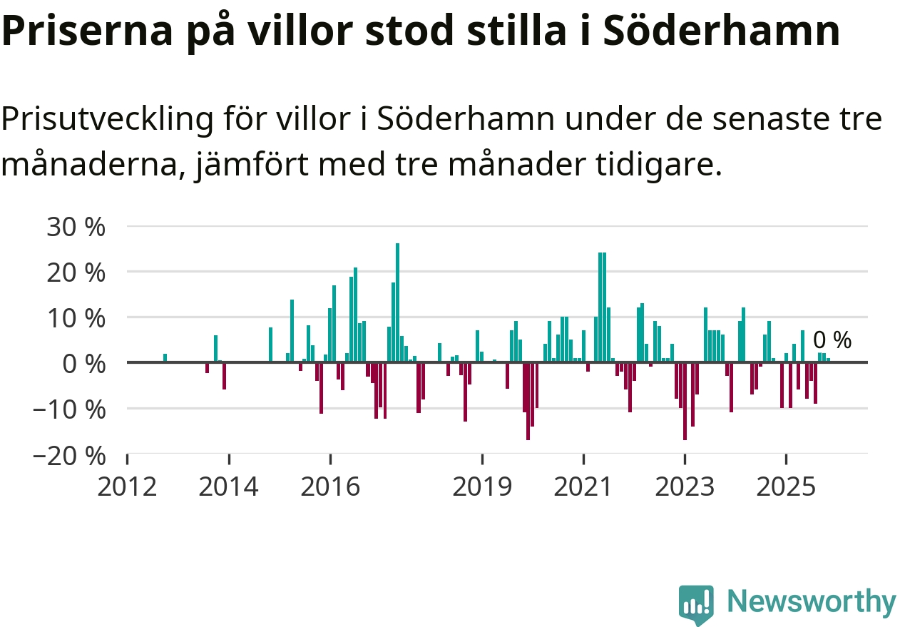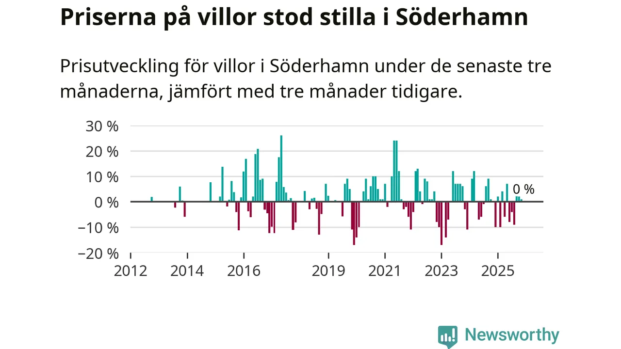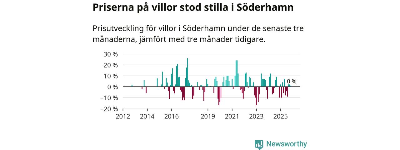 Villapriserna står i stort sett stilla i Söderhamns kommun. Medelpriset på de på försäljningarna under de senaste tre månaderna låg på samma nivå som för tre månader sedan.