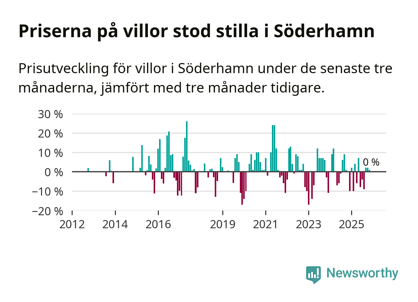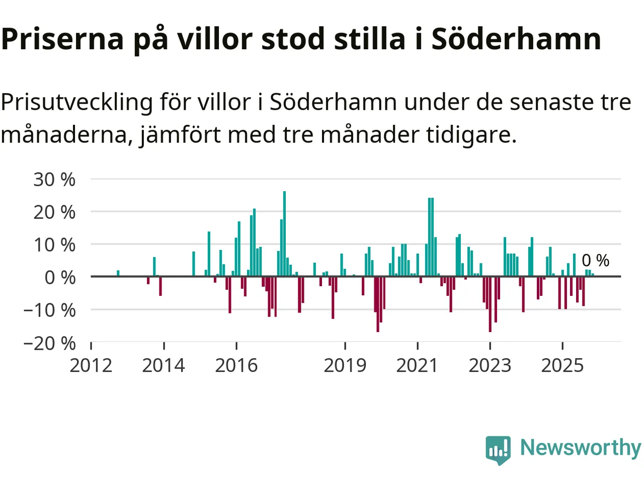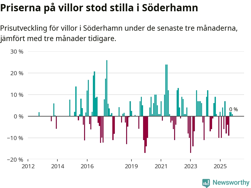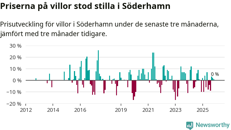Villapriserna står i stort sett stilla i Söderhamns kommun. Medelpriset på de på försäljningarna under de senaste tre månaderna låg på samma nivå som för tre månader sedan.