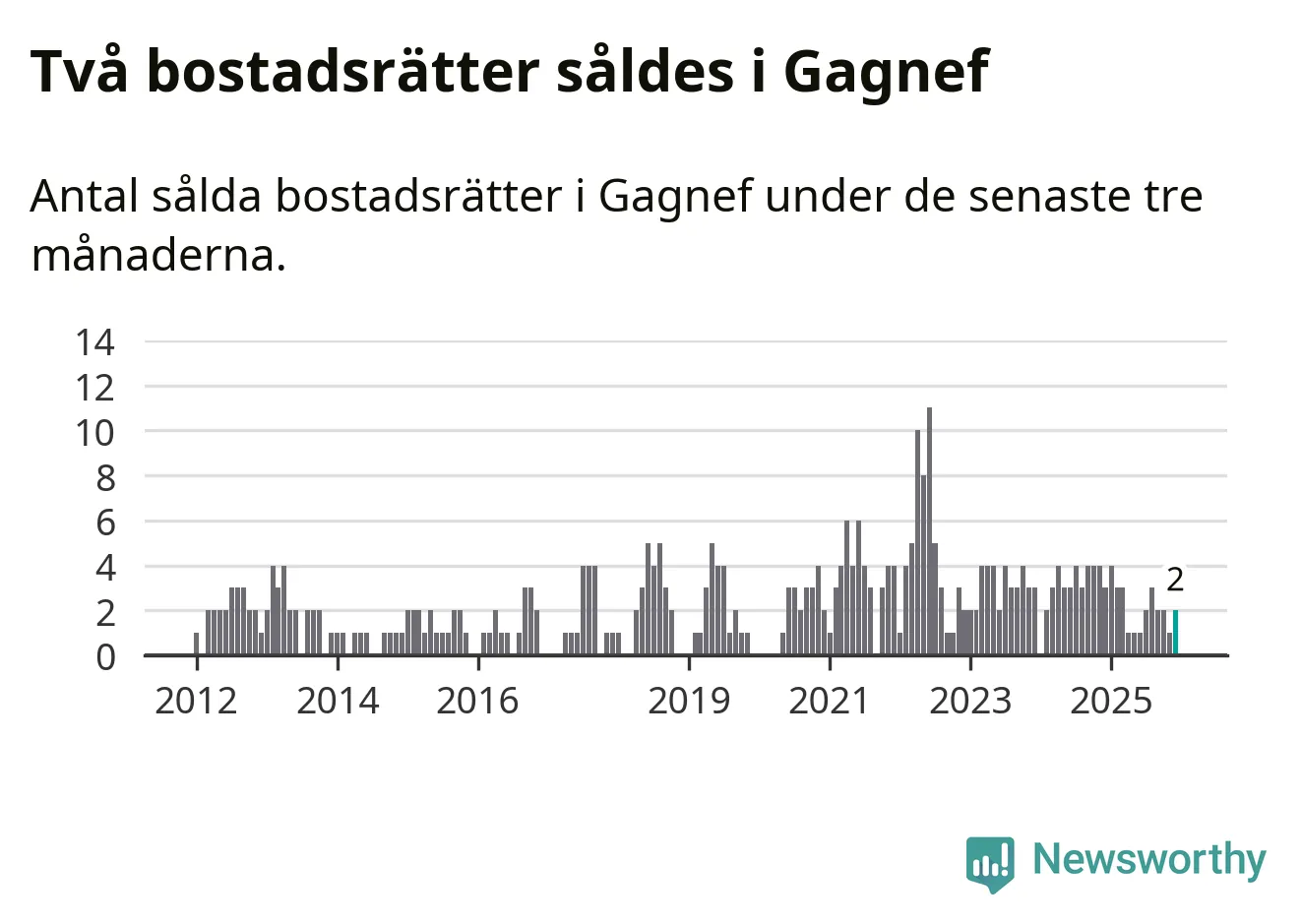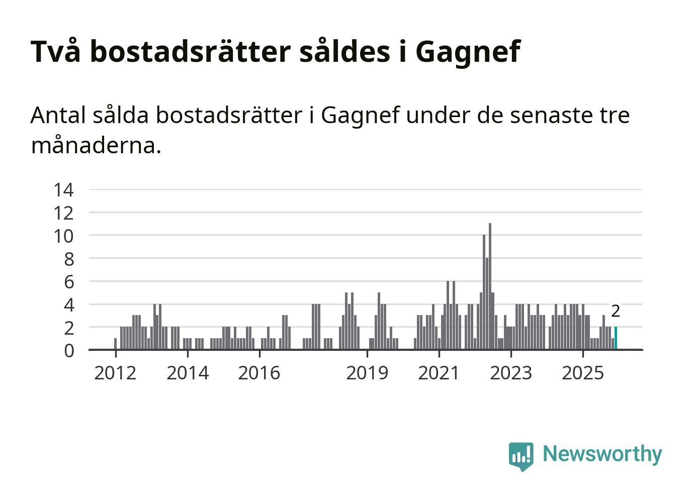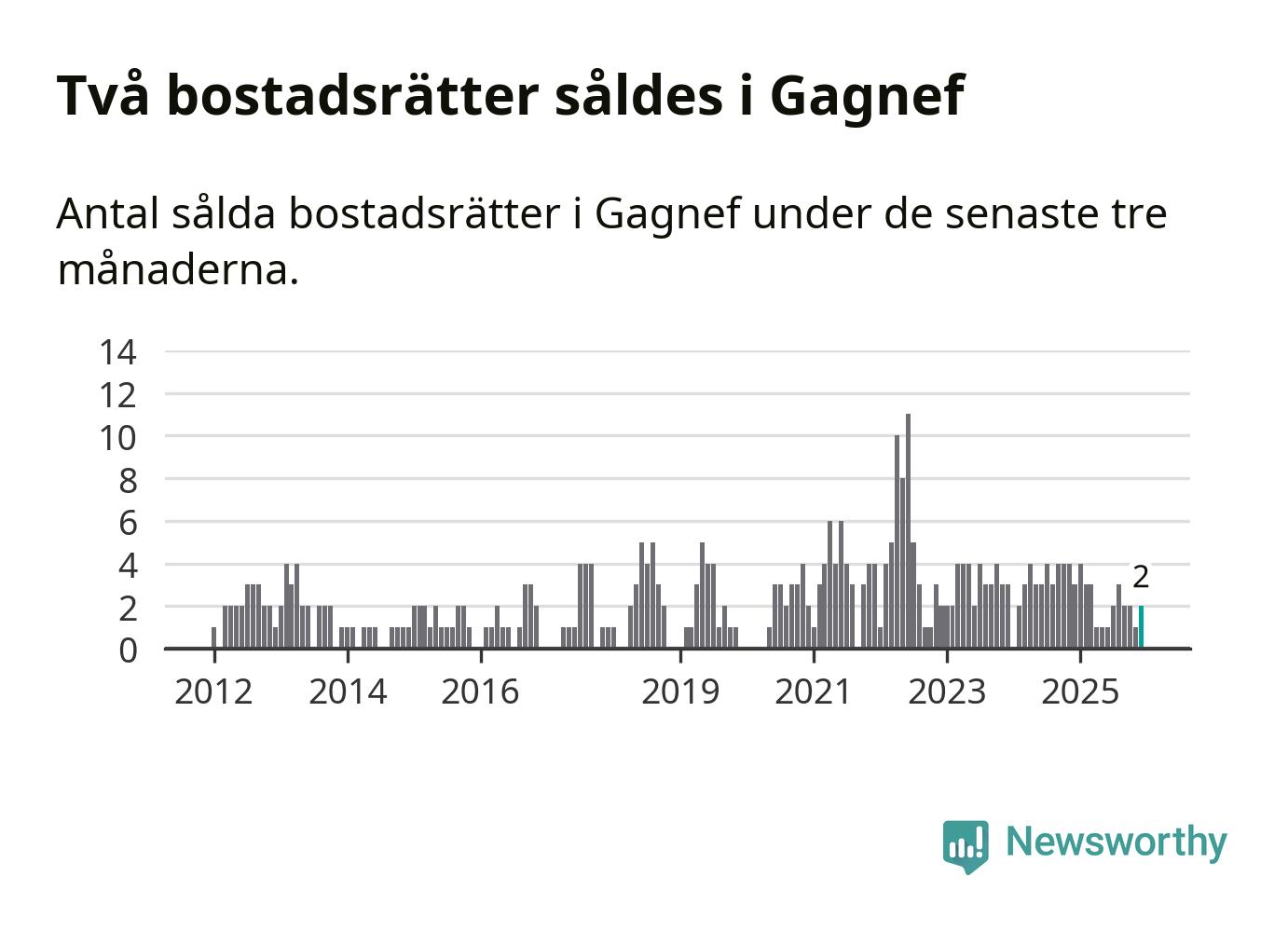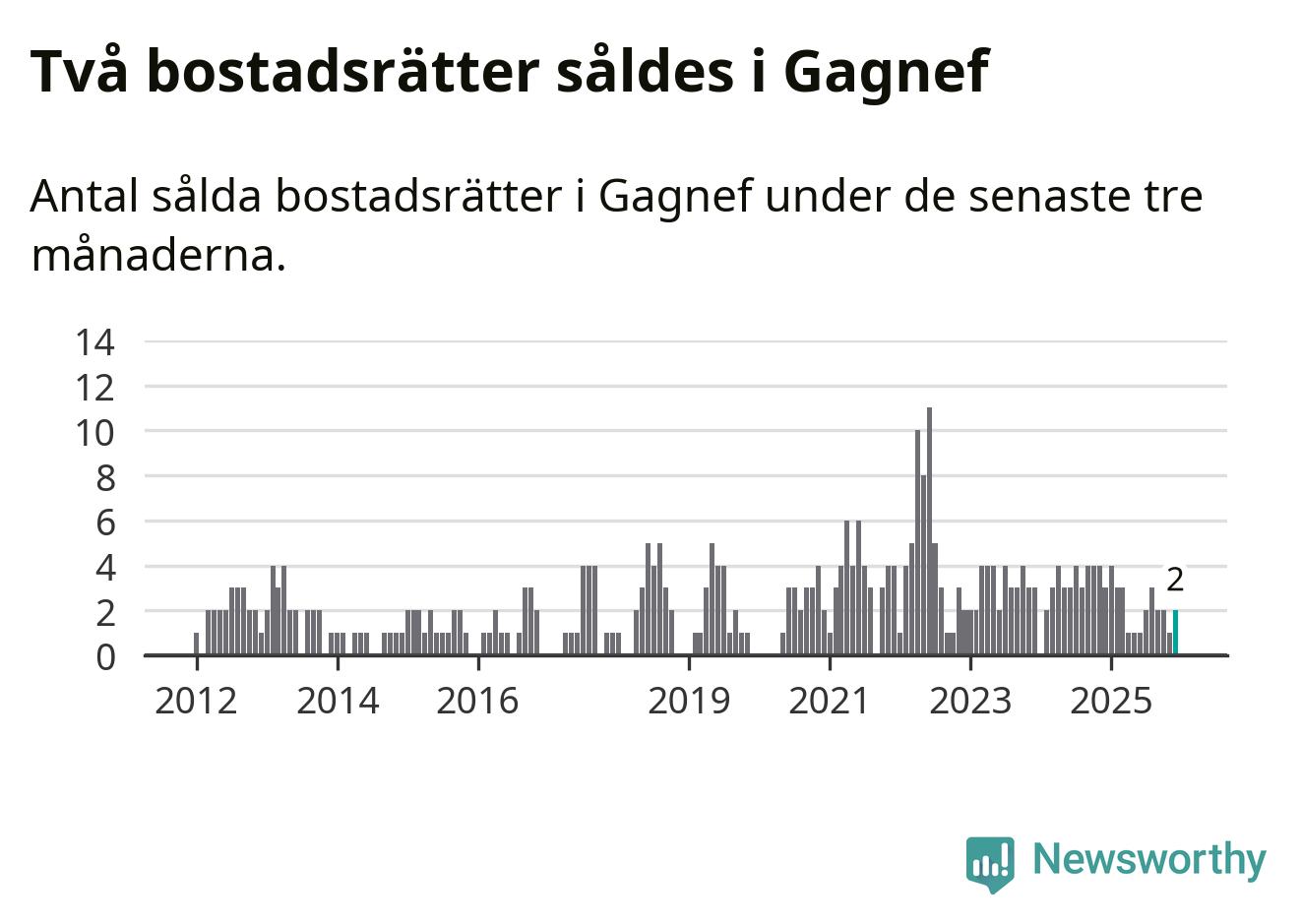 Mellan oktober och december gjordes sammanlagt två affärer med bostadsrätter i Gagnefs kommun. Det kan jämföras med tre vid motsvarande tid i fjol.