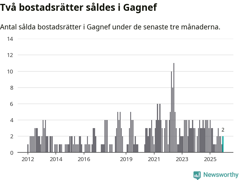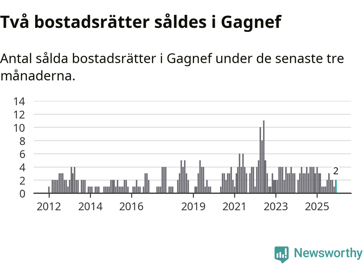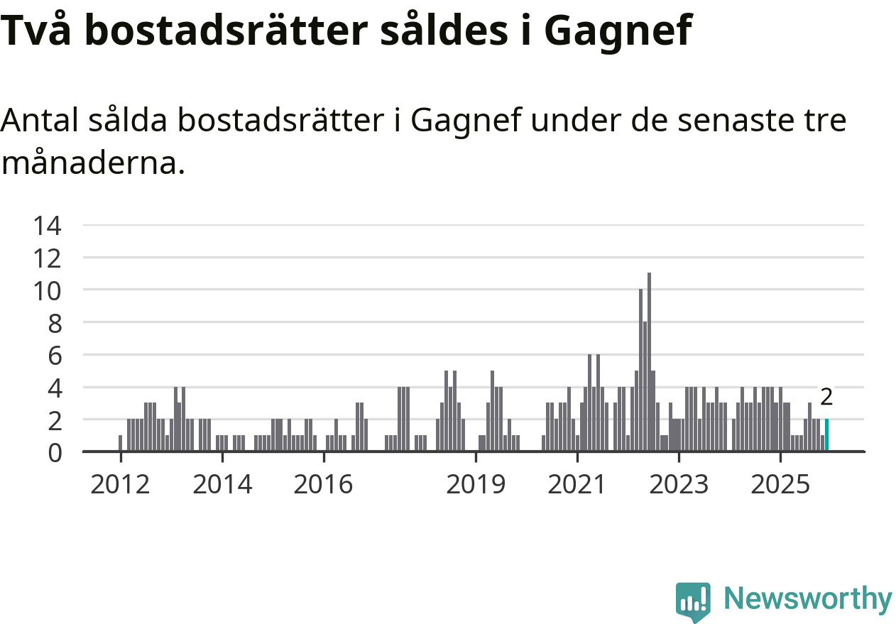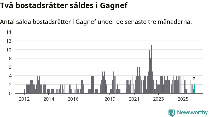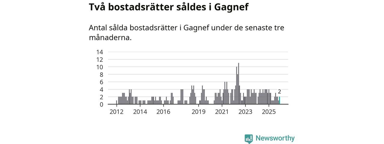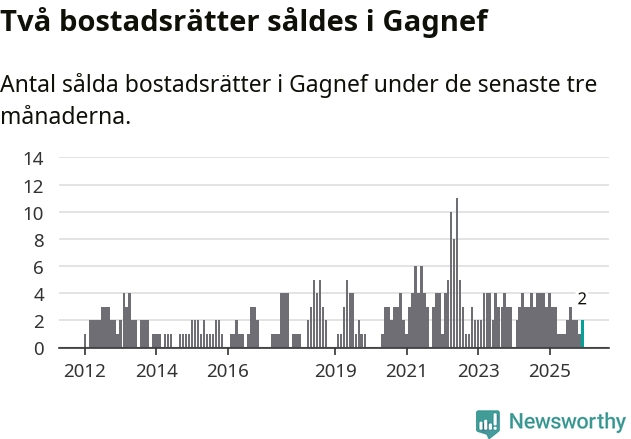 Mellan oktober och december gjordes sammanlagt två affärer med bostadsrätter i Gagnefs kommun. Det kan jämföras med tre vid motsvarande tid i fjol.