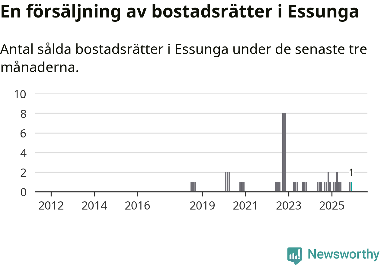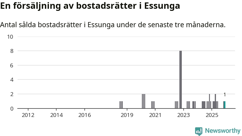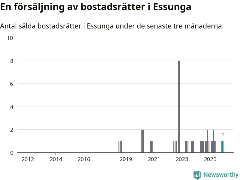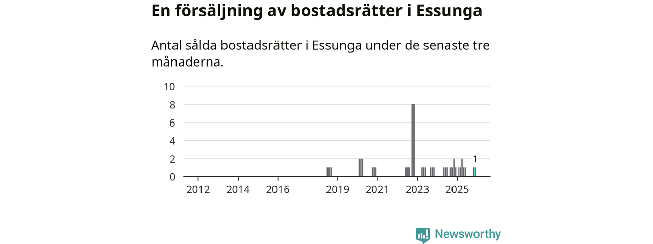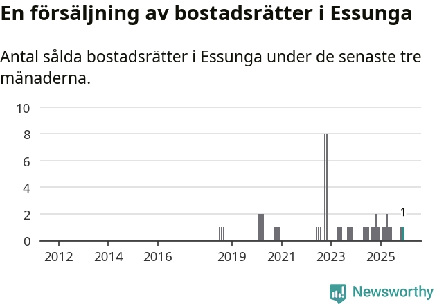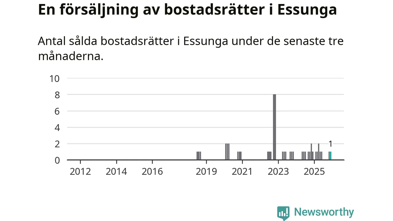 Mellan oktober och december gjordes sammanlagt en affär med bostadsrätter i Essunga kommun. Det är lika många affärer som vid motsvarande tid i fjol.
