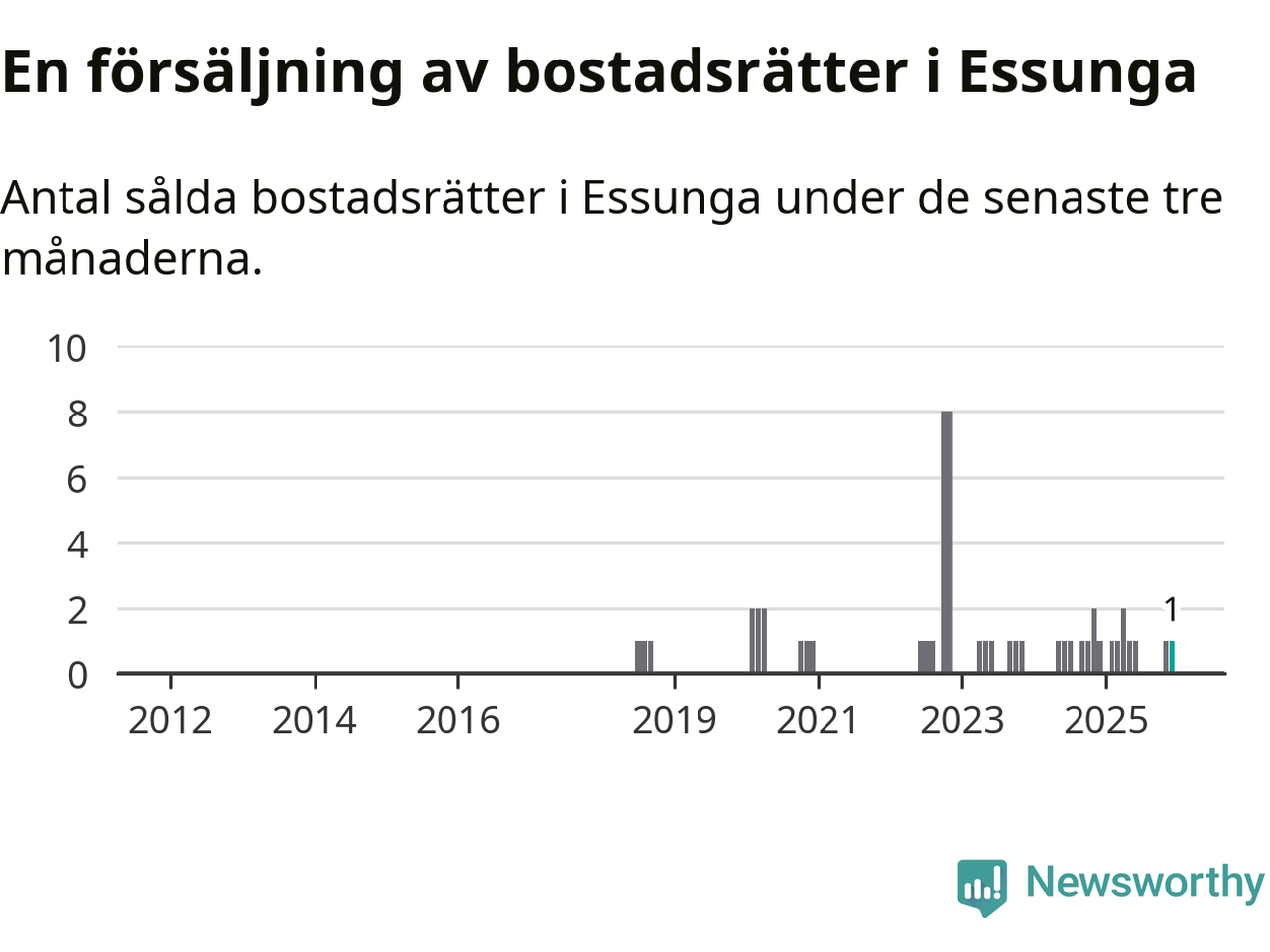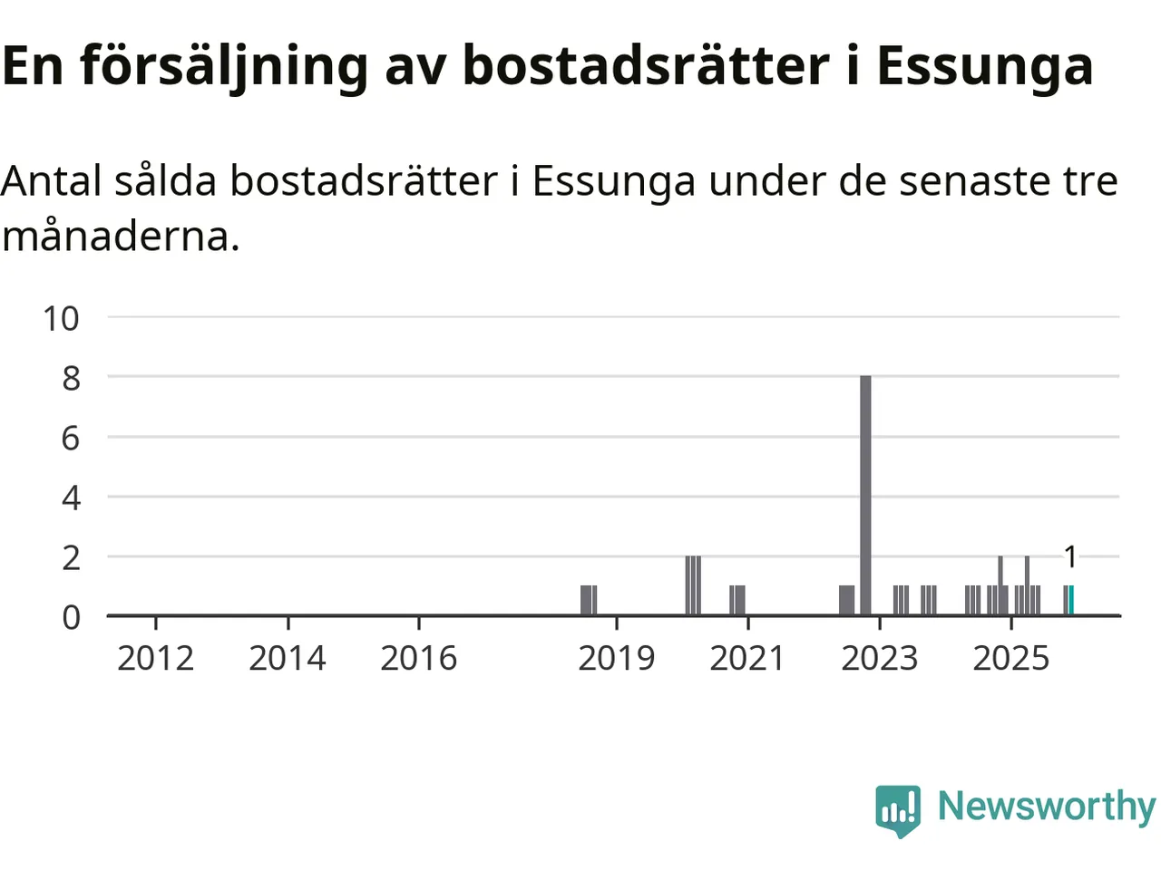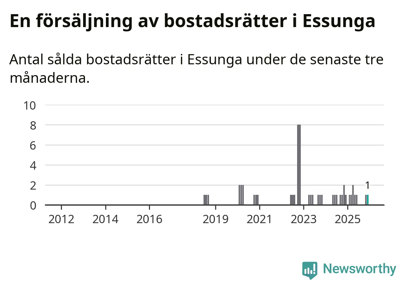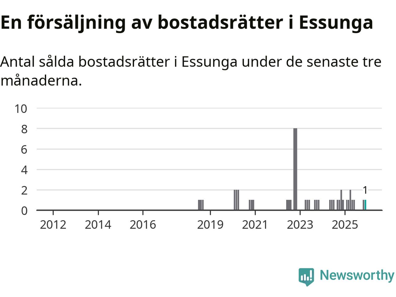 Mellan oktober och december gjordes sammanlagt en affär med bostadsrätter i Essunga kommun. Det är lika många affärer som vid motsvarande tid i fjol.