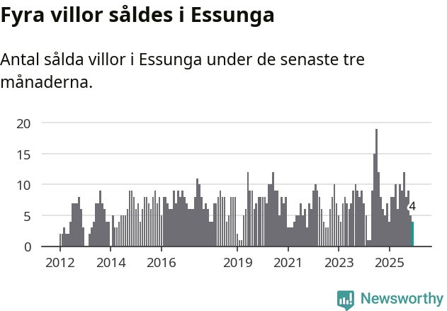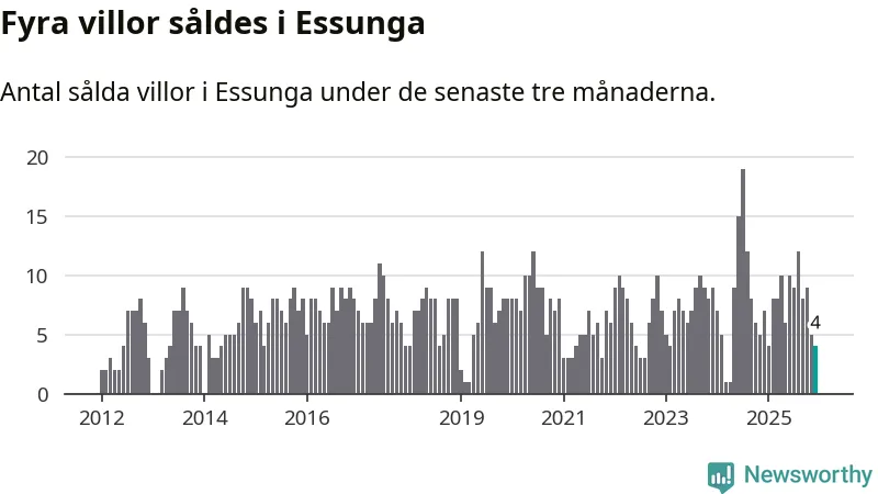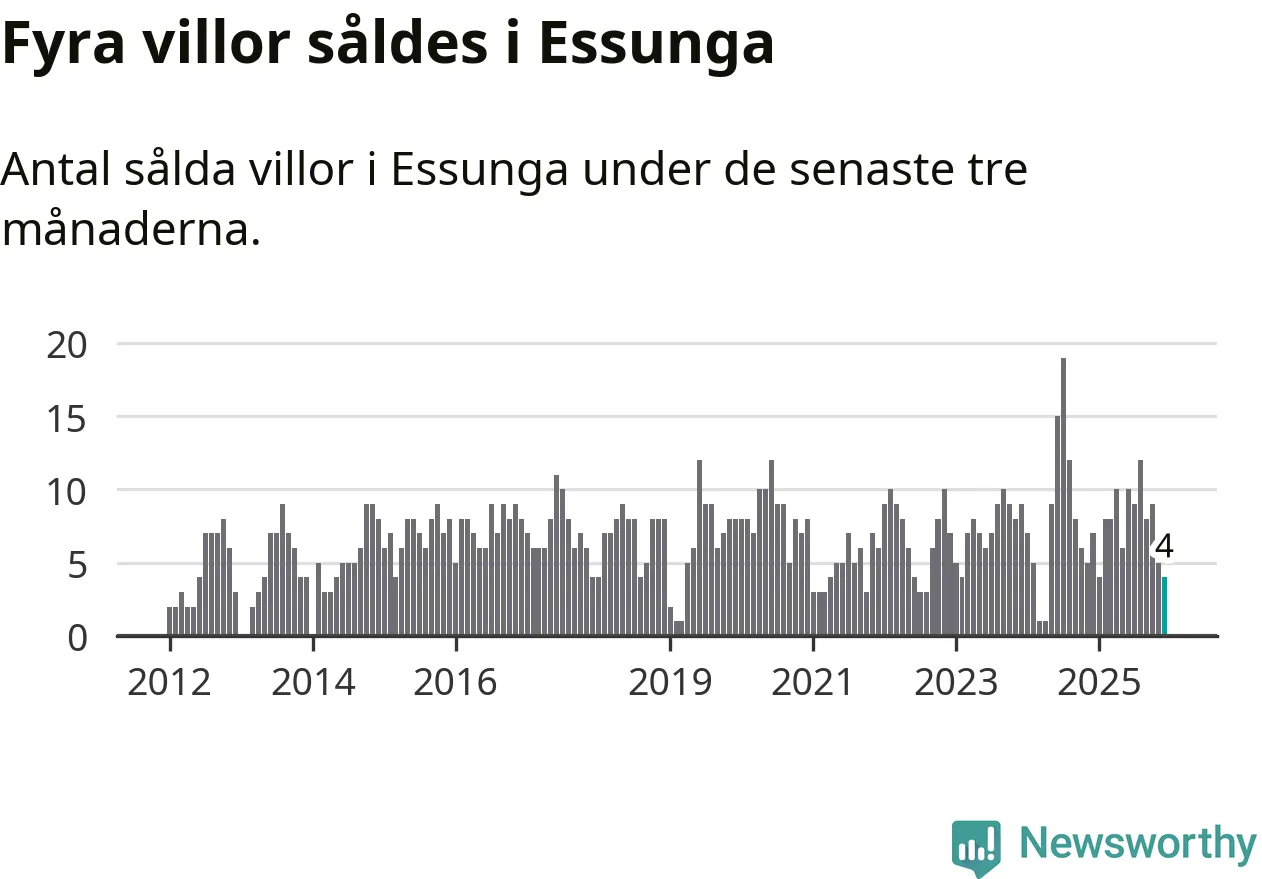 Mellan oktober och december gjordes sammanlagt fyra affärer med villor i Essunga kommun. Det kan jämföras med sju vid motsvarande tid i fjol.
