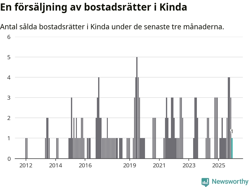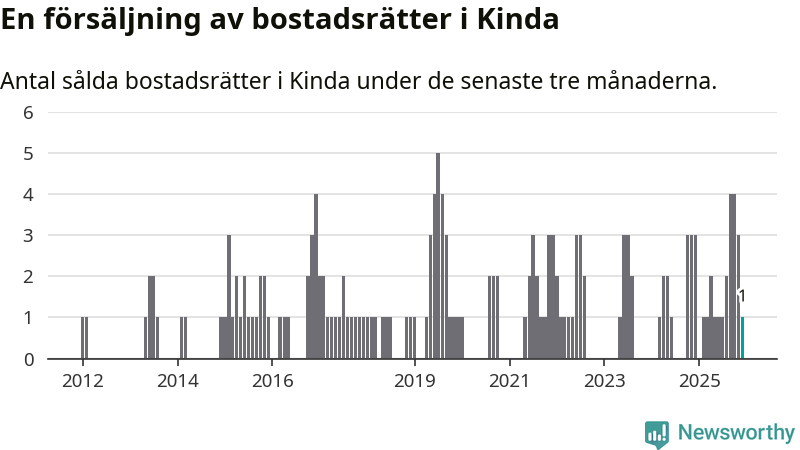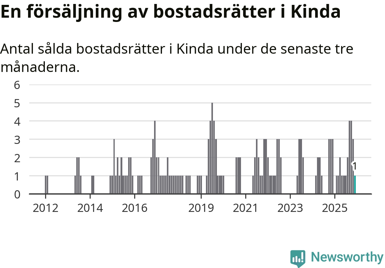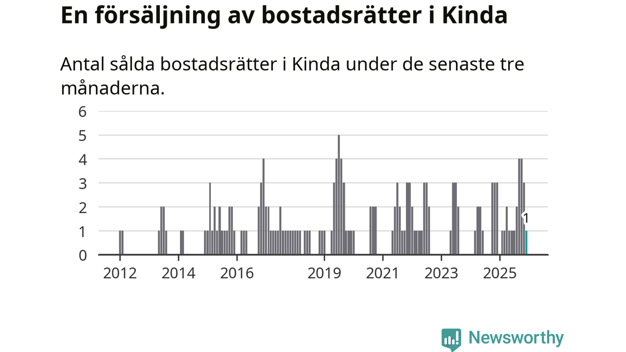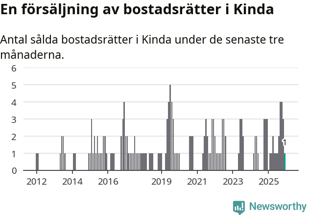 Mellan oktober och december gjordes sammanlagt en affär med bostadsrätter i Kinda kommun. Det kan jämföras med tre vid motsvarande tid i fjol.