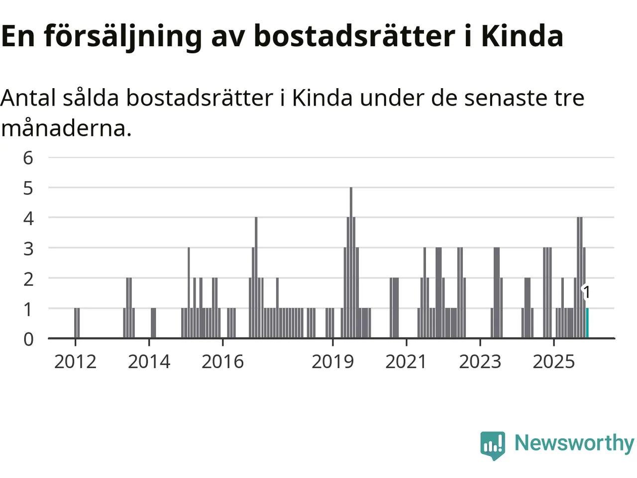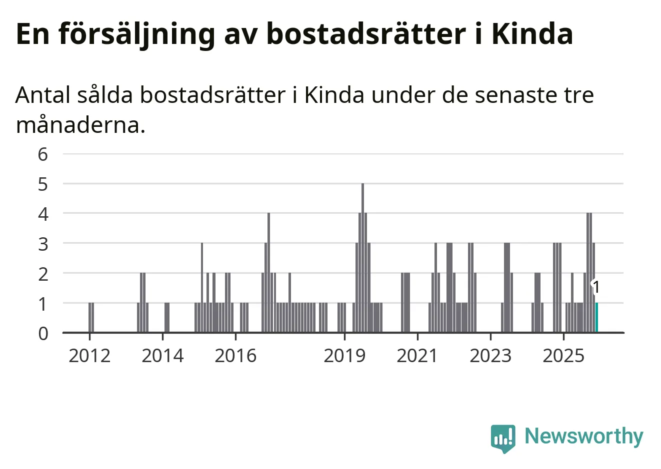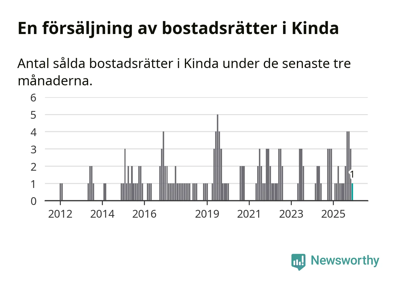 Mellan oktober och december gjordes sammanlagt en affär med bostadsrätter i Kinda kommun. Det kan jämföras med tre vid motsvarande tid i fjol.