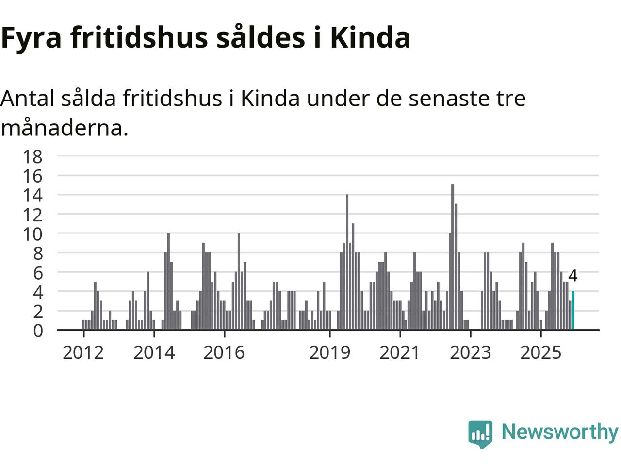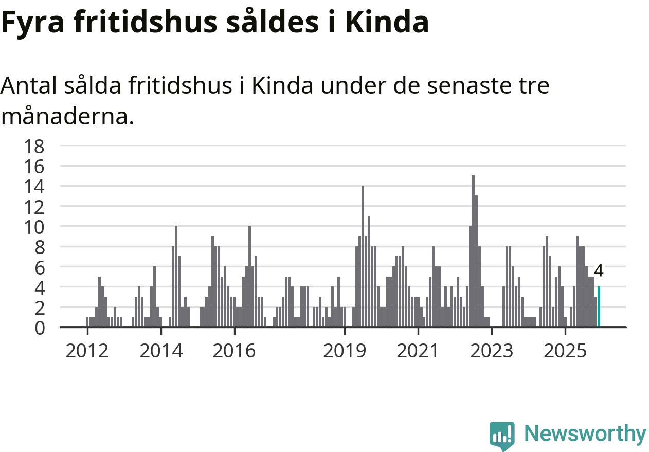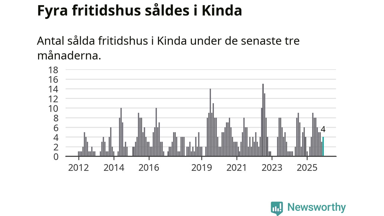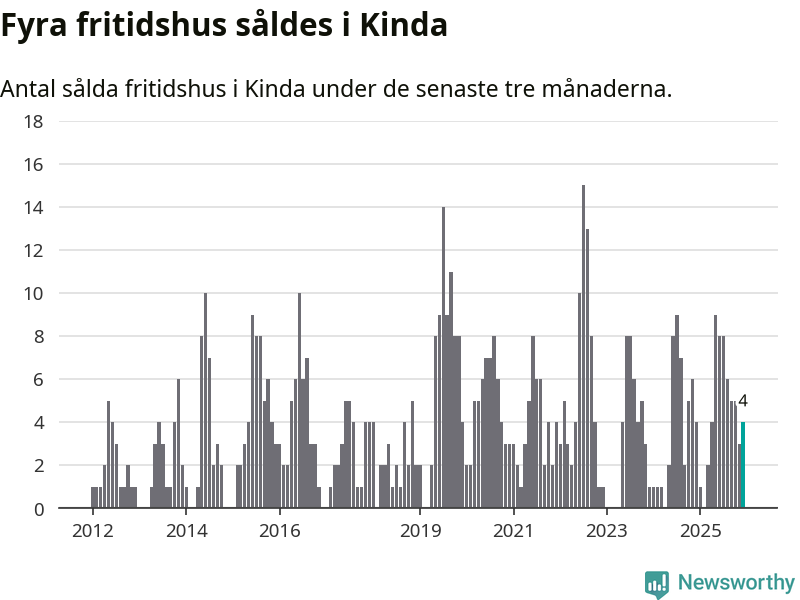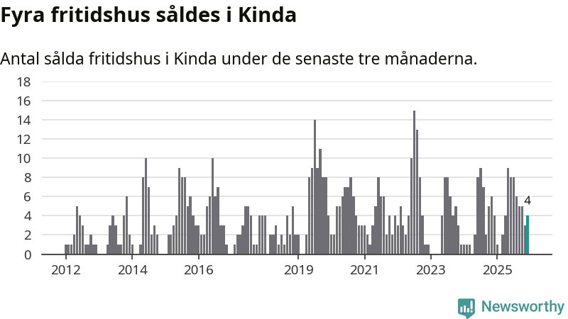 Mellan oktober och december gjordes sammanlagt fyra affärer med fritidshus i Kinda kommun. Det är lika många affärer som vid motsvarande tid i fjol.