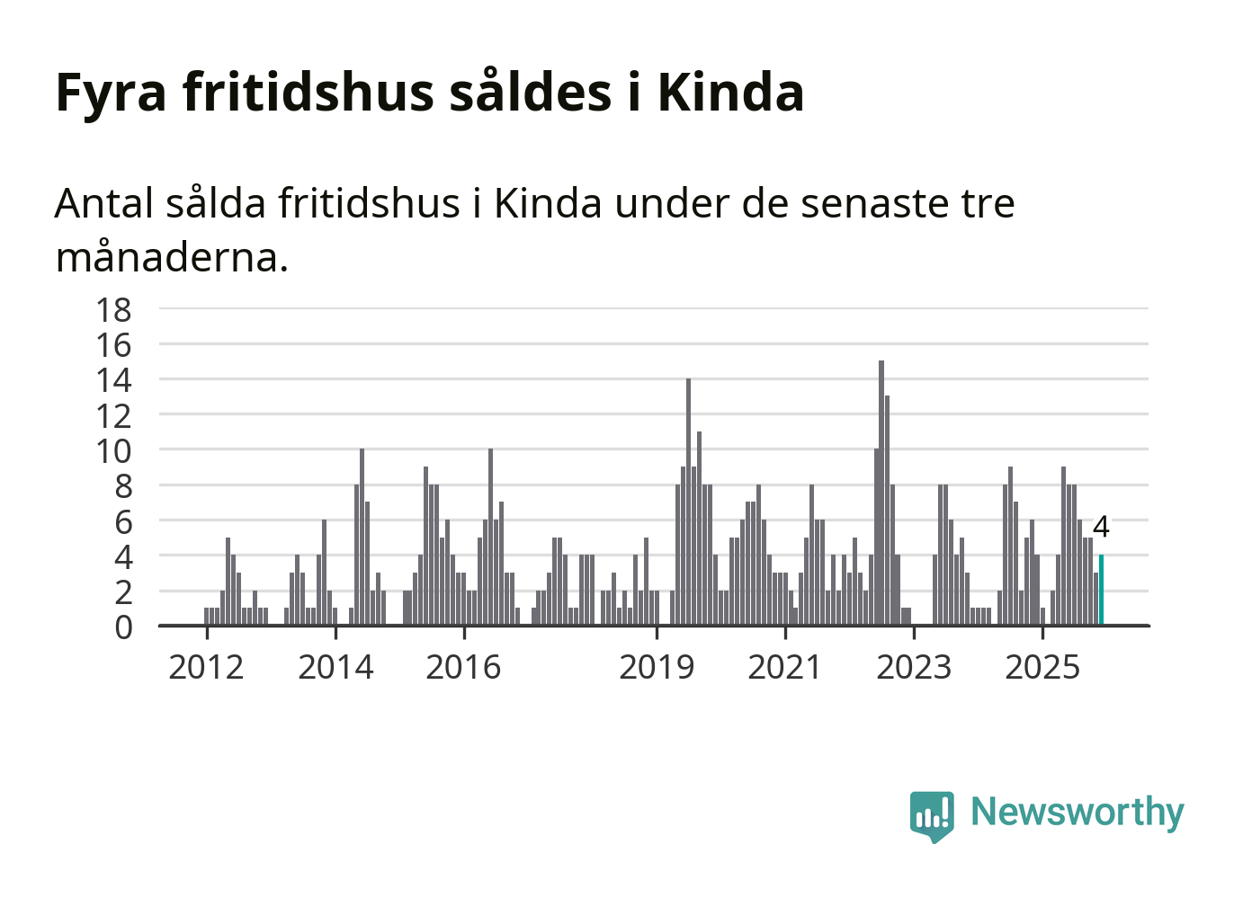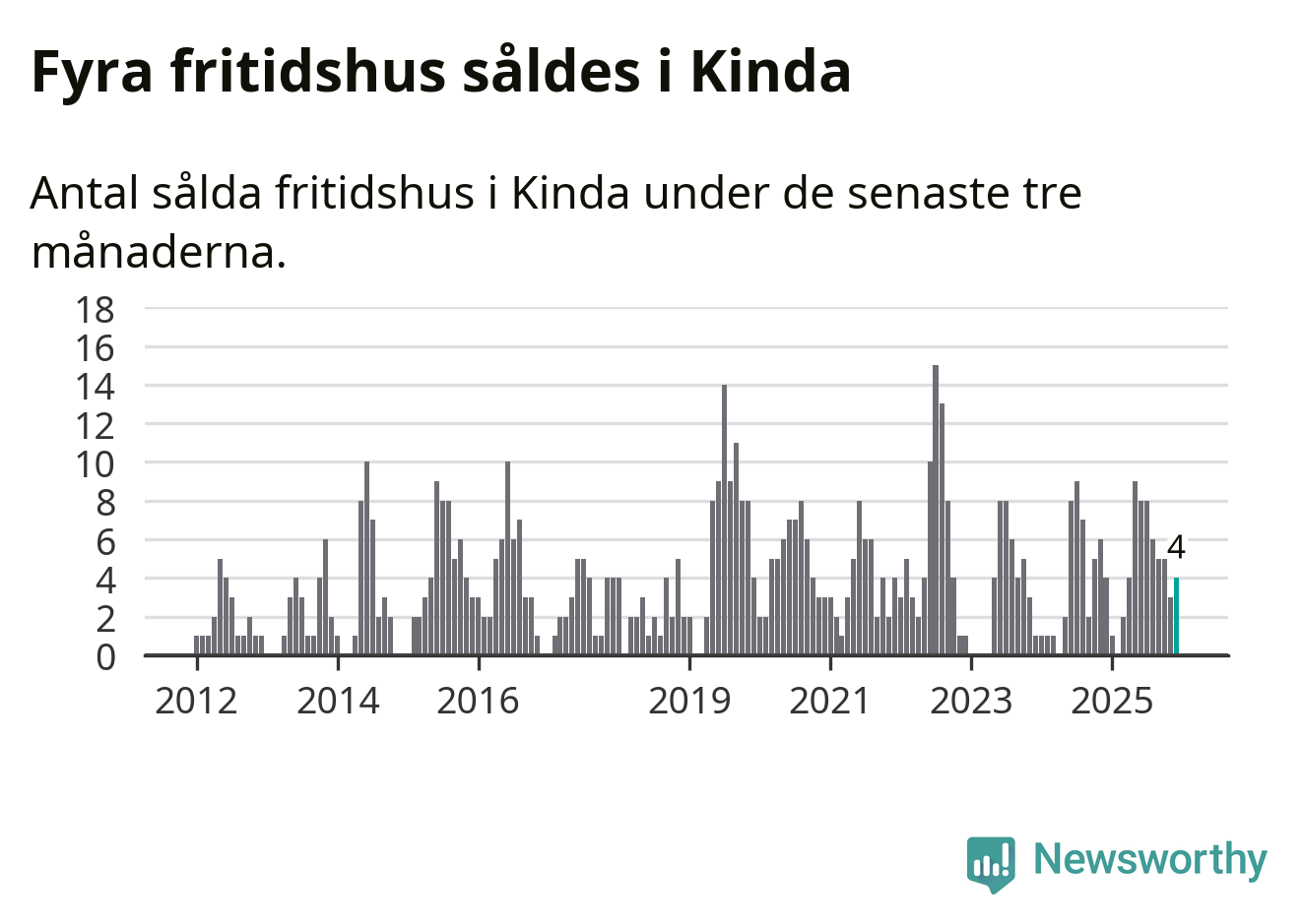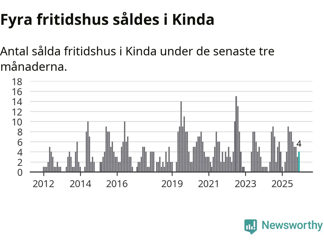 Mellan oktober och december gjordes sammanlagt fyra affärer med fritidshus i Kinda kommun. Det är lika många affärer som vid motsvarande tid i fjol.