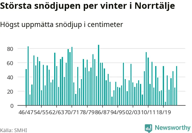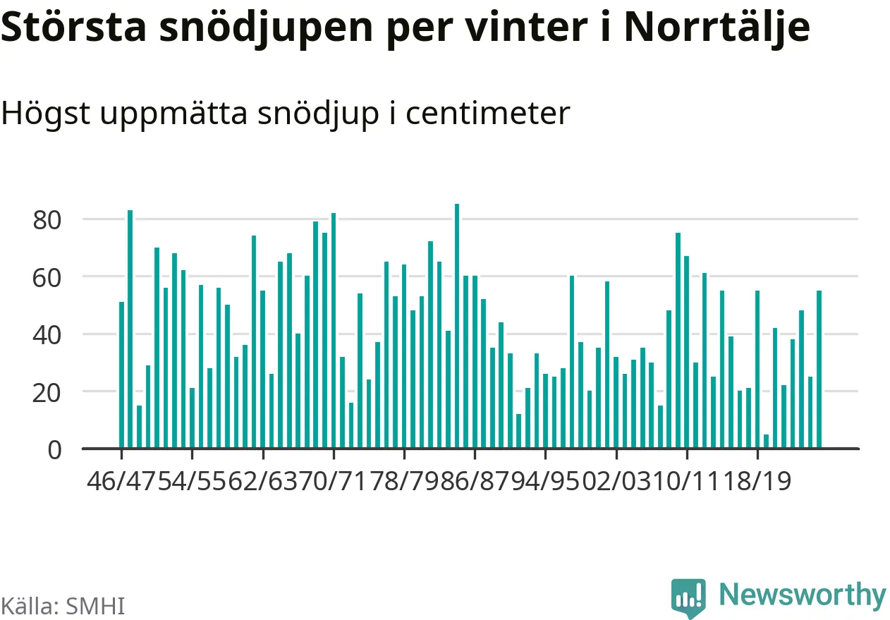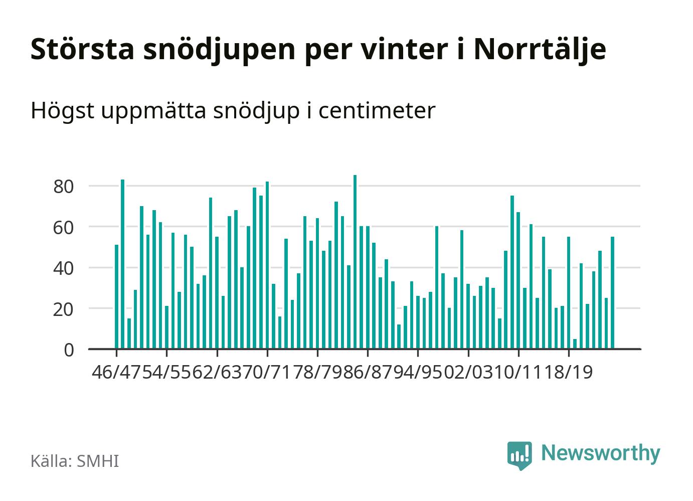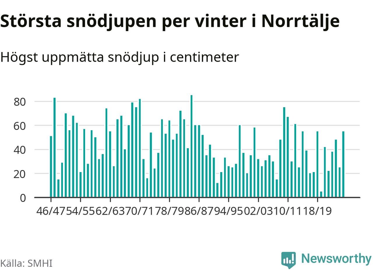 Men hur står sig det snödjupet historiskt sett? Newsworthy har tittat på det största snödjup som SMHI har uppmätt i Norrtälje kommun varje år sedan vintern 1946/47 – och hittills tar sig årets vinter inte in bland de 25 vintrarna med störst uppmätt snödjup i kommunen.