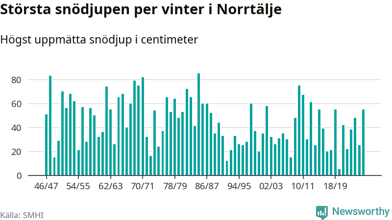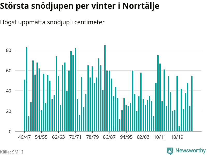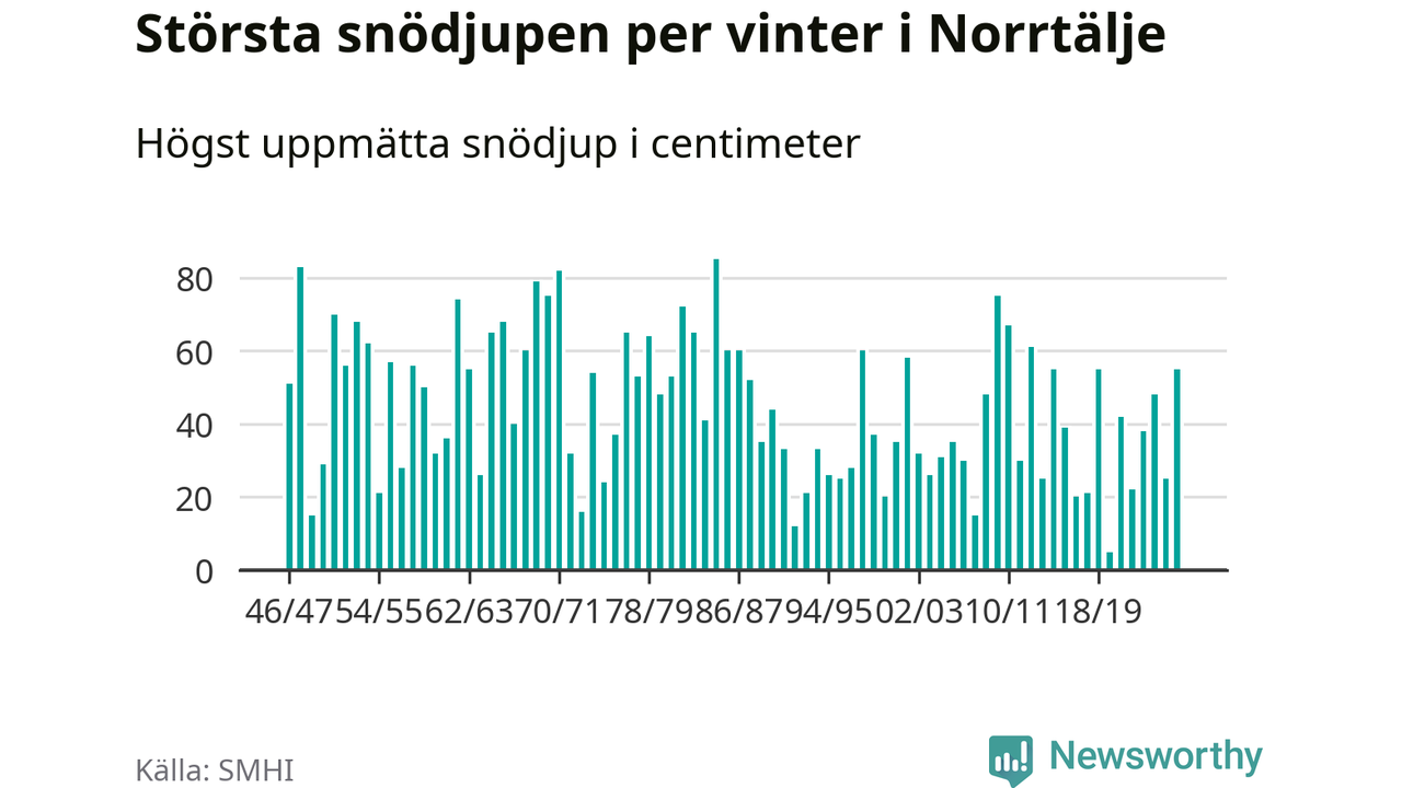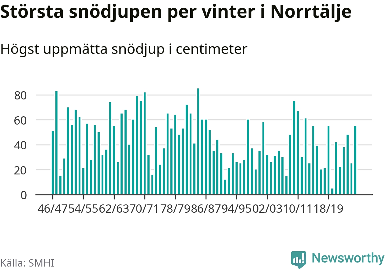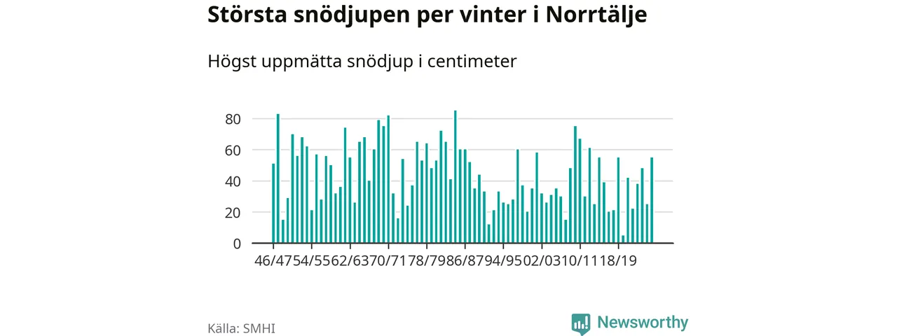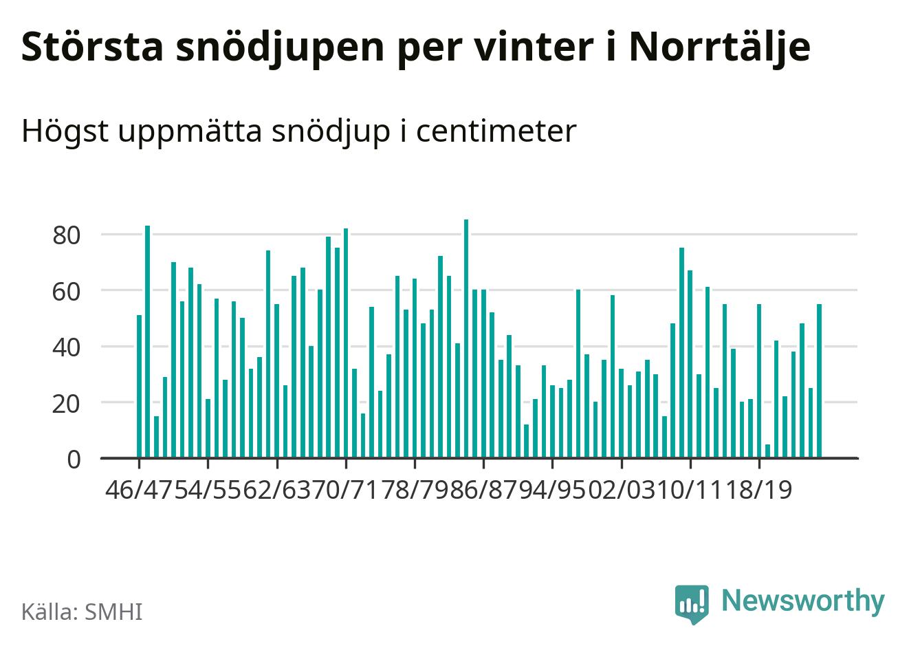 Men hur står sig det snödjupet historiskt sett? Newsworthy har tittat på det största snödjup som SMHI har uppmätt i Norrtälje kommun varje år sedan vintern 1946/47 – och hittills tar sig årets vinter inte in bland de 25 vintrarna med störst uppmätt snödjup i kommunen.