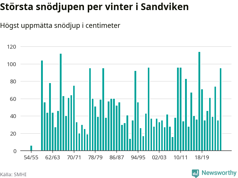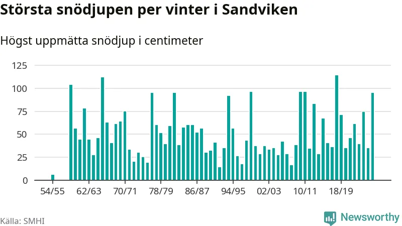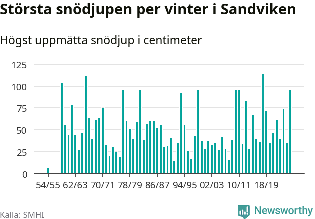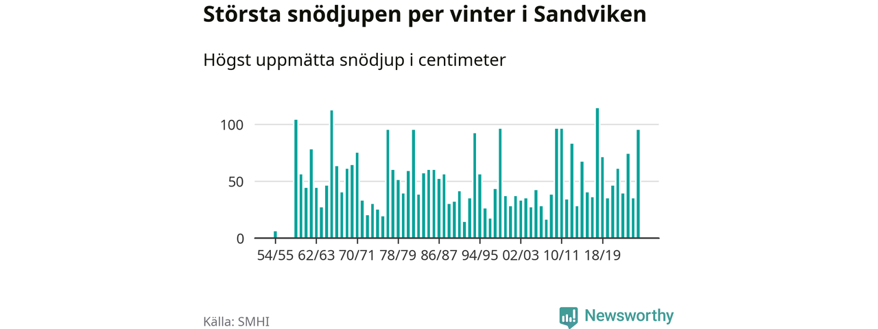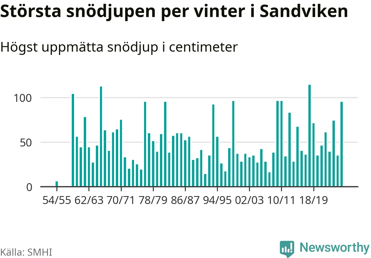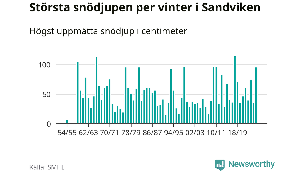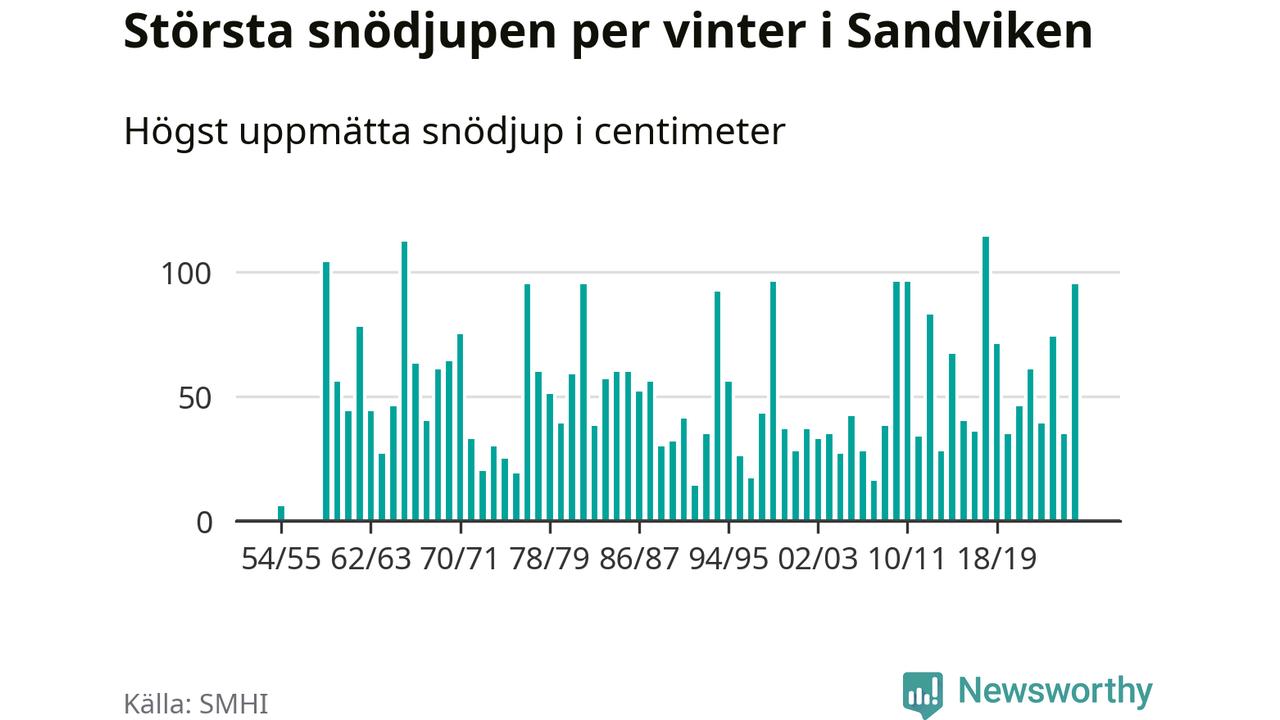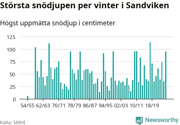 Men hur står sig det snödjupet historiskt sett? Newsworthy har tittat på det största snödjup som SMHI har uppmätt i Sandvikens kommun varje år sedan vintern 1954/55. Sex vintrar har det uppmätts större snödjup. Det ska sägas att det inte finns några noteringar för åren 1956–1958.