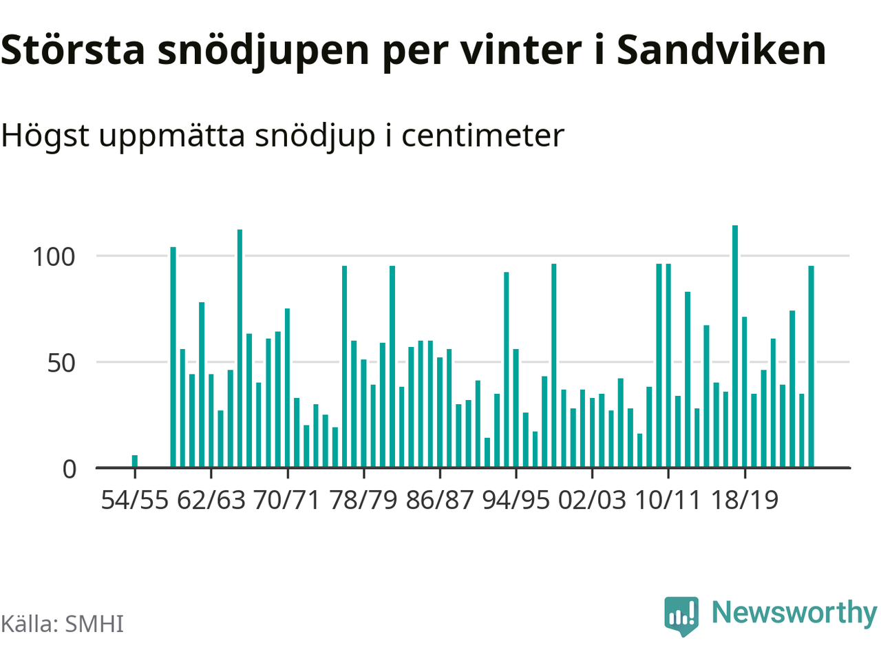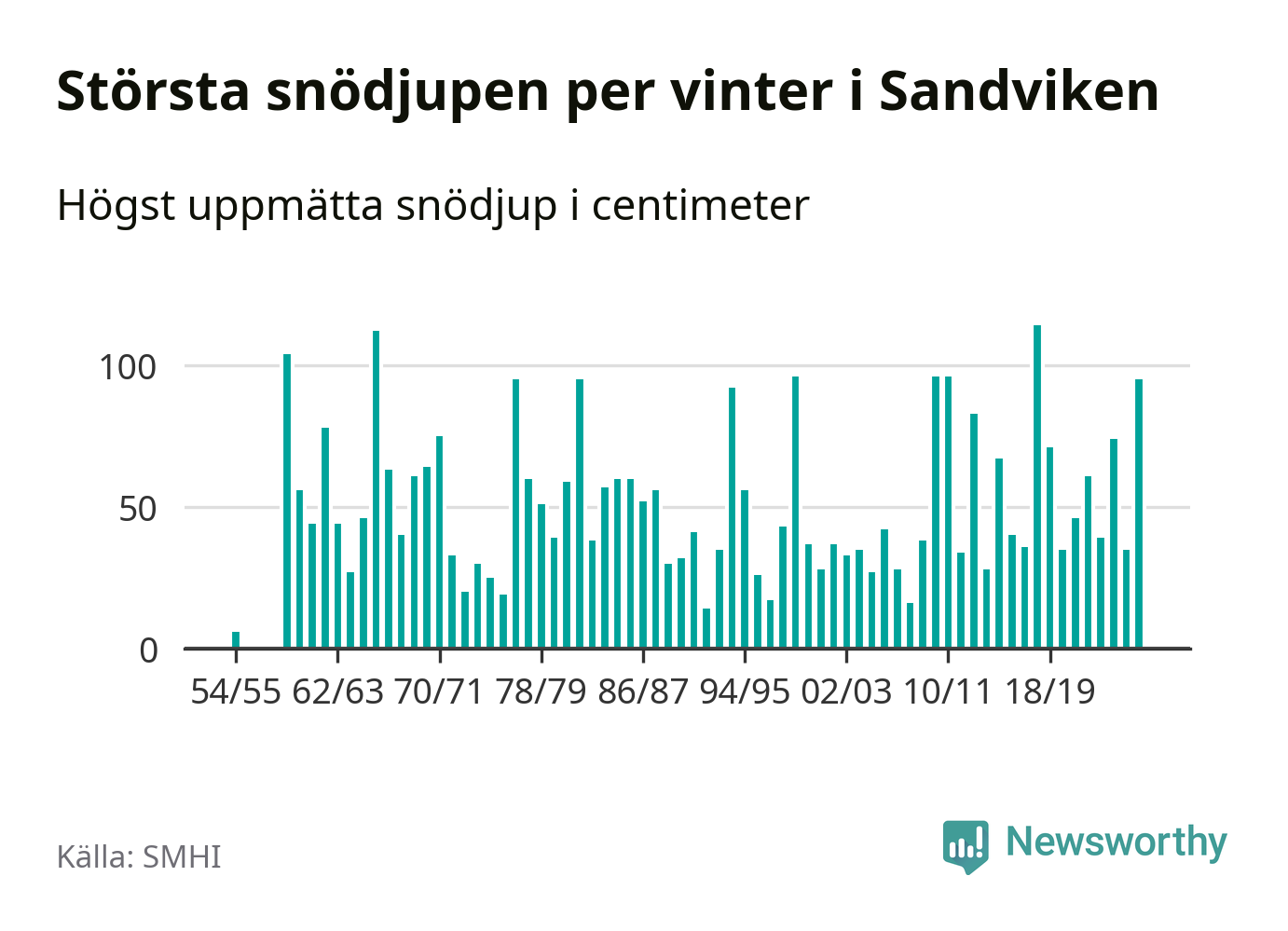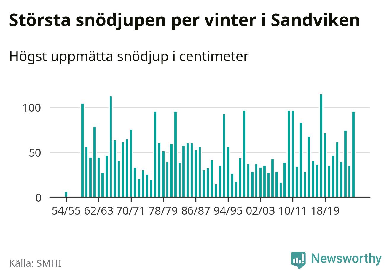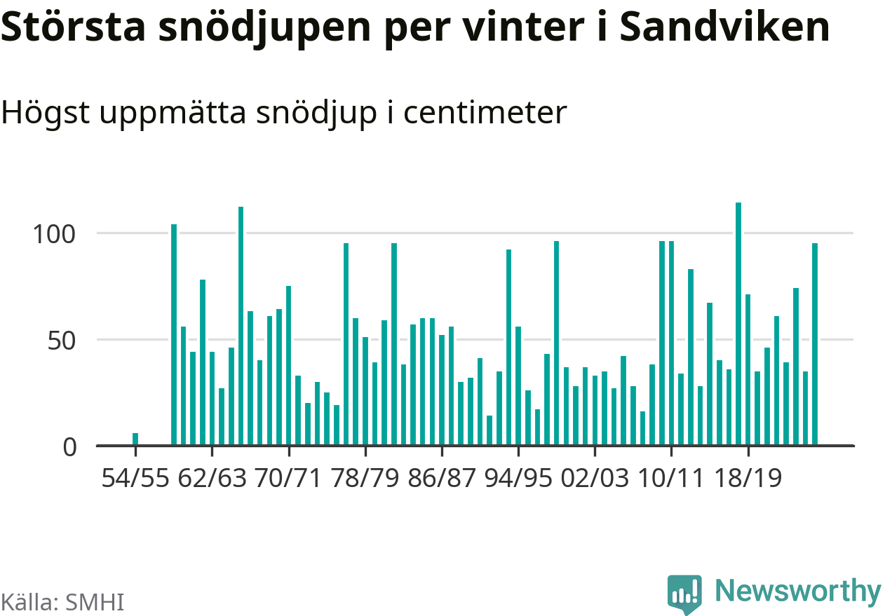 Men hur står sig det snödjupet historiskt sett? Newsworthy har tittat på det största snödjup som SMHI har uppmätt i Sandvikens kommun varje år sedan vintern 1954/55. Sex vintrar har det uppmätts större snödjup. Det ska sägas att det inte finns några noteringar för åren 1956–1958.